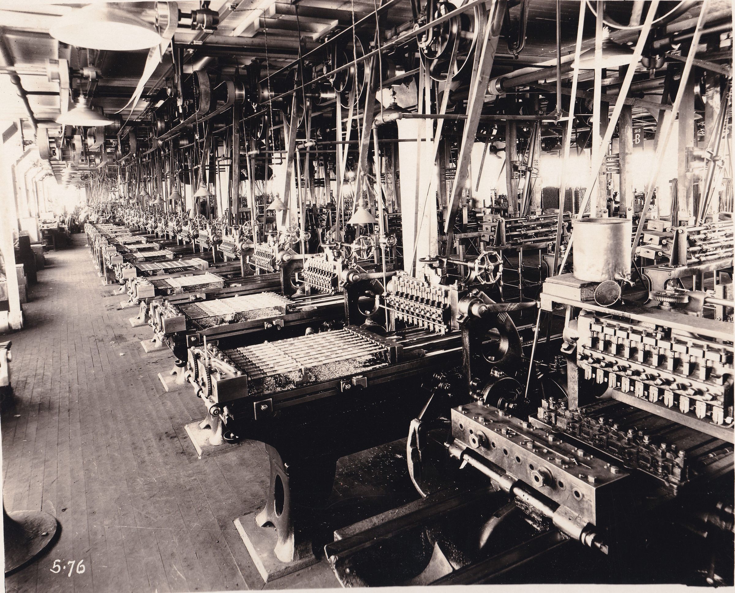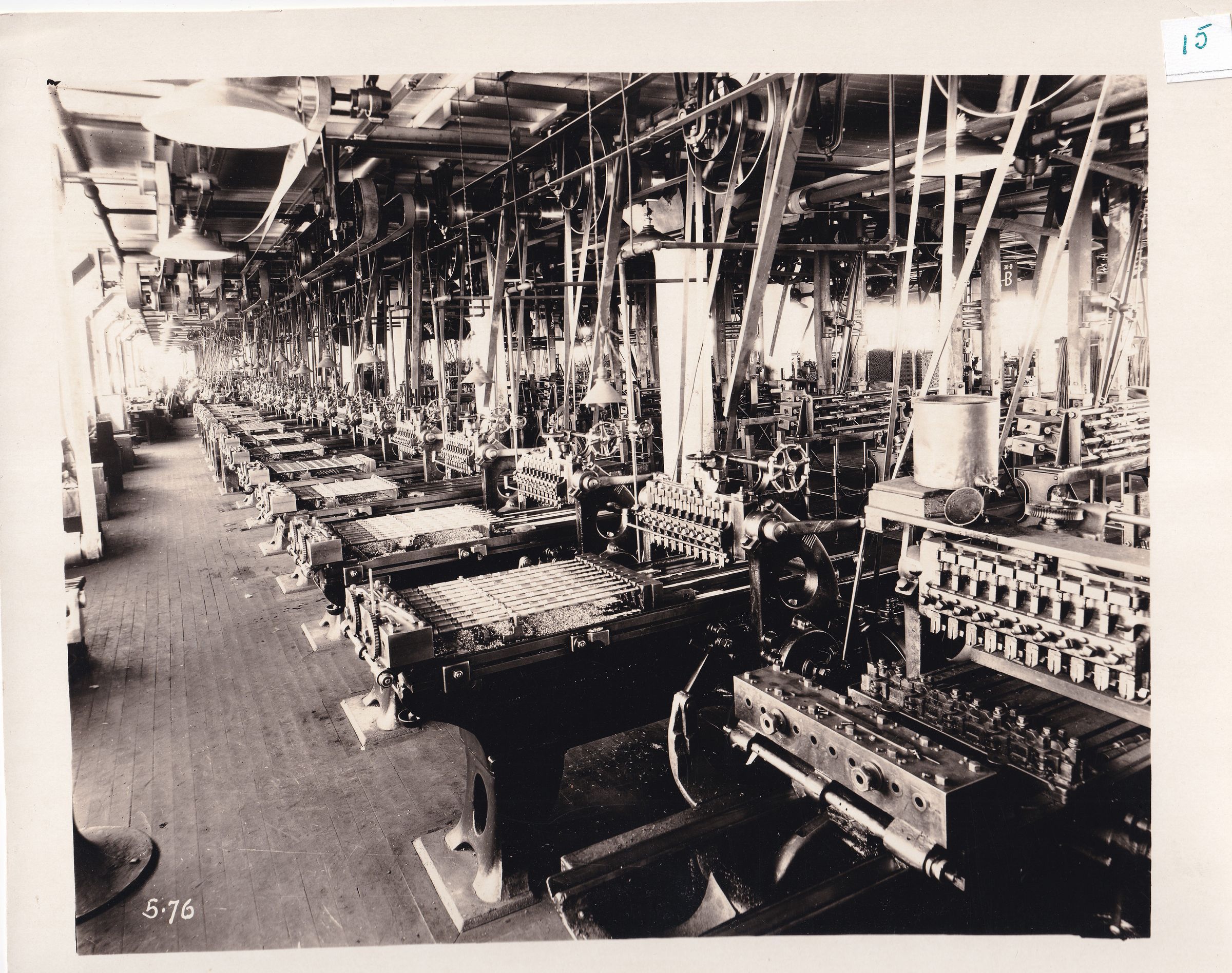 A row of machines that cut the grooves in the steel rolls, probably most of them for one order on a particular machine, ten at a time.Made/Created