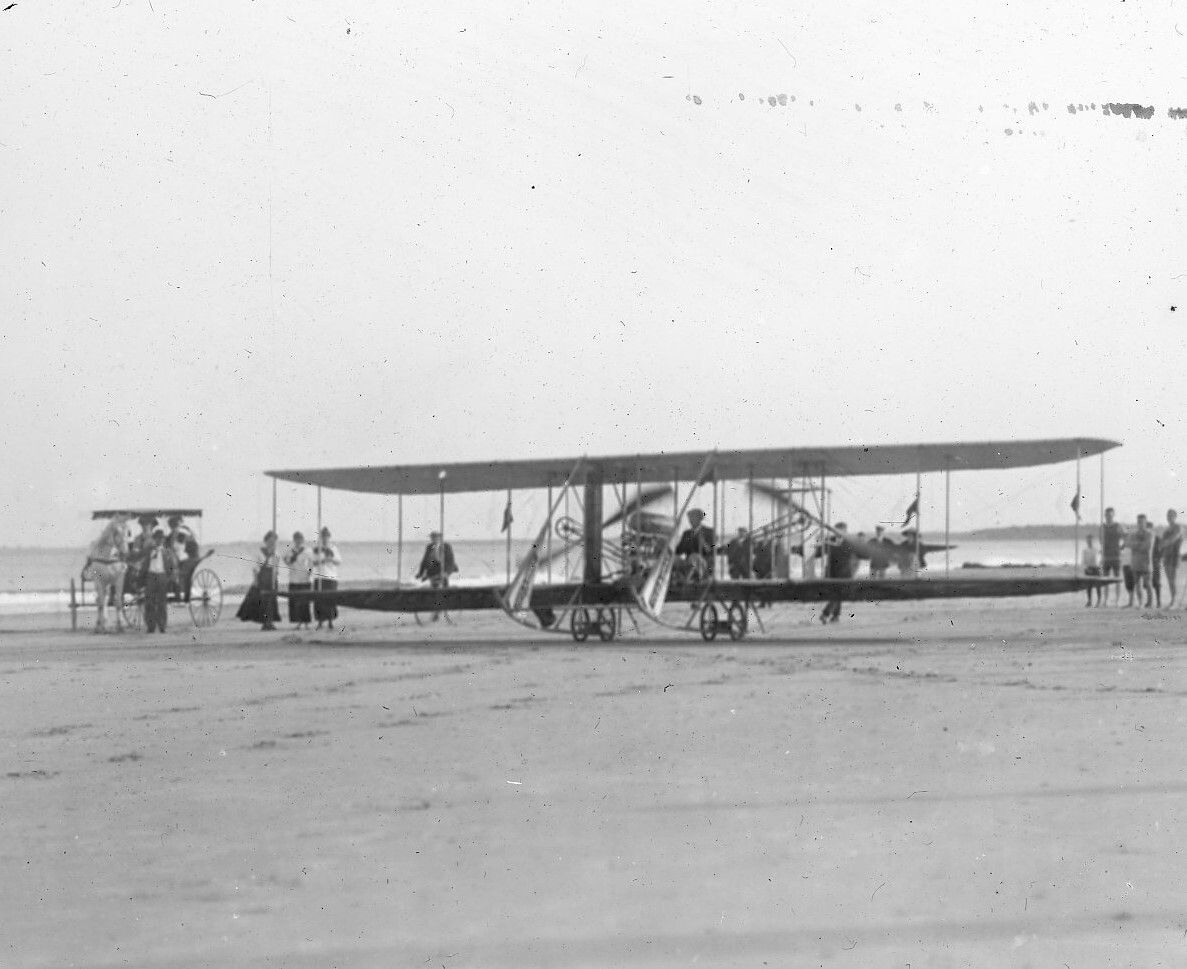Glass lantern slide of a biplane at Old Orchard Beach, with a crowd looking on. "Biplane on OOB" is written on the label on the slide.
