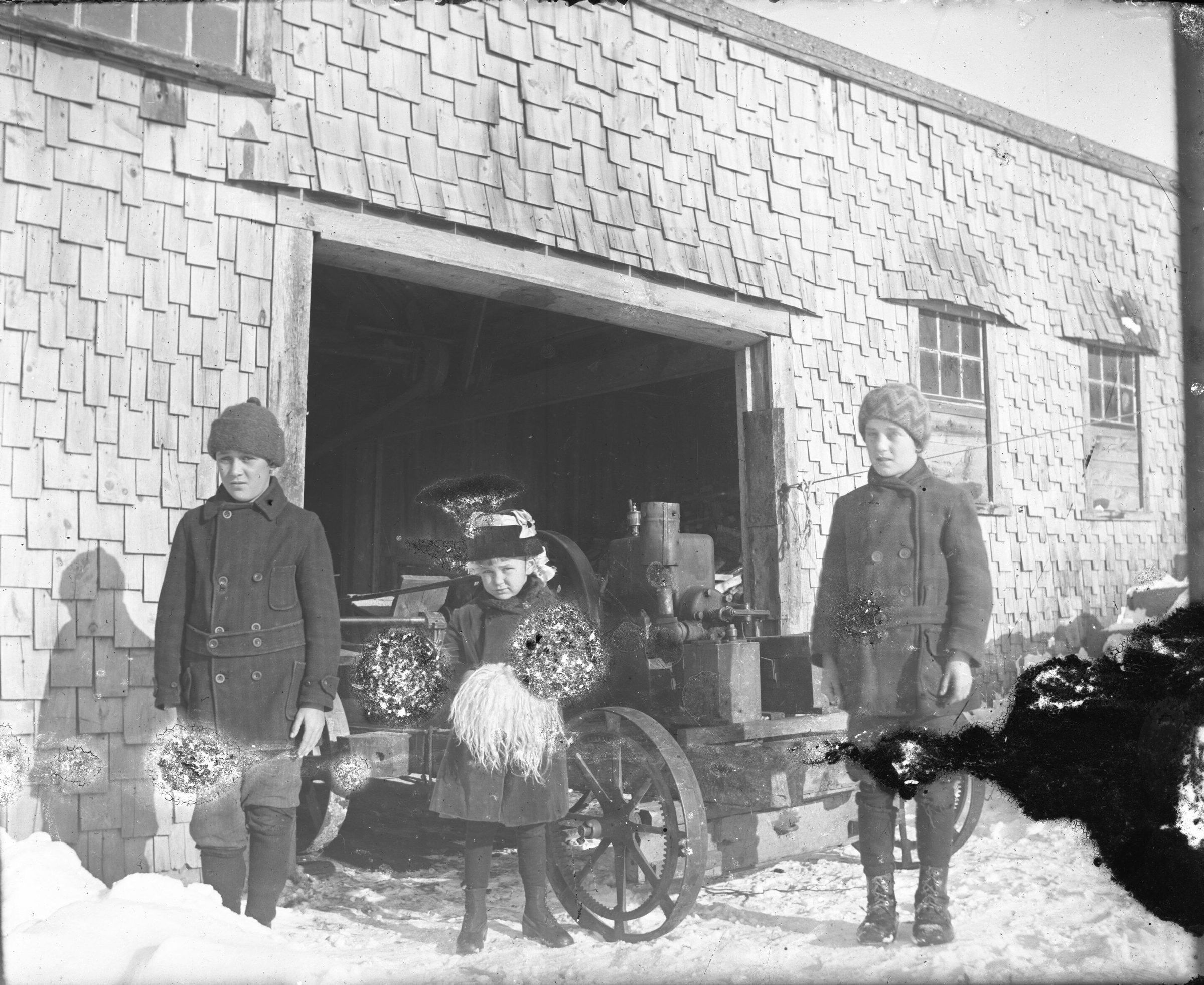 Glass plate negative photo of three Hobbs children. From left to right: L-R Elmer Lesco Hobbs, Gladys Arlene Hobbs, Raymond Milton Hobbs standing in front of Rufus Milton Hobbs' homemade sawmill at 79 Watson Mill Road, Saco.