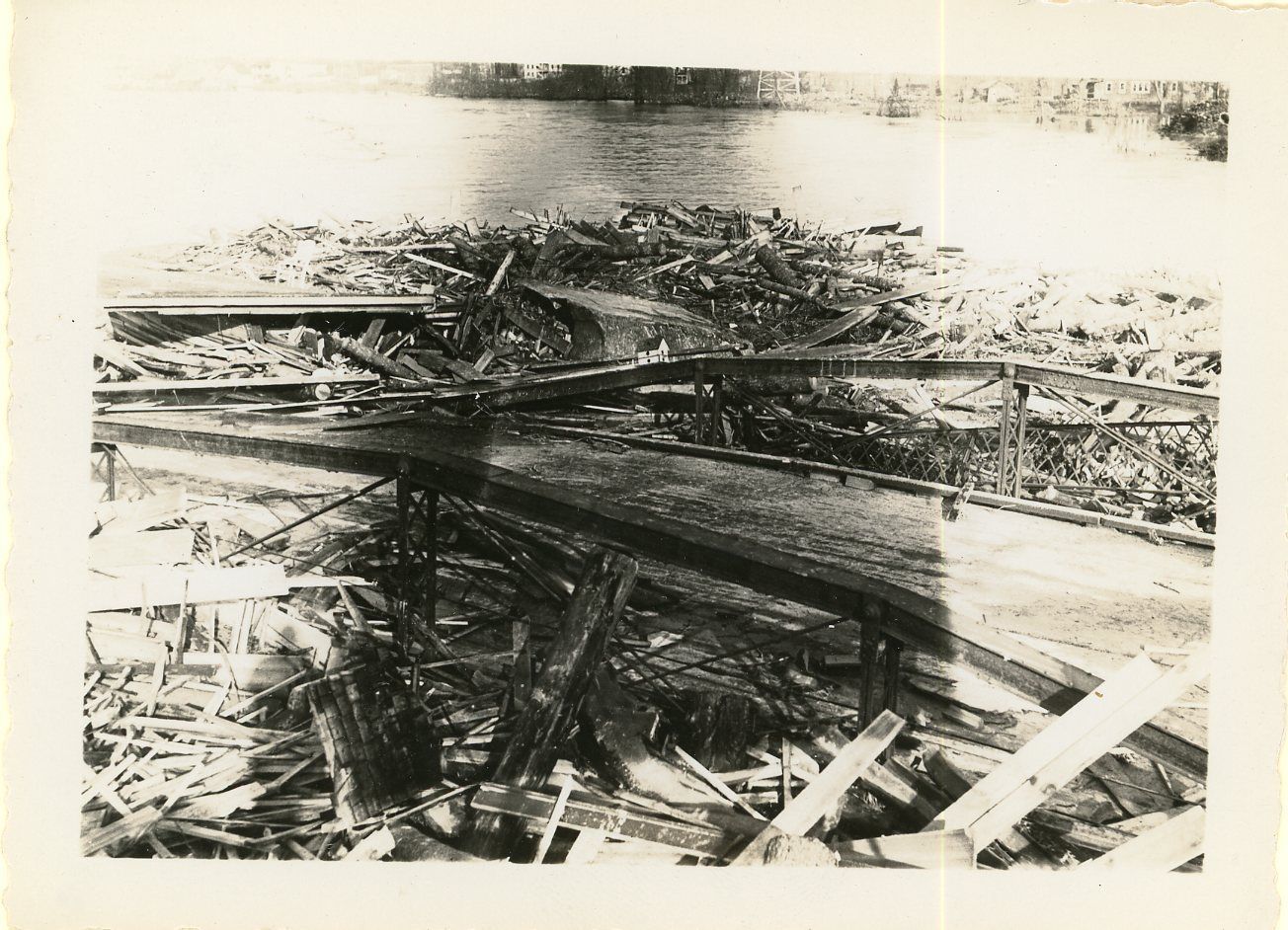 Black and white print photograph of Saco River flood damage. From the Sawyer House Collection.