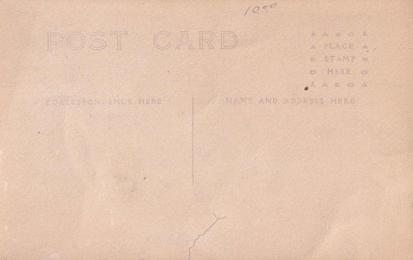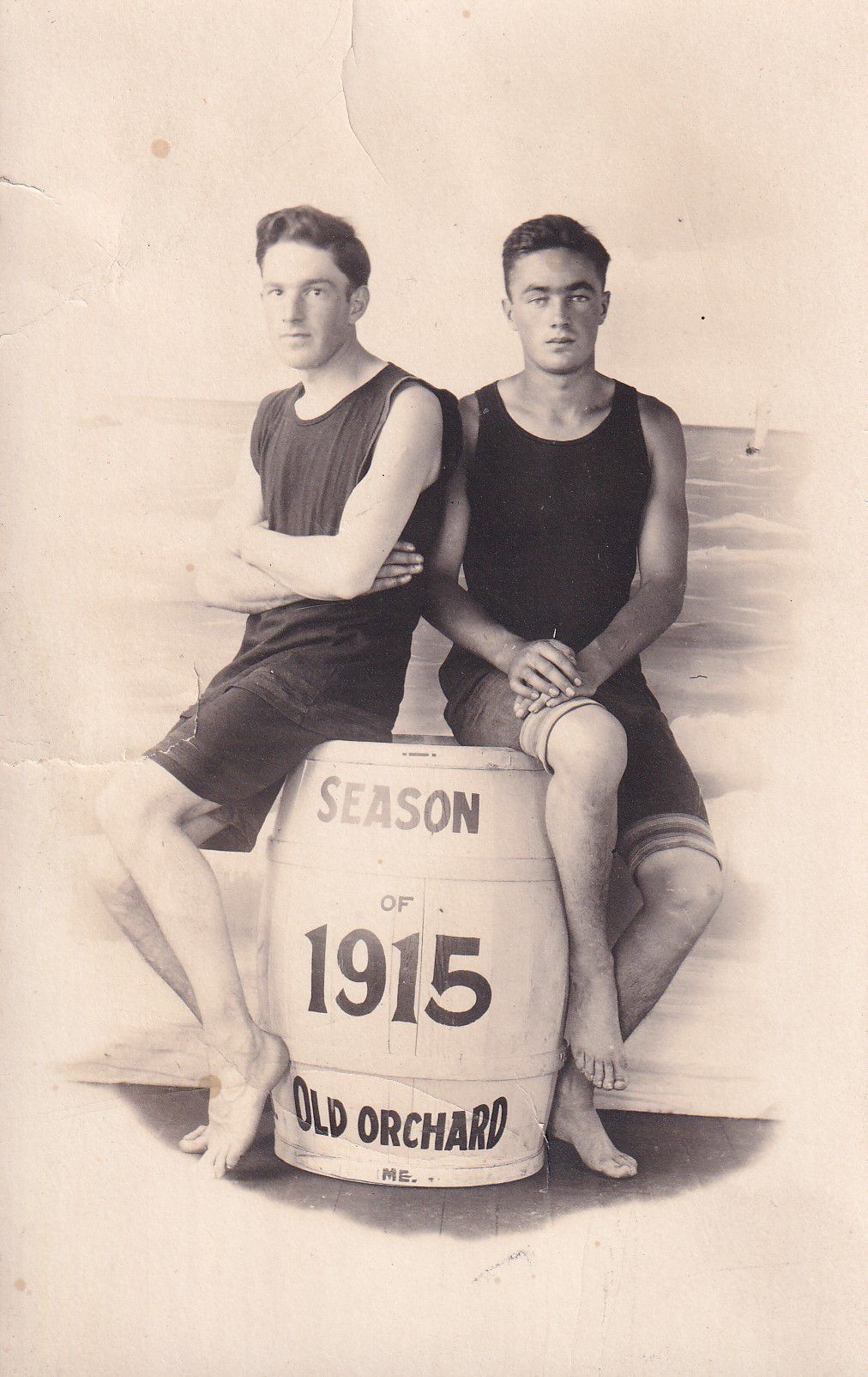 A postcard bearing a black and white photograph of two men sitting on a barrel that has the year 1915 printed on it.
