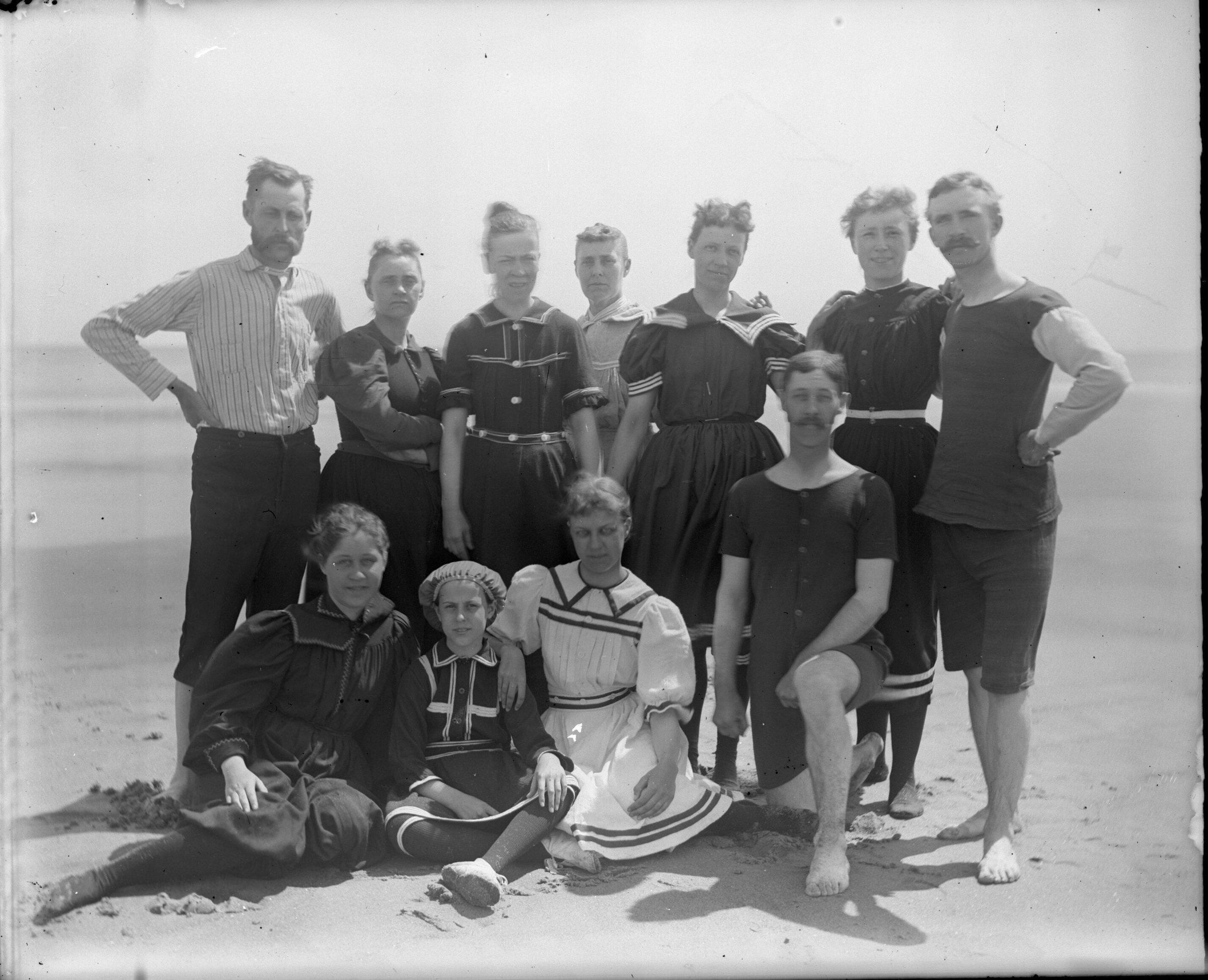 A glass plate negative photo of a group of men and women in swimwear at the beach. "Bathing Party, Ocean Park, ME" is written on the plate sleeve.Made/Created
