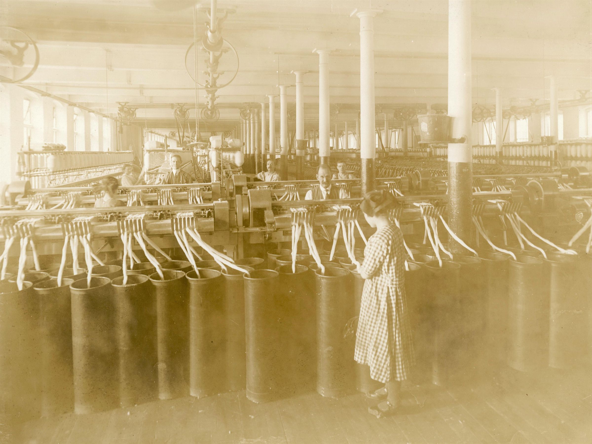 Photograph of workers working at drawing frames in the Laconia Division of the Pepperell Manufacturing Company. Coiled "slivers" from cans were passed through pairs of steel rolls which attenuated the six slivers into one. The resulting single sliver was then coiled into a can at the front of the drawing frame.