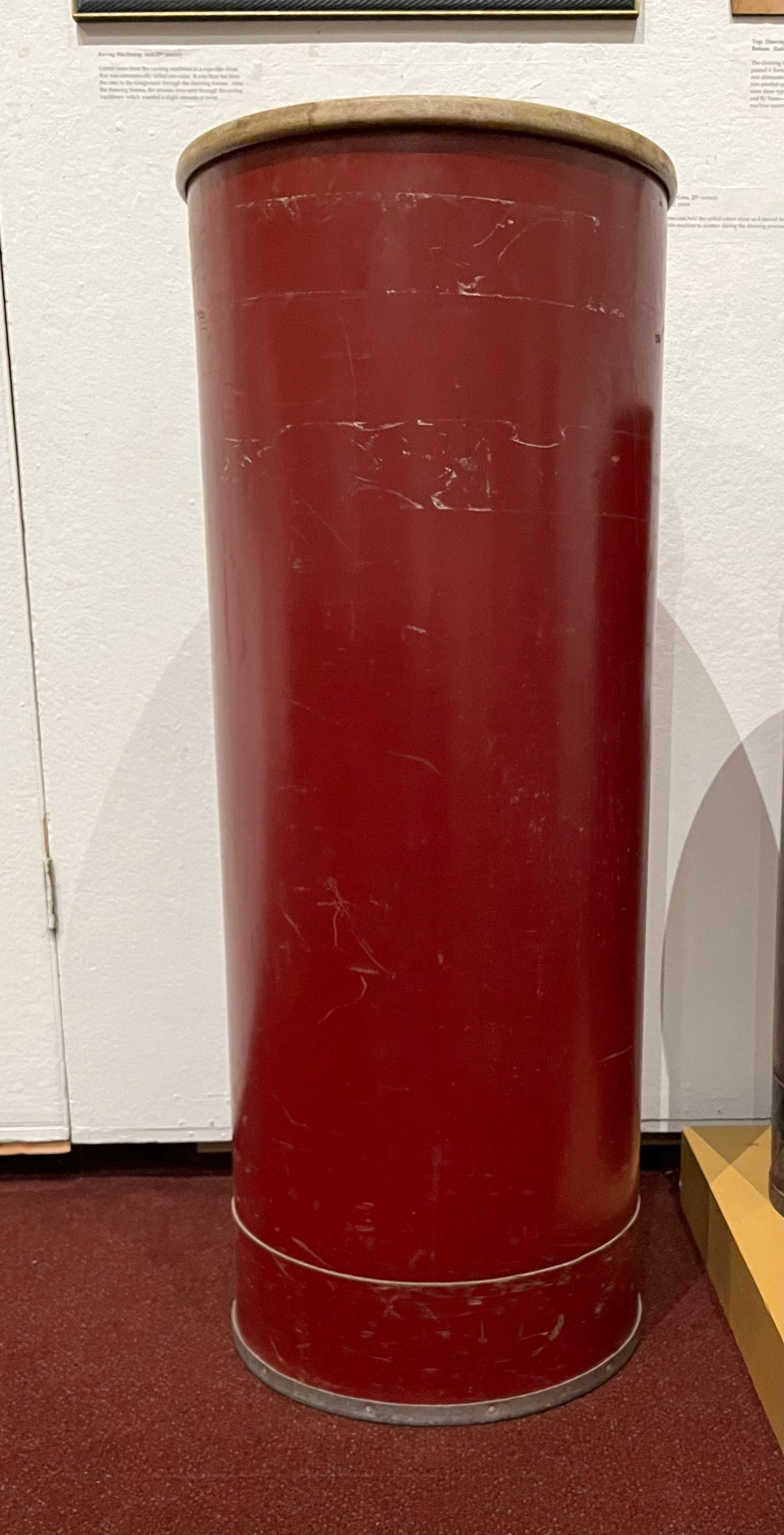 Large sliver can with a rolled top and seamless sides of some type of composite material and a metal bottom. Painted red with.Dimensions