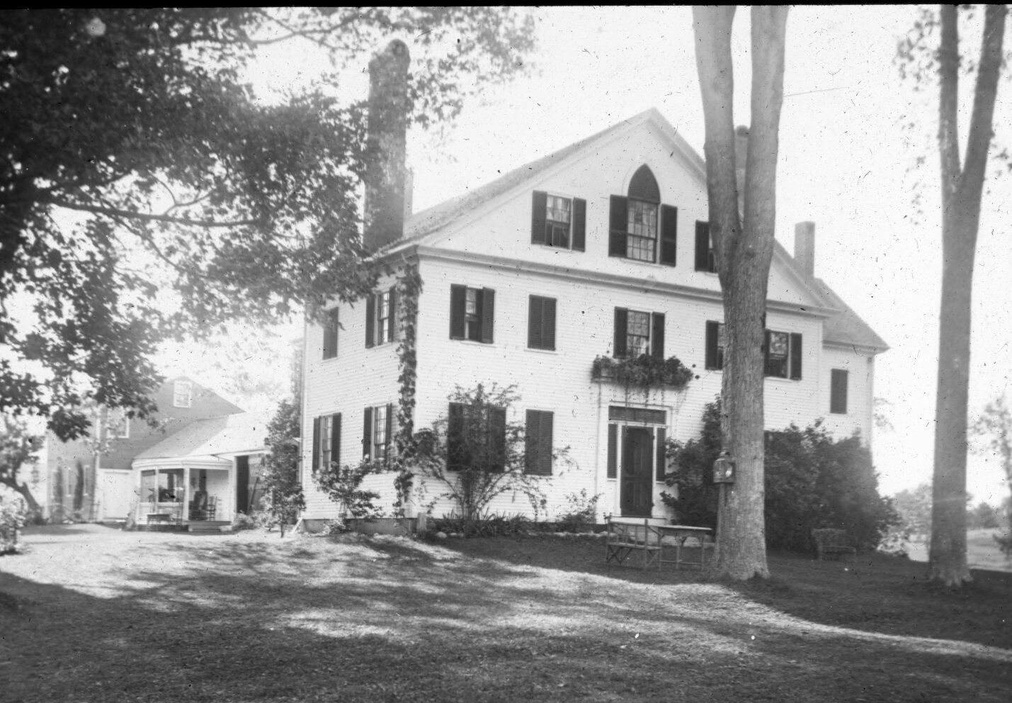 Glass lantern slide photograph of Quillcote, author Kate Douglas Wiggin's house in Hollis, ME. "Her Summer Home" is written on the slide.