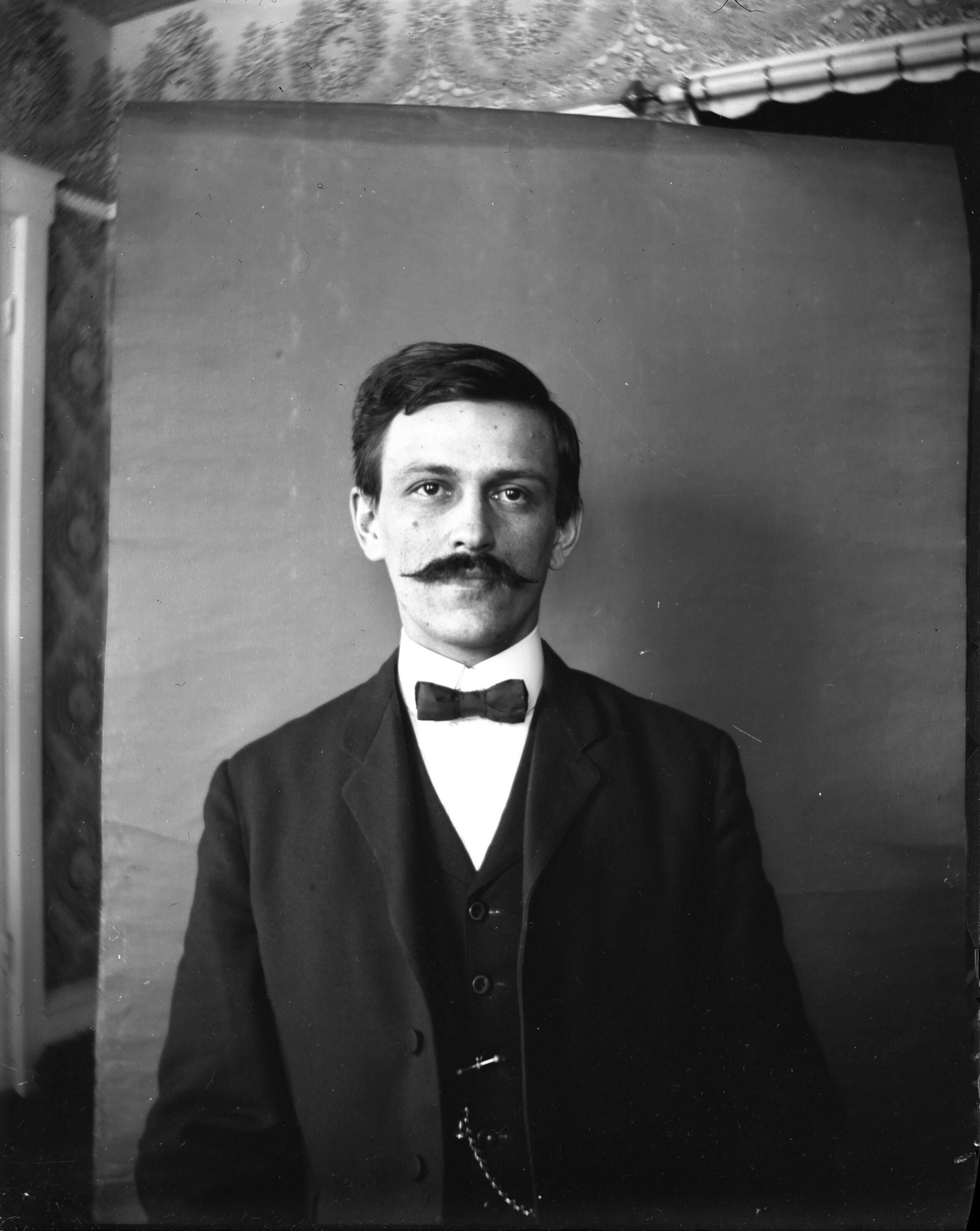 Glass plate negative photo of Rufus Milton Hobbs (1877-1940) self-portrait taken at 31 Hill Street, Saco, ME, circa 1905.