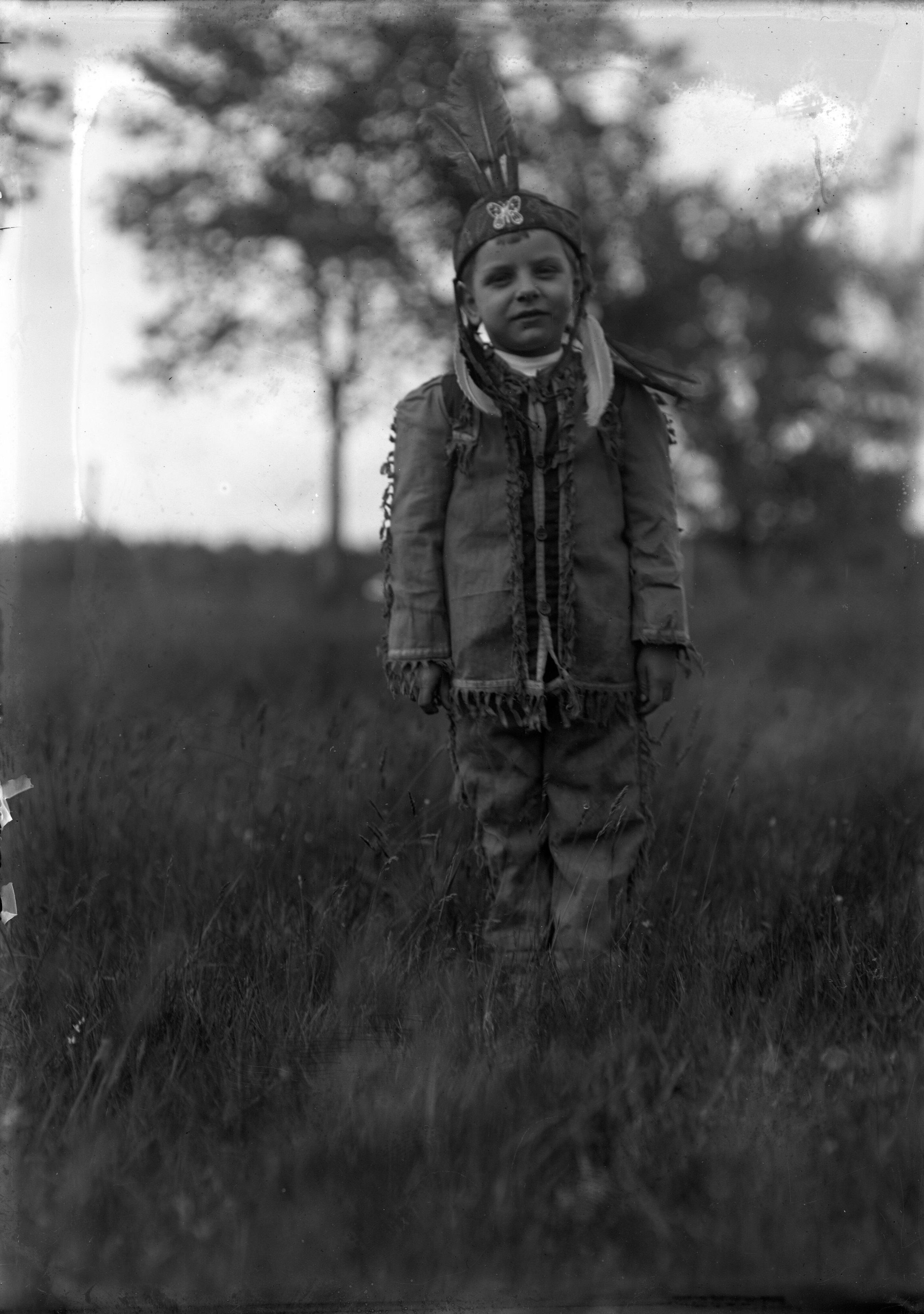 Glass plate negative photo of an unidentified boy dressed up as a Native American for the Thornton Academy Centennial Celebration, June 19, 1913. Thornton Academy put on a "History of Saco" pageant to celebrate the founding of the school. (Also see 2021.24.85 though 2021.24.90)