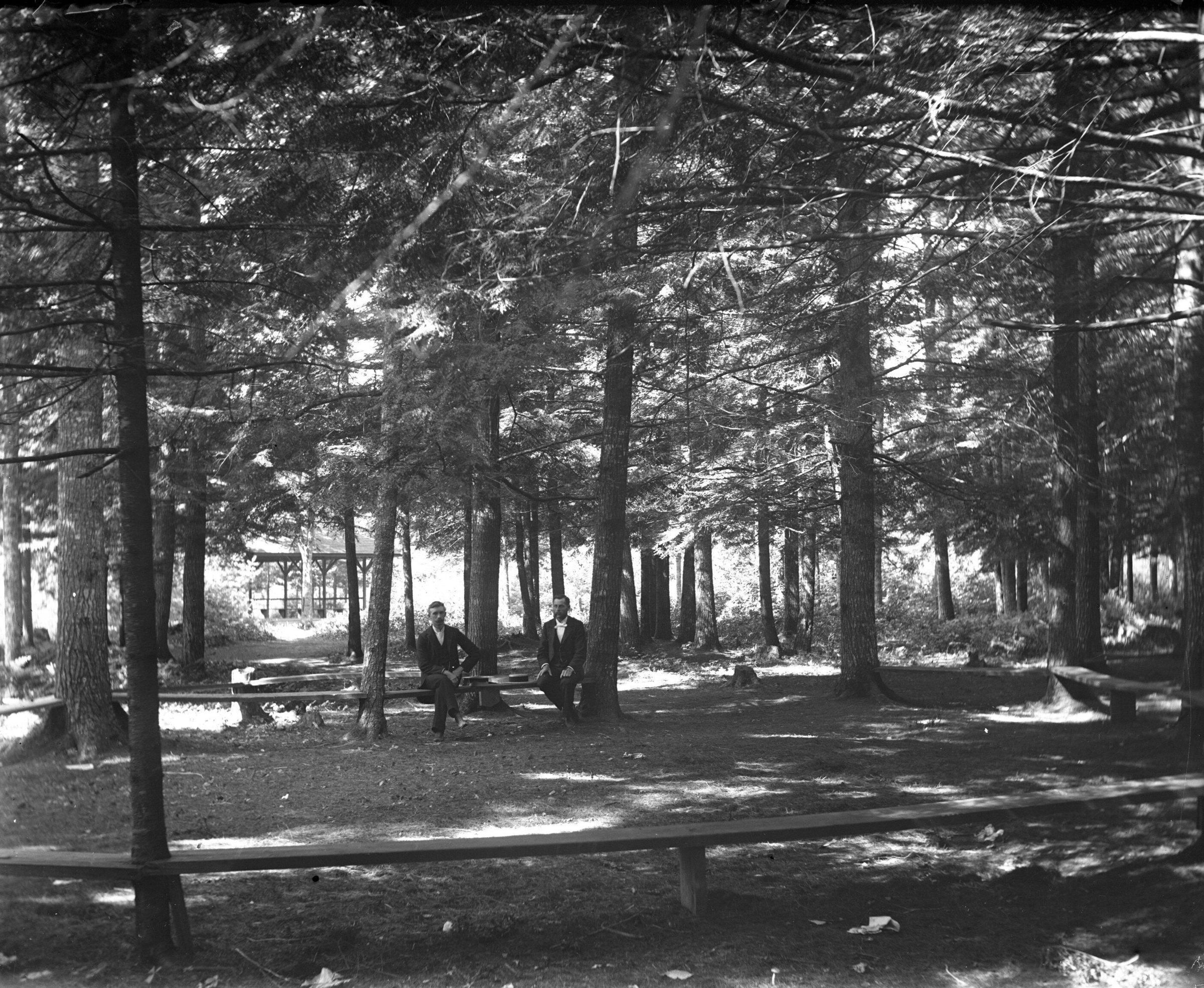 A glass plate negative photo of two men sitting on a bench among trees. "In Grove, Guild Park, Ocean Park, ME" is written on the plate sleeve.Made/Created