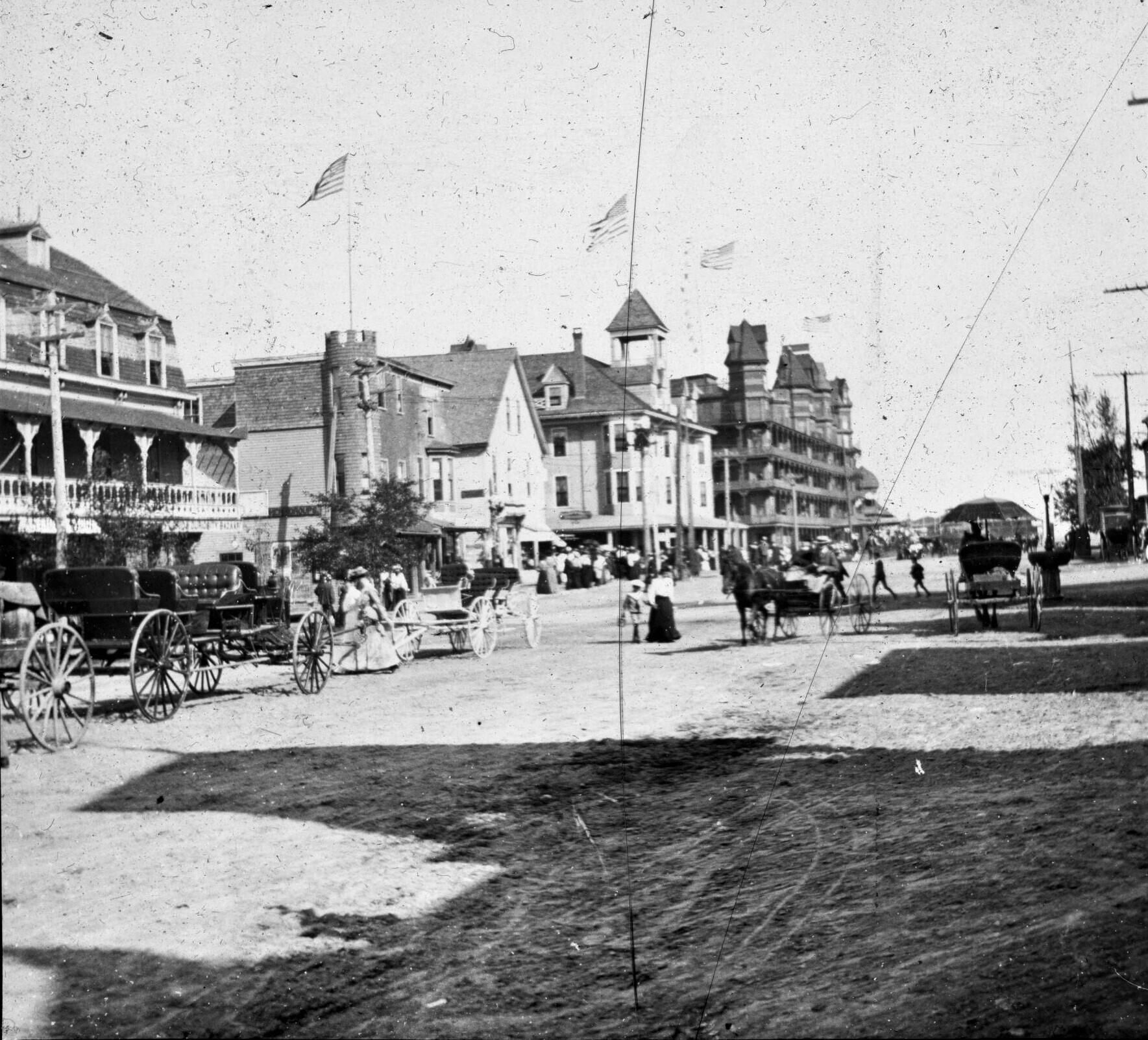 Glass lantern slide photograph of Old Orchard Street (looking towards the Pier) in Old Orchard Beach, ME. Hotel Velvet can be seen at the end of the road. Several horse carriages and crowds of people line the road. This would have been the vantage point from the Old Orchard Beach train station. "Old Orchard" is written on the label on the plate.