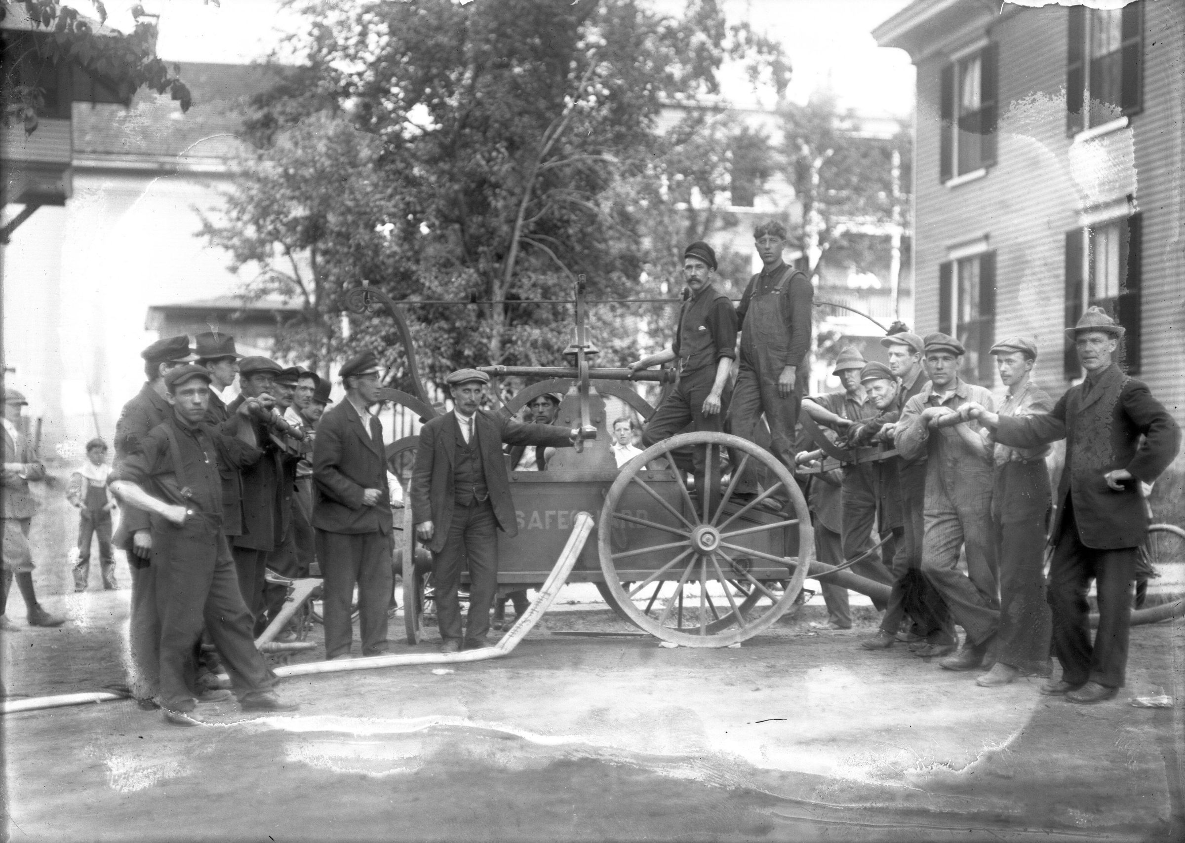 Glass plate negative photo of a group of men around a handtub fire engine. The "Safe Guard" was an 1880 Hunneman hand engine from Kennebunk.