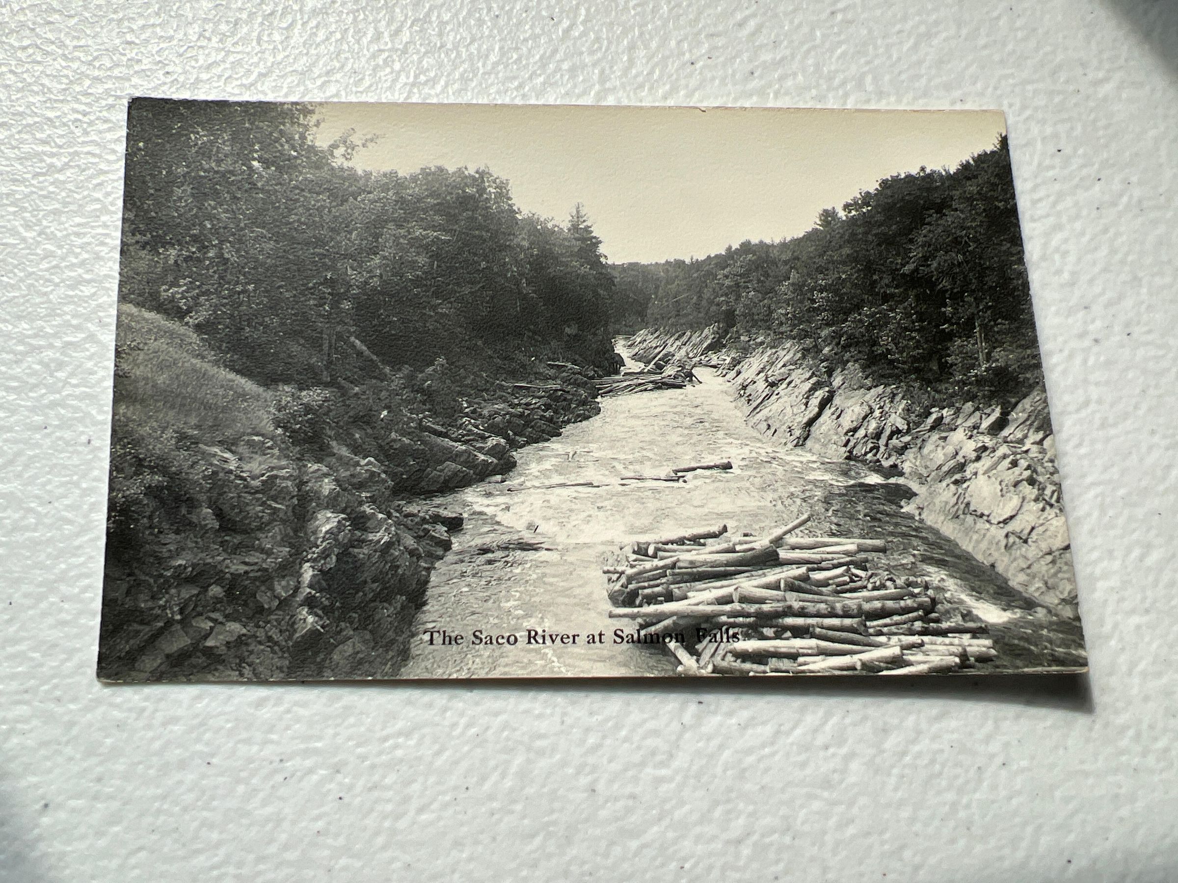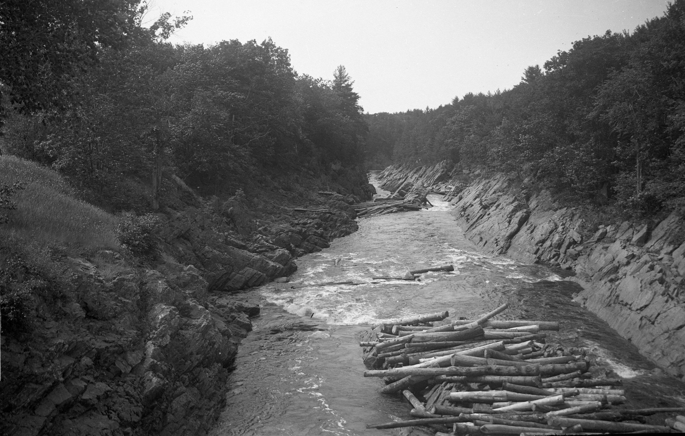 Glass plate negative photo of logs on the Saco River in Hollis, ME. A section of postcard attached to the back of the plate has "July 15, 1913" written in pencil. This very same image appears on a postcard in the Dyer Library archives in the "Gibeon E. Bradbury Family Papers" collection (MMS51.Ph34).Made/Created