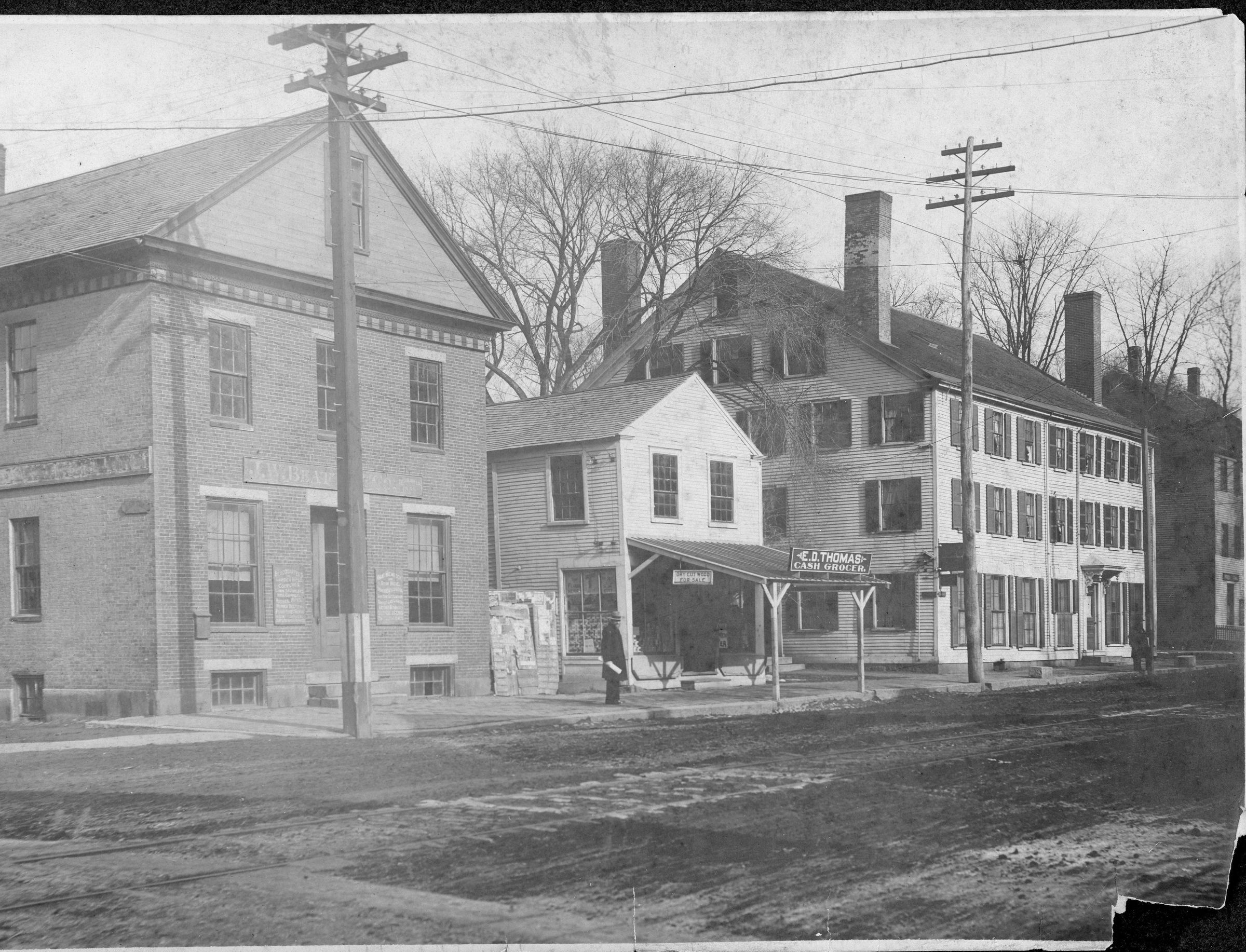 A print photograph of "Joker's Corner" on the corner of Main Street and Pleasant Street in Saco, ME. This is the same corner where Saco & Biddeford Savings in the Masonic Hall Block stands today. The J.W. Beatty & Co. mill supplies and leather belting store and the Edwin D. Thomas grocery store can be seen. The old Thornton House, then known as "The Wallace," can be seen on the right. The owners and patrons of the two stores often gathered and socialized at the corner, giving it its nickname, "Joker's Corner."