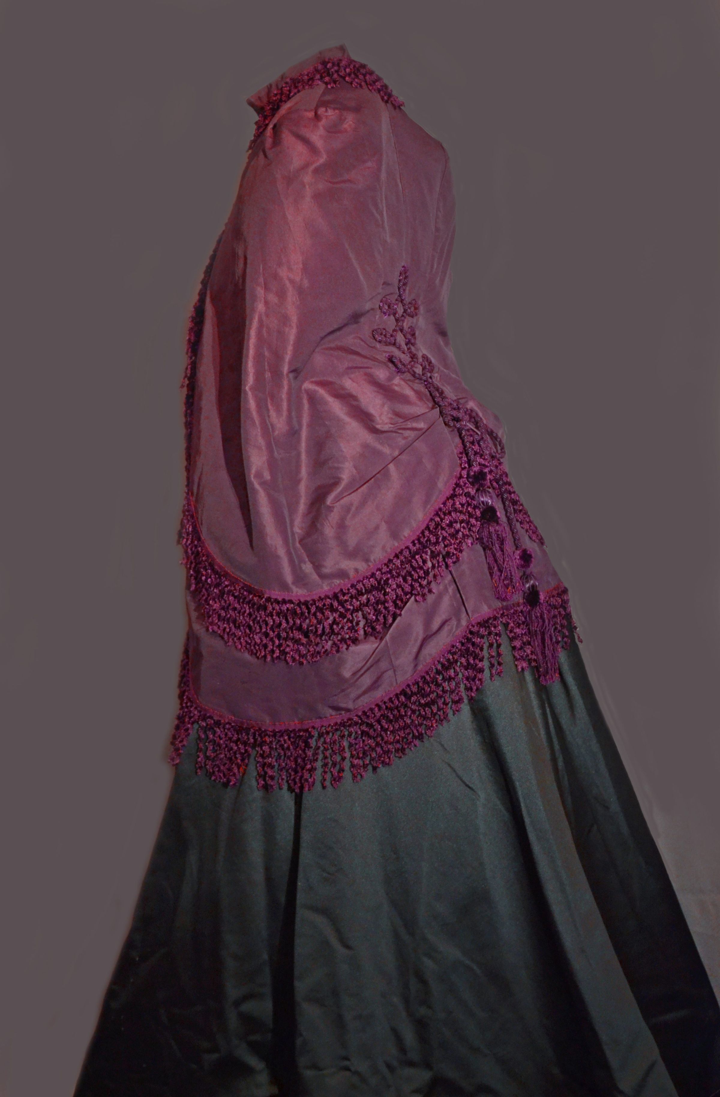 Mantles were outdoor garments designed to be worn over the fashionable bustles of the 1870s and 1880s. This stylish silk taffeta example is trimmed all the way around with chenille fringe, but otherwise is relatively plain in the front. All of the decoration is concentrated on the back of the mantle where a heavy braided cord has been sewn into a complicated knot-like pattern ending in two large tassels that would have dangled over the back edge of the bustle. This was clearly a garment that was designed to call attention to the bustle itself.Label Type
