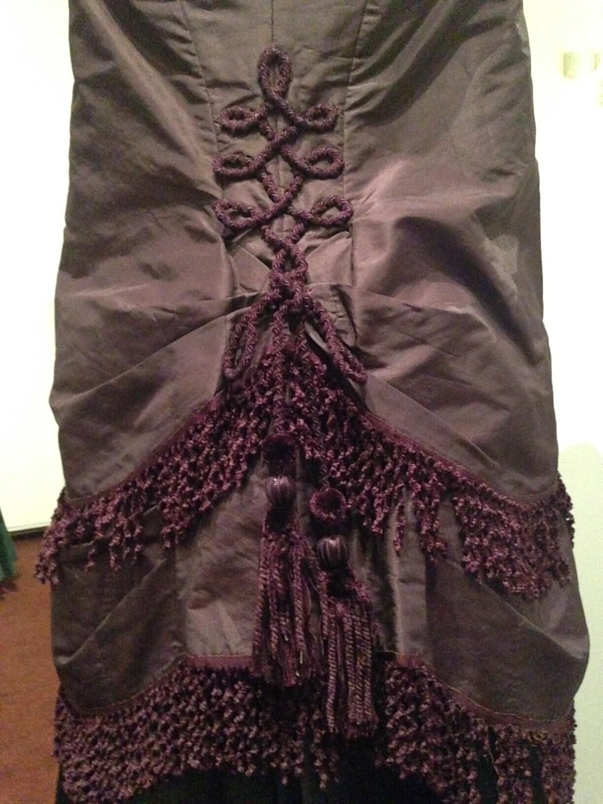 This mantle is an outdoor garment designed to be worn over the exaggerated shape of a bustle. It is trimmed all the way around with a lush chenille fringe, but is otherwise relatively plain in the front. All of the decoration is concentrated on the back, where a heavy braided cord is sewn into a complex knot-like pattern ending in two large tassels that would have dangled over the back edge of the bustle. The silk of the mantle is lovely, but it is the rich matching tones of the chenille and cord that transform the garment into an eye-catching one.