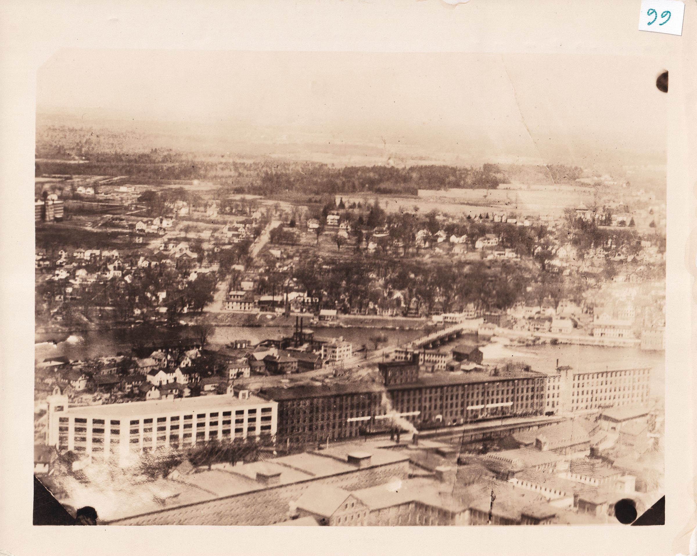 Aerial view of the Saco-Lowell Shops from Biddeford with the Saco River beyond the Saco-Lowell Shops.Made/Created