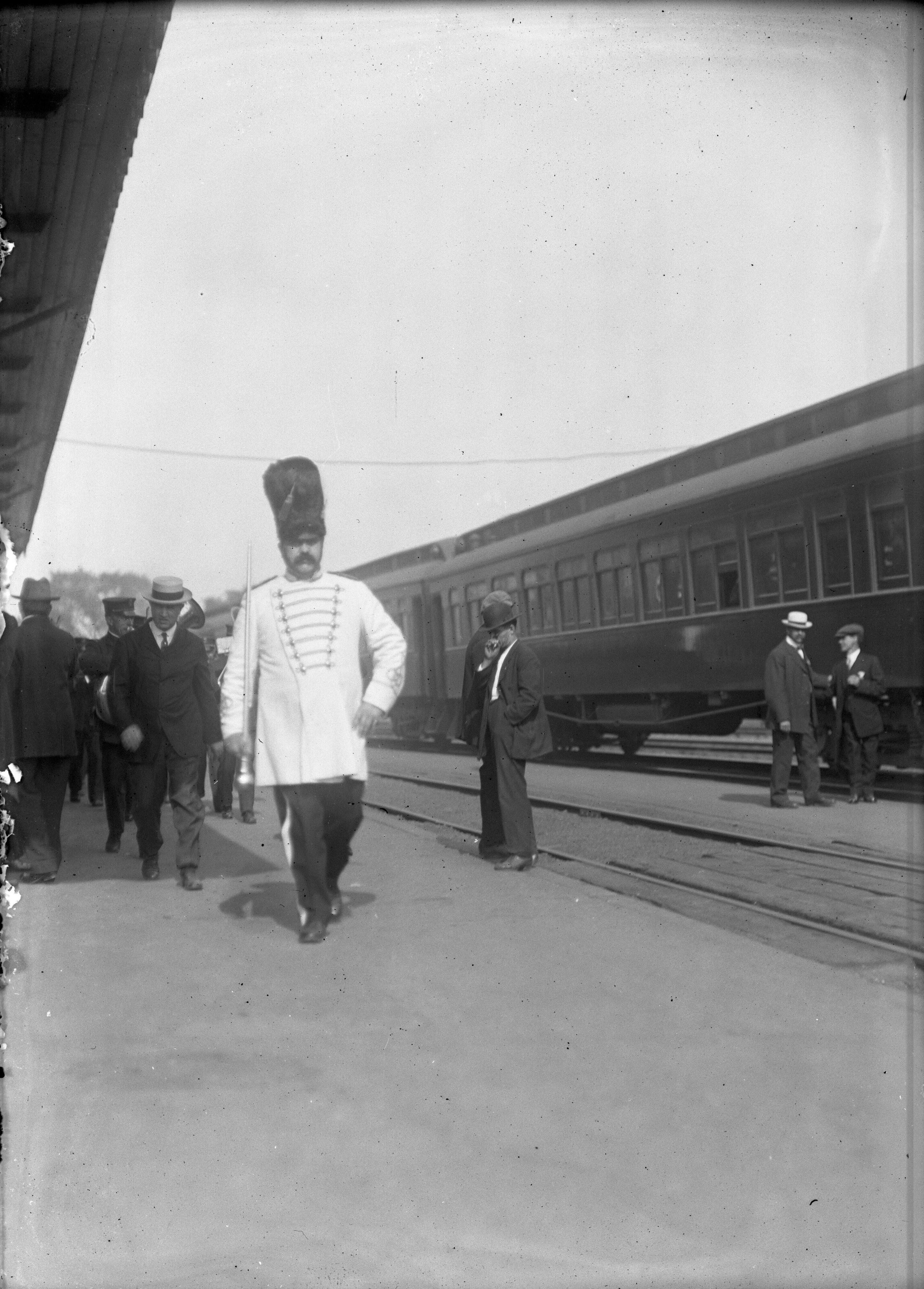 Glass plate negative photo of Painchaud's Band drum major Joseph Harvey (1871/1872 - 1920) at Biddeford train depot in 1913. The Knight's Templar Commandery & Painchaud's Band took the train to Lowell, Massachusetts to participate in the St.John's Day Parade.