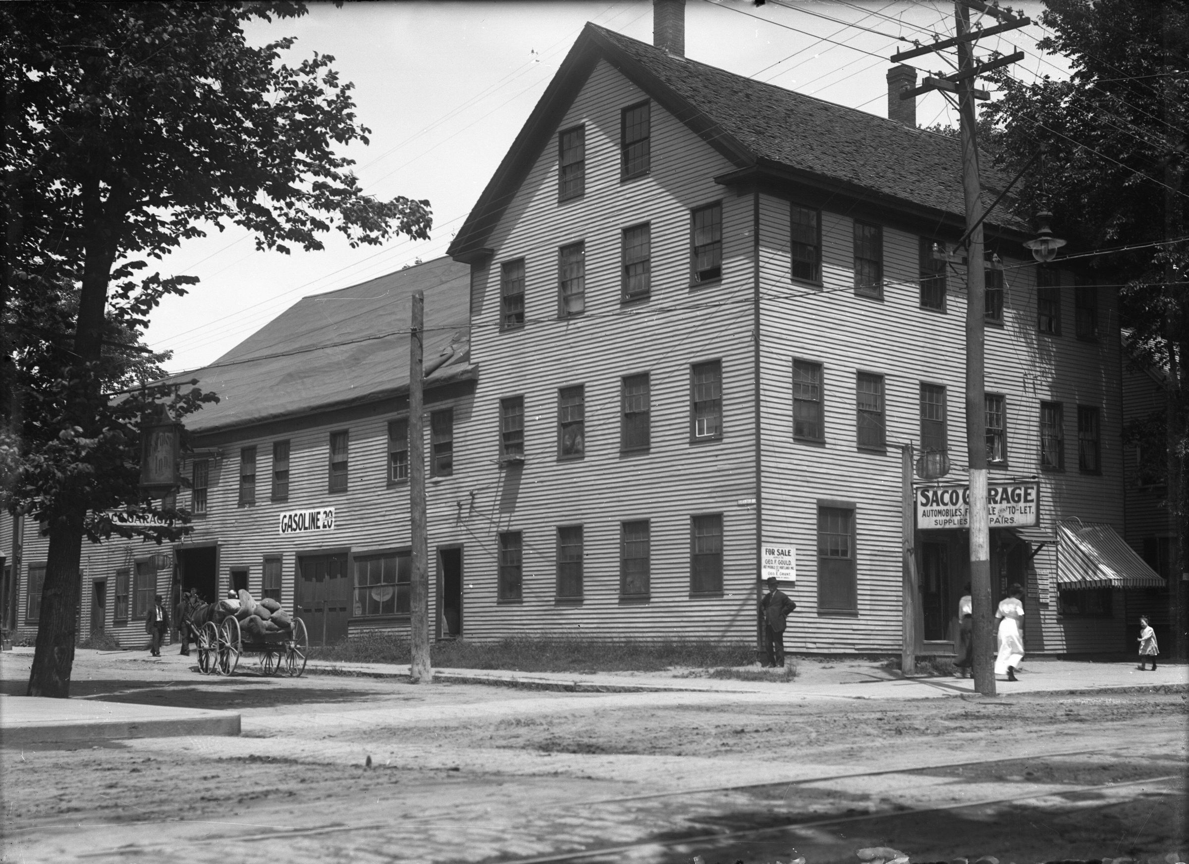 Glass plate negative photo of Saco Garage at 9 Thornton Avenue, on the corner of Main Street, Saco, ME.