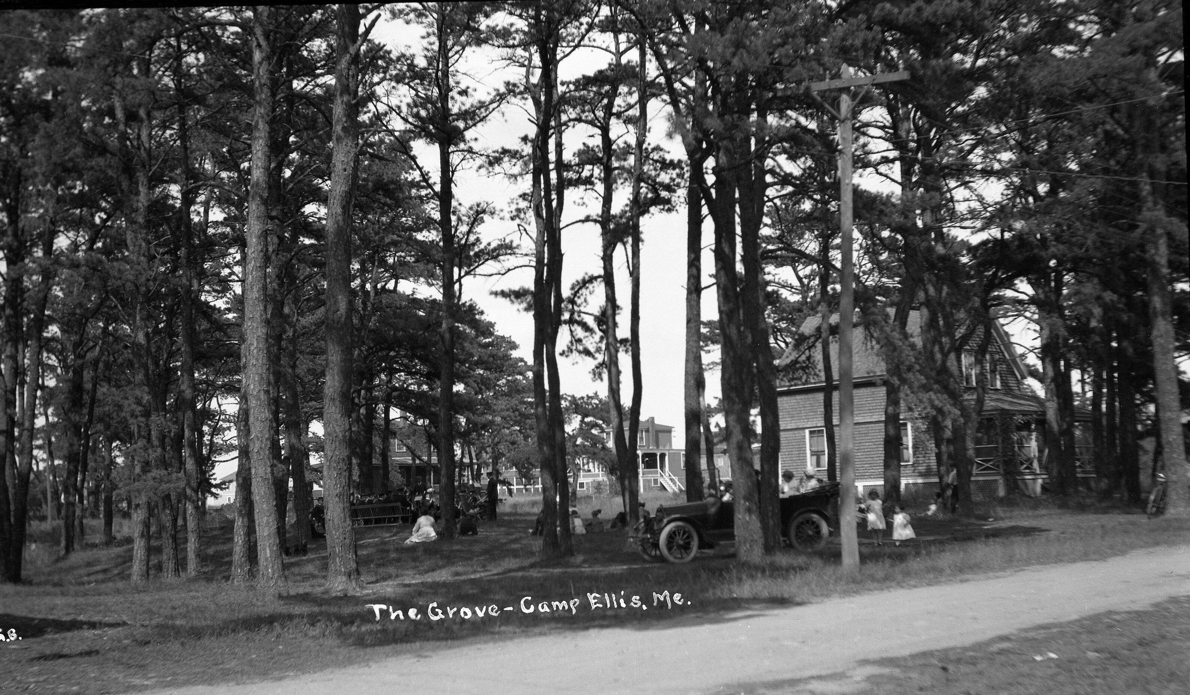 Negative print photo of The Grove at Camp Ellis, ME. An automobile and children can be seen. An orchestra is playing in the woods.Made/Created