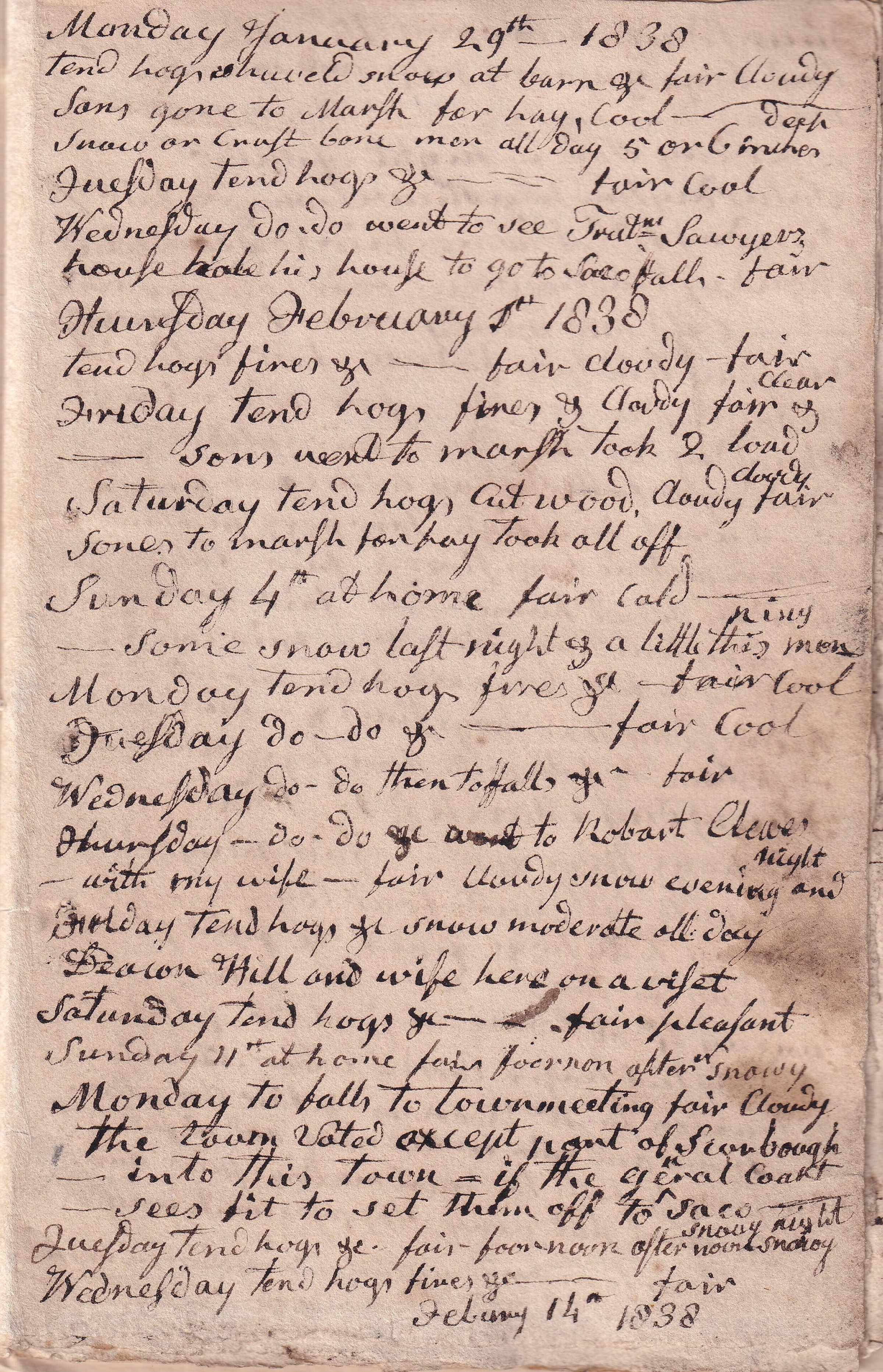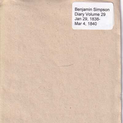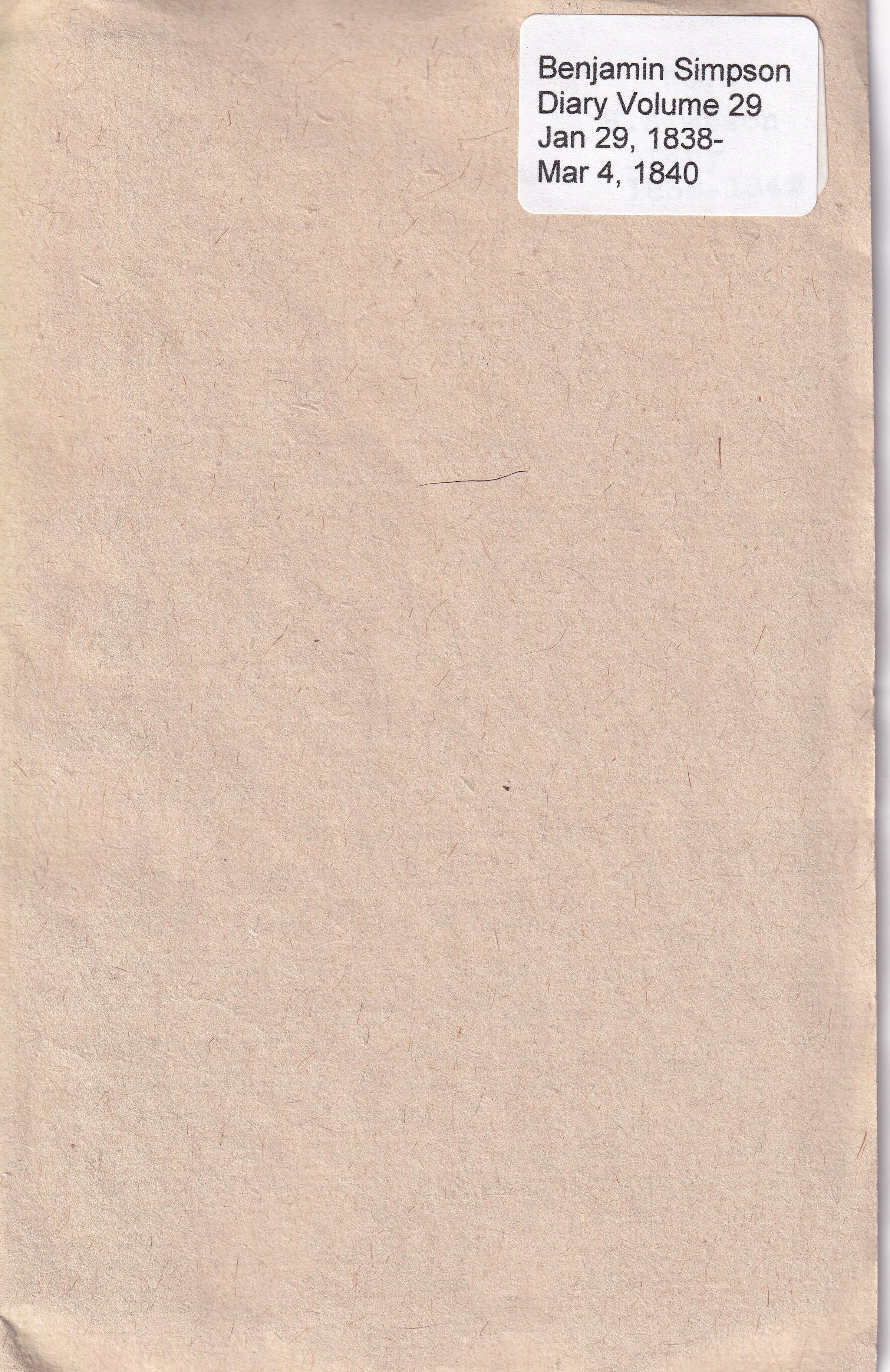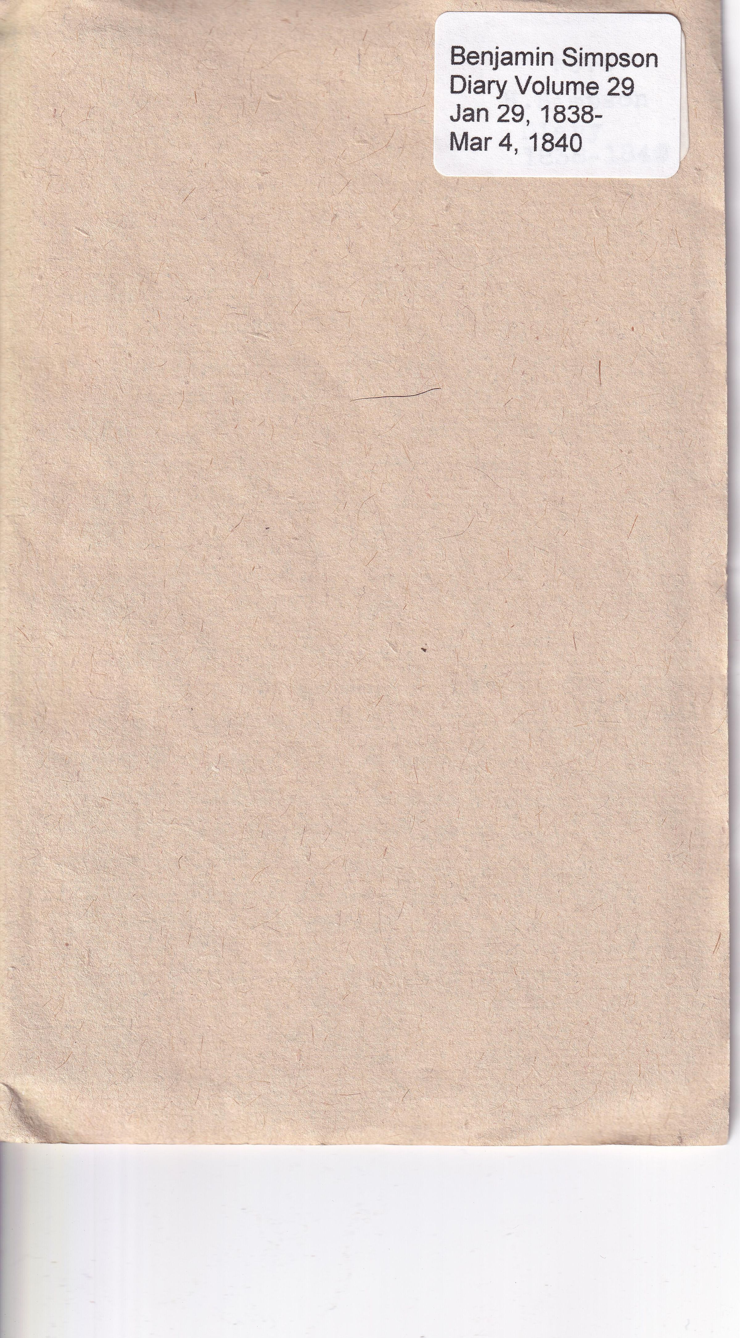 Twenty-ninth volume of the diary of Benjamin Simpson of Saco, 1781-1849. This volume covers the period January 29, 1838 through March 4, 1840; there is a gap in the diaries between February 1837 and January 1840. It is handwritten in ink on rag paper with a handsewn binding; it is now housed in a modern paper cover. Most of the entries are a single line. The date is listed at the top of each page, with individual entries (most without dates) listed below. Simpson noted his major task of the day and the weather.