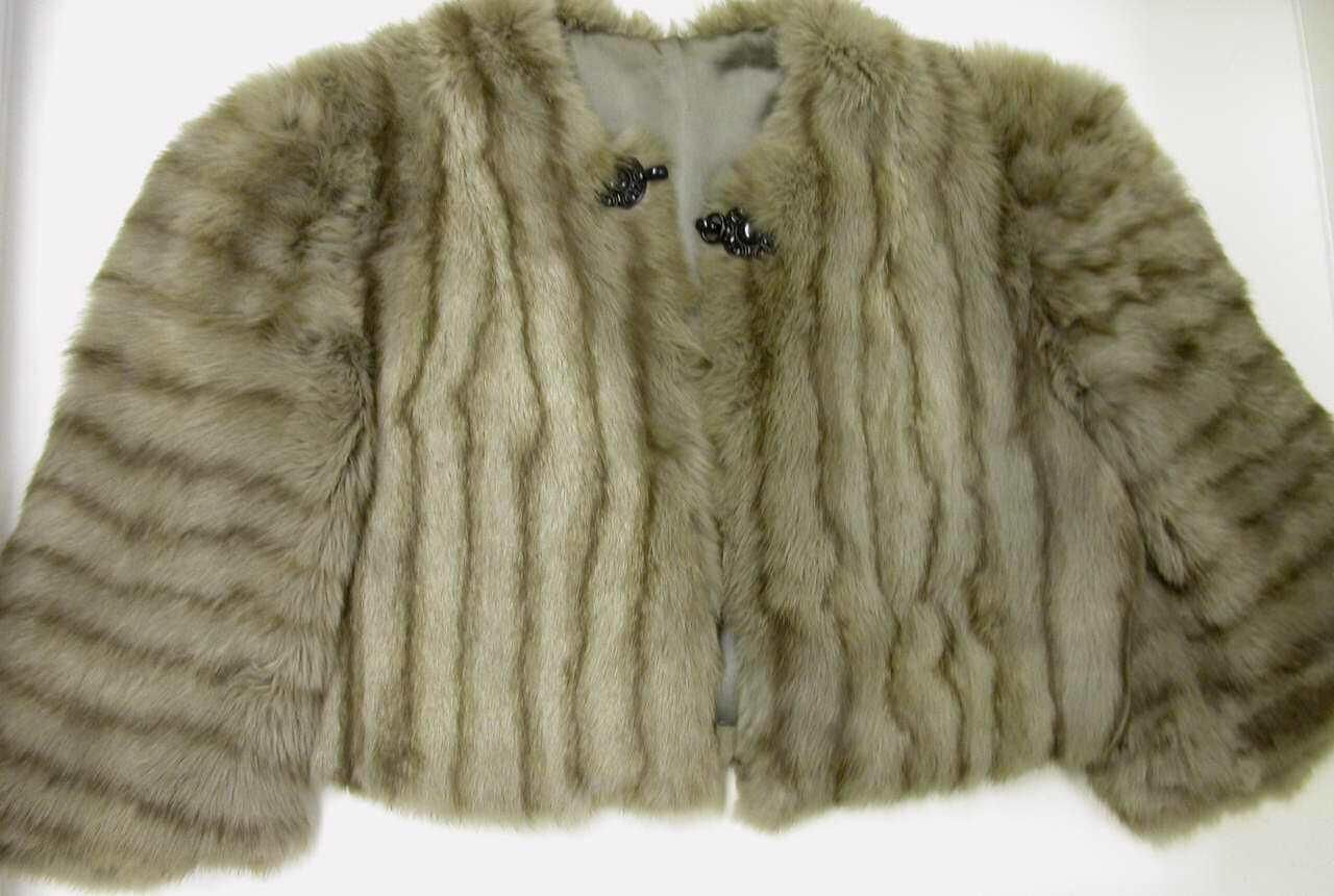 Waist-length fur jacket in two colors, striped tan and brown. Closes at the neck with black plastic hook and eye. Gray nylon lining.