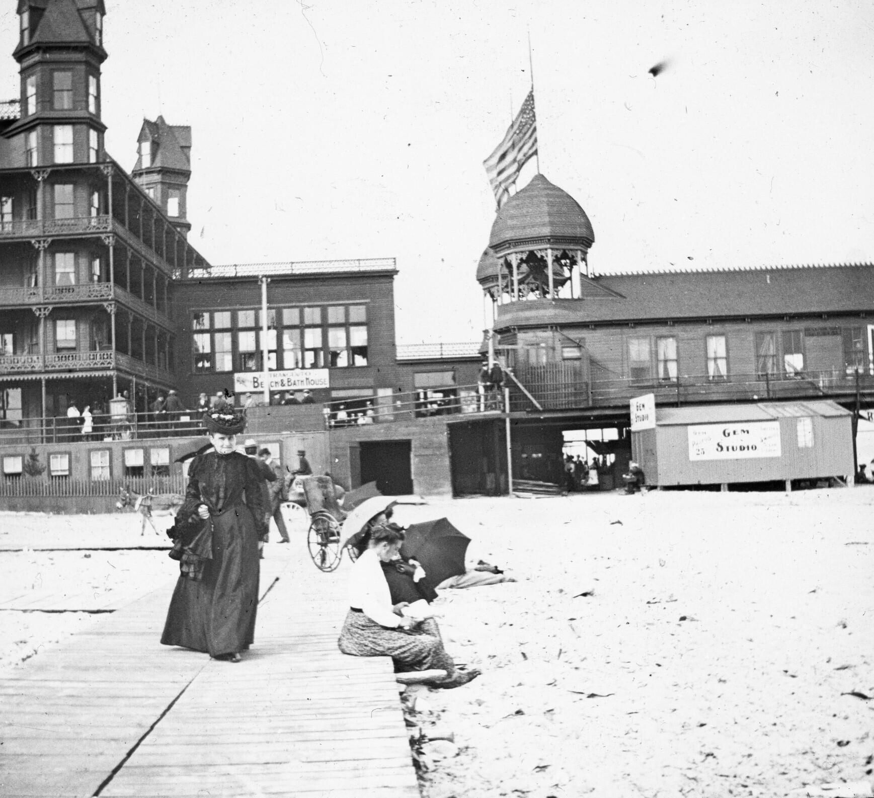Glass lantern slide photograph of a woman walking on the boardwalk at Old Orchard Beach near the entrance to the Pier. A section of Hotel Velvet is visible on the left.