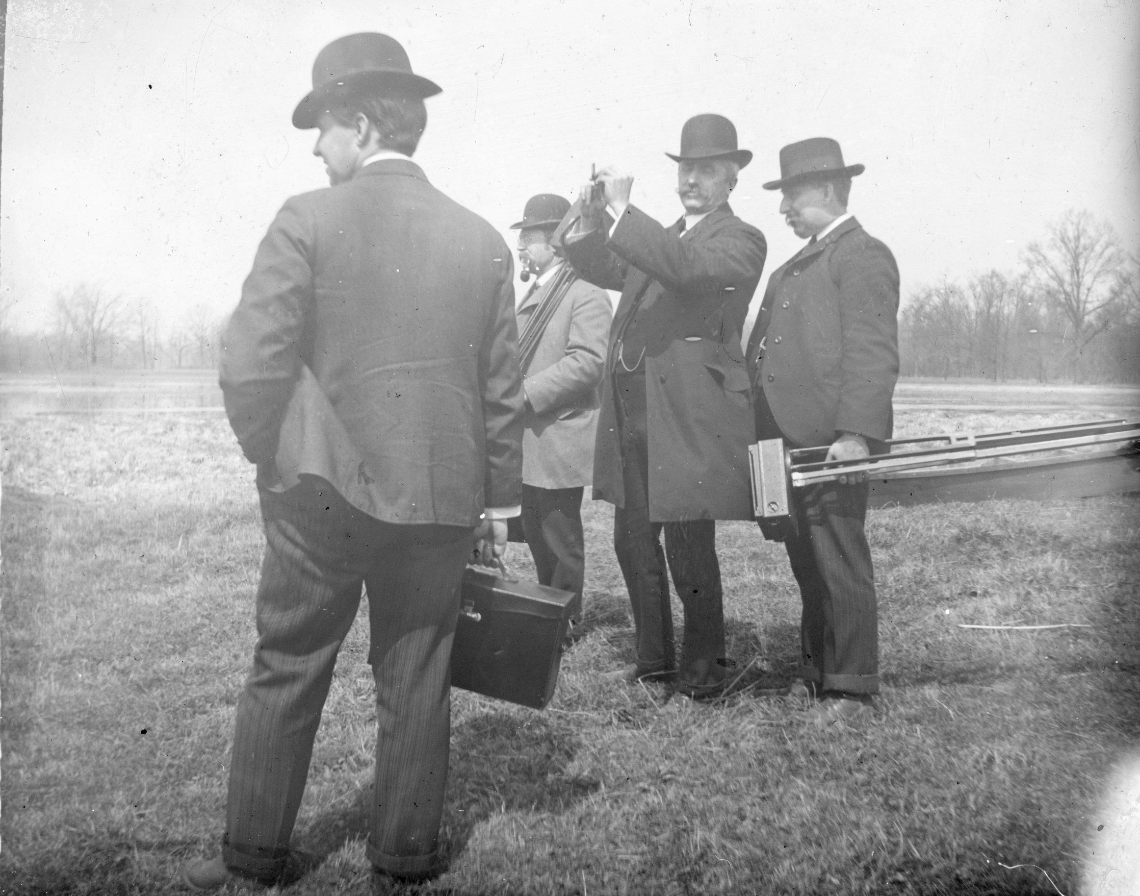 Glass lantern slide of four members of the Essex Camera Club setting up their cameras.