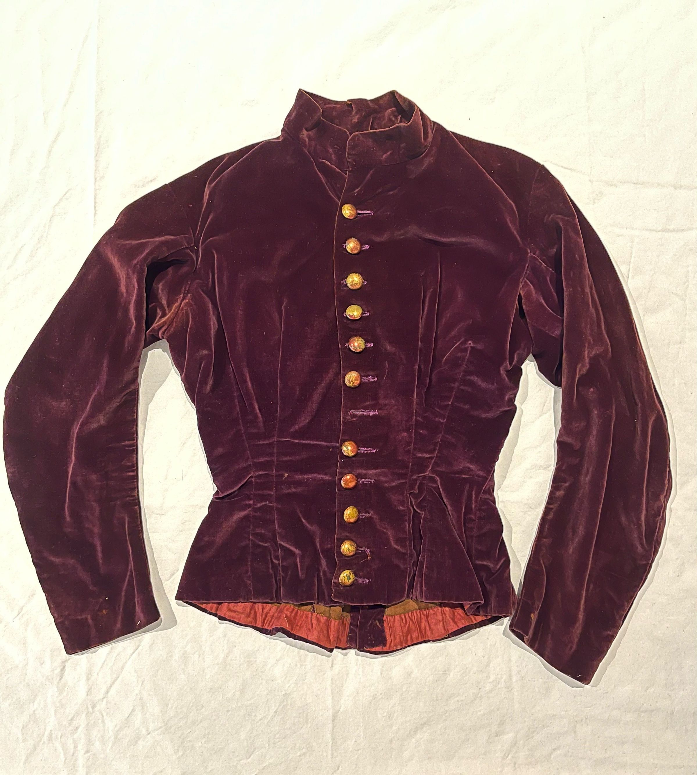 Burgundy velvet bodice with short standing collar. Closes up the front with rounded metal painted buttons. Nipped in waist and flares out over the waist. Unlined.