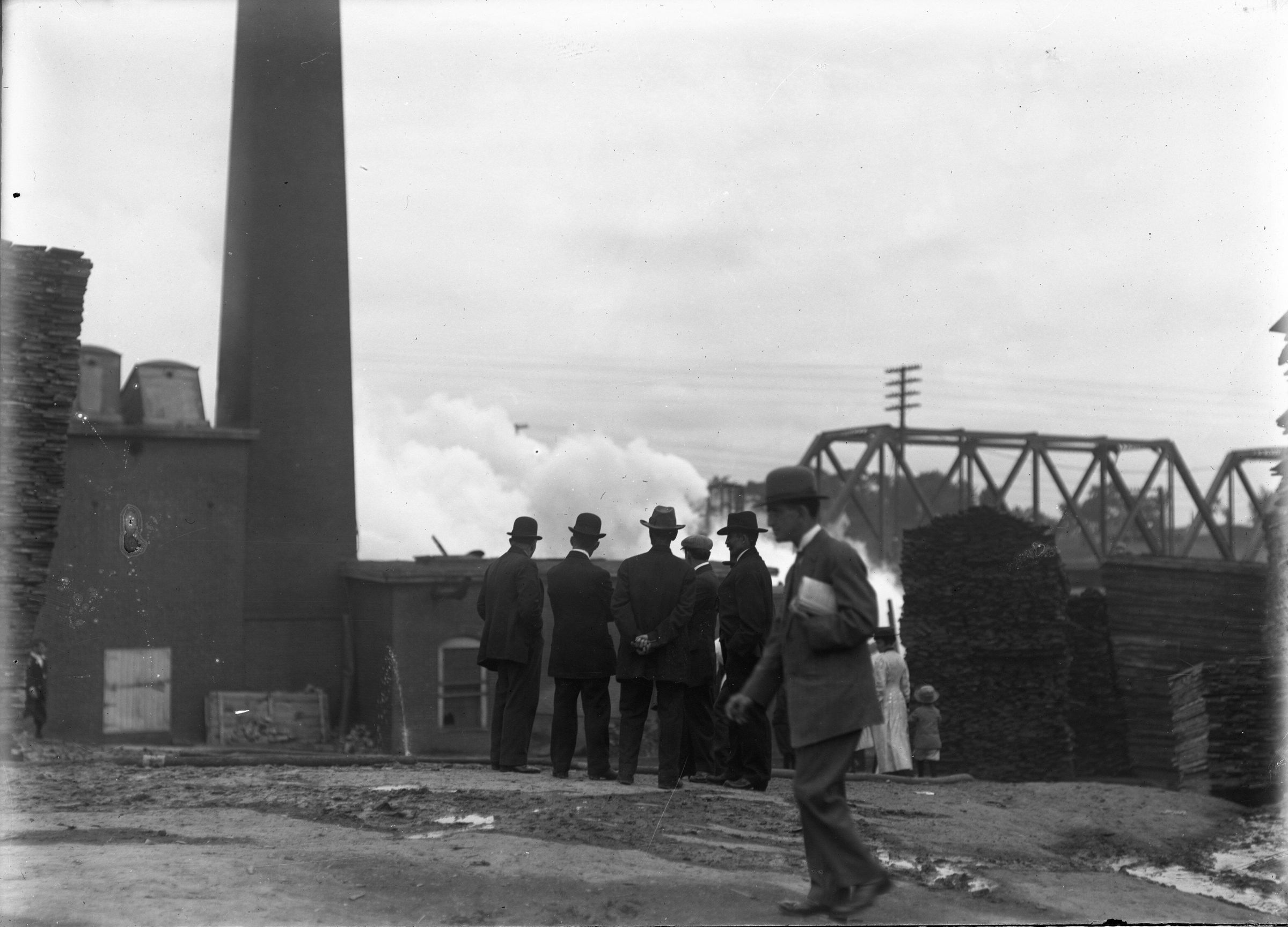 Glass plate negative photo of a group of men watching smoke from a fire. The Somesville fire in Saco occurred on September 15, 1908.