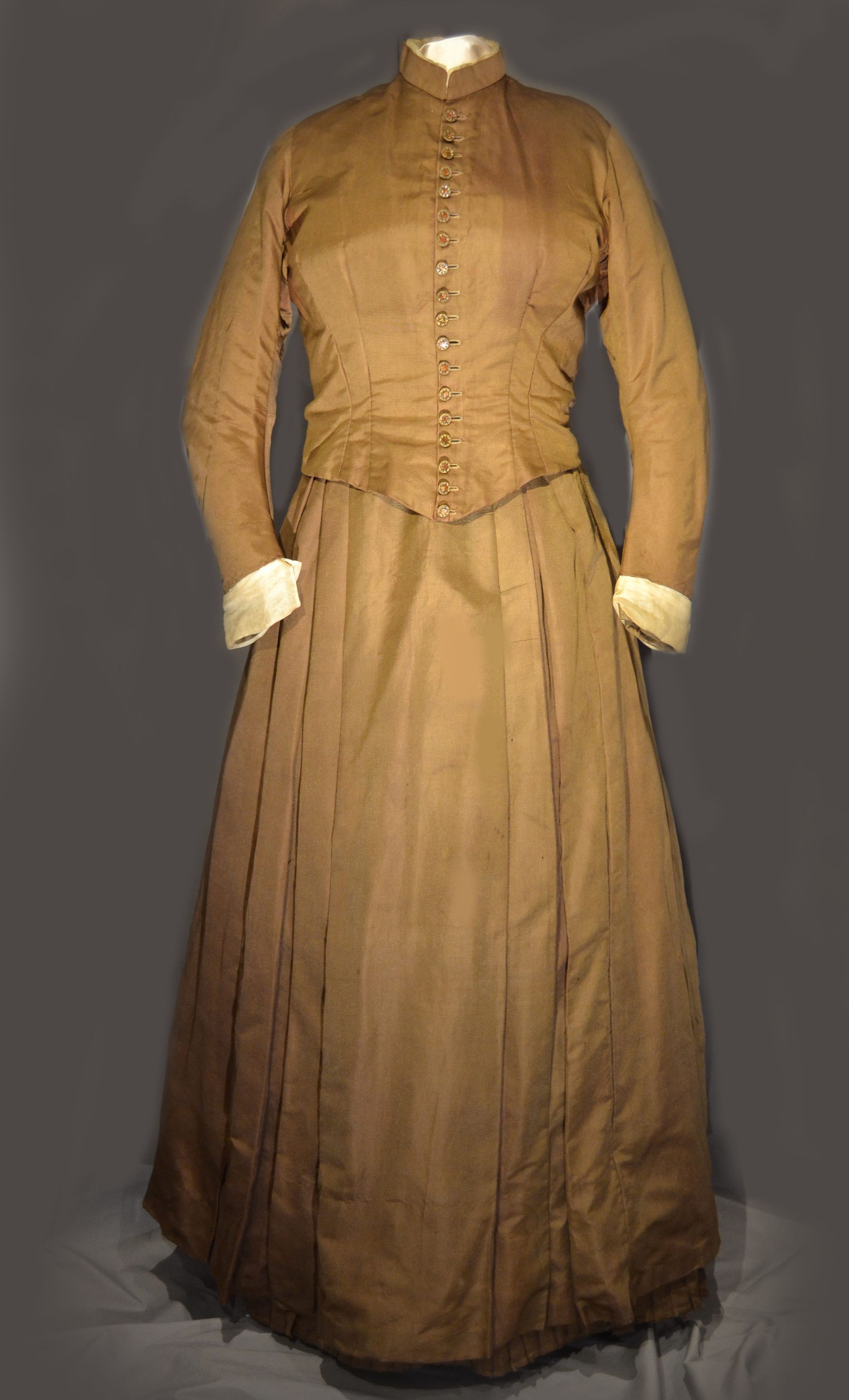 Dark colors were quite fashionable in the 1880s, with claret, deep purple, and shades of copper and gold being particularly popular for walking dresses. Although evening and other formal garments remained complicated and covered with elaborate decoration, day and casual dresses tended to be simpler. This ribbed silk walking dress has very little in the way of ornamentation, other than the gauze-like collar and sleeve cuffs and the tiny buttons that close the front bodice. The row of closely spaced buttons became a signature style for the 1880s. Their presence can help date cabinet and tintype photographs of the era. Since dresses like this one were designed for outdoor activities, they usually lacked a train and were accessorized with a matching wrap and a soft hat made of the same material. Everything had to match in color, although the fabrics could be different. The gloves were the only item allowed to form a contrast—and they were usually a shade of tan.Label Type