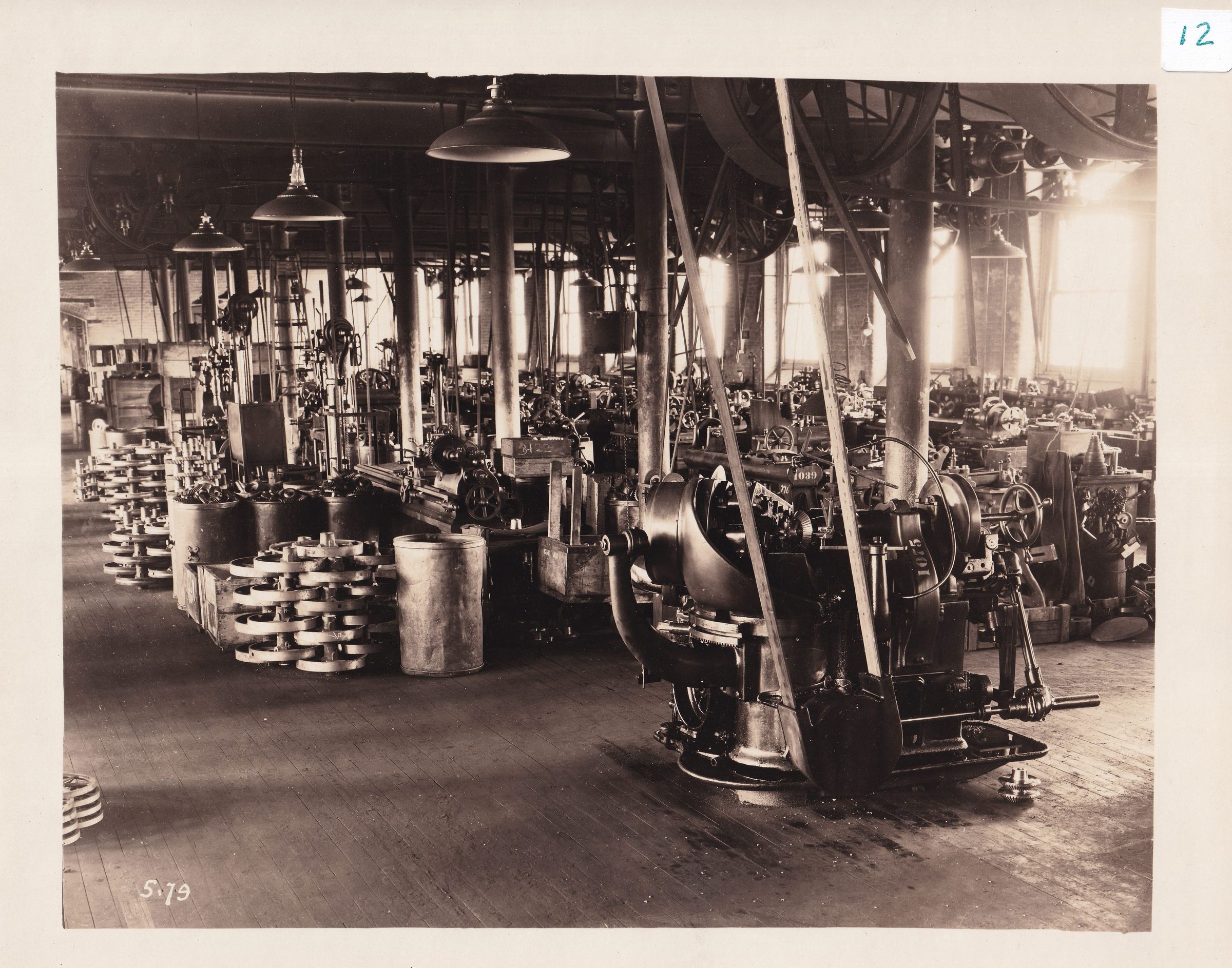 Banks of machines used to refine cast wheels by turning the wheel's outer surface, drilling holes, and possibly planing key shafts.Made/Created