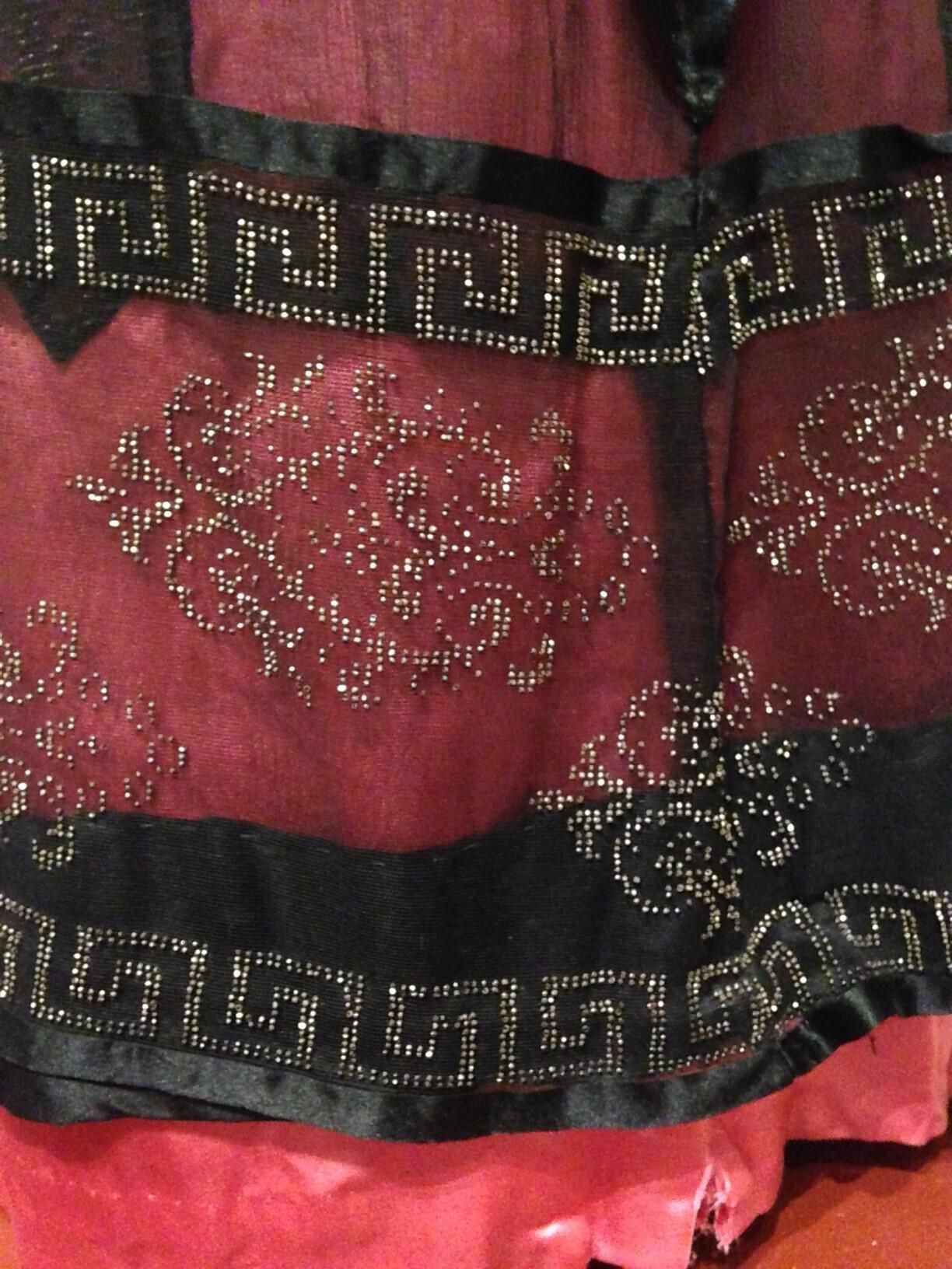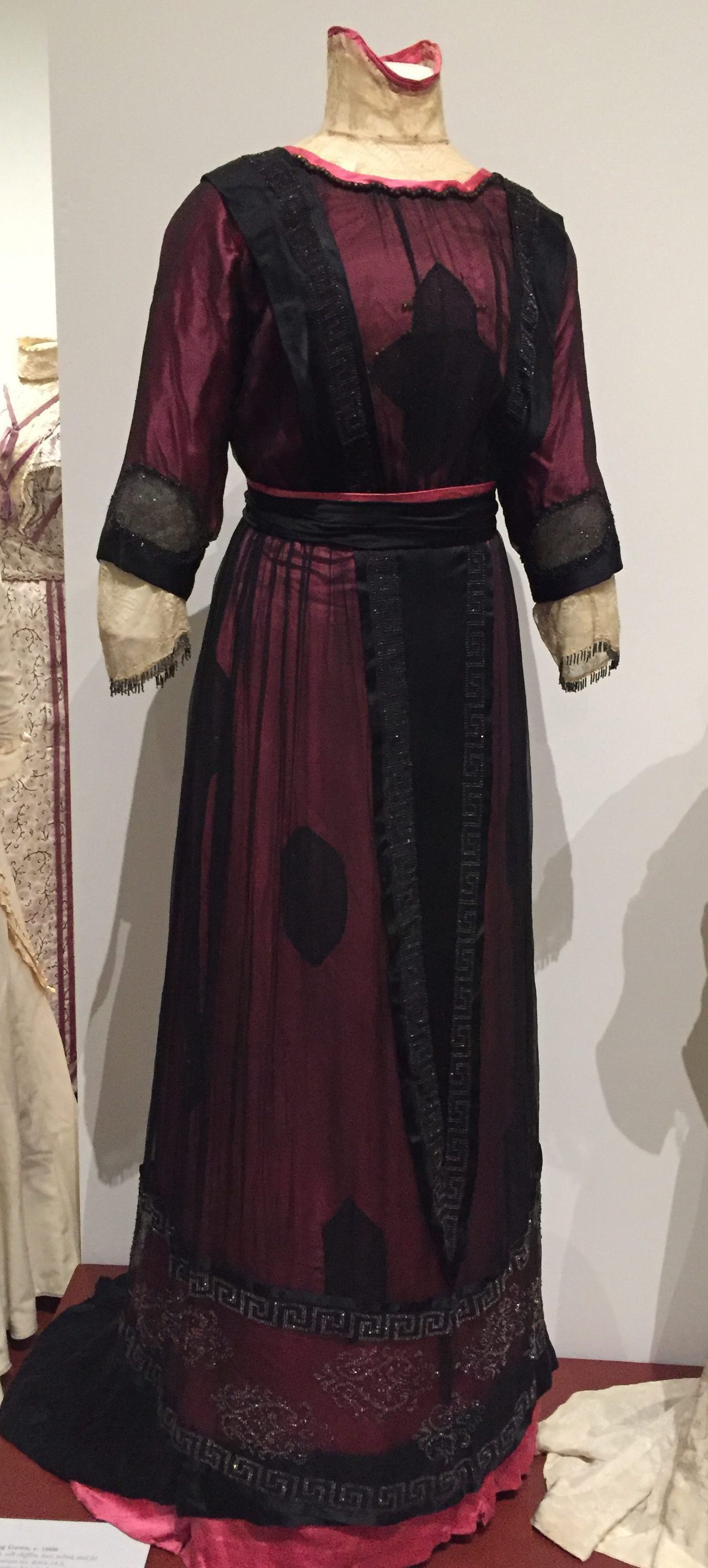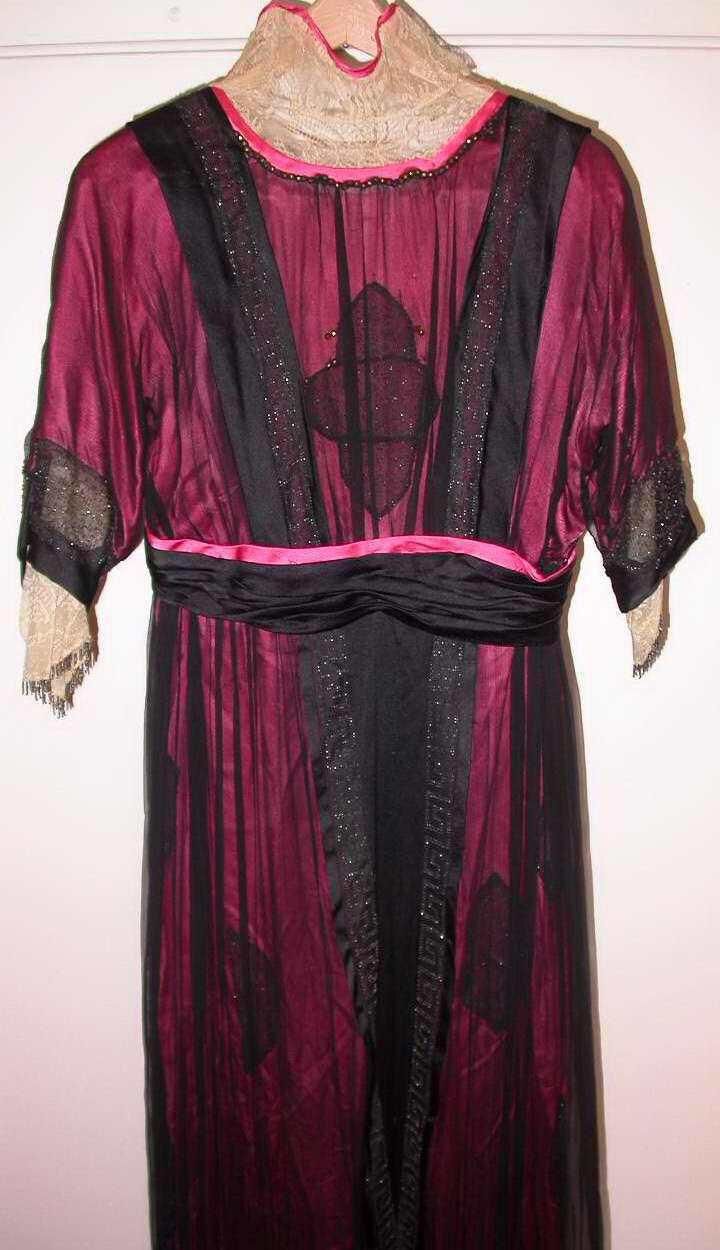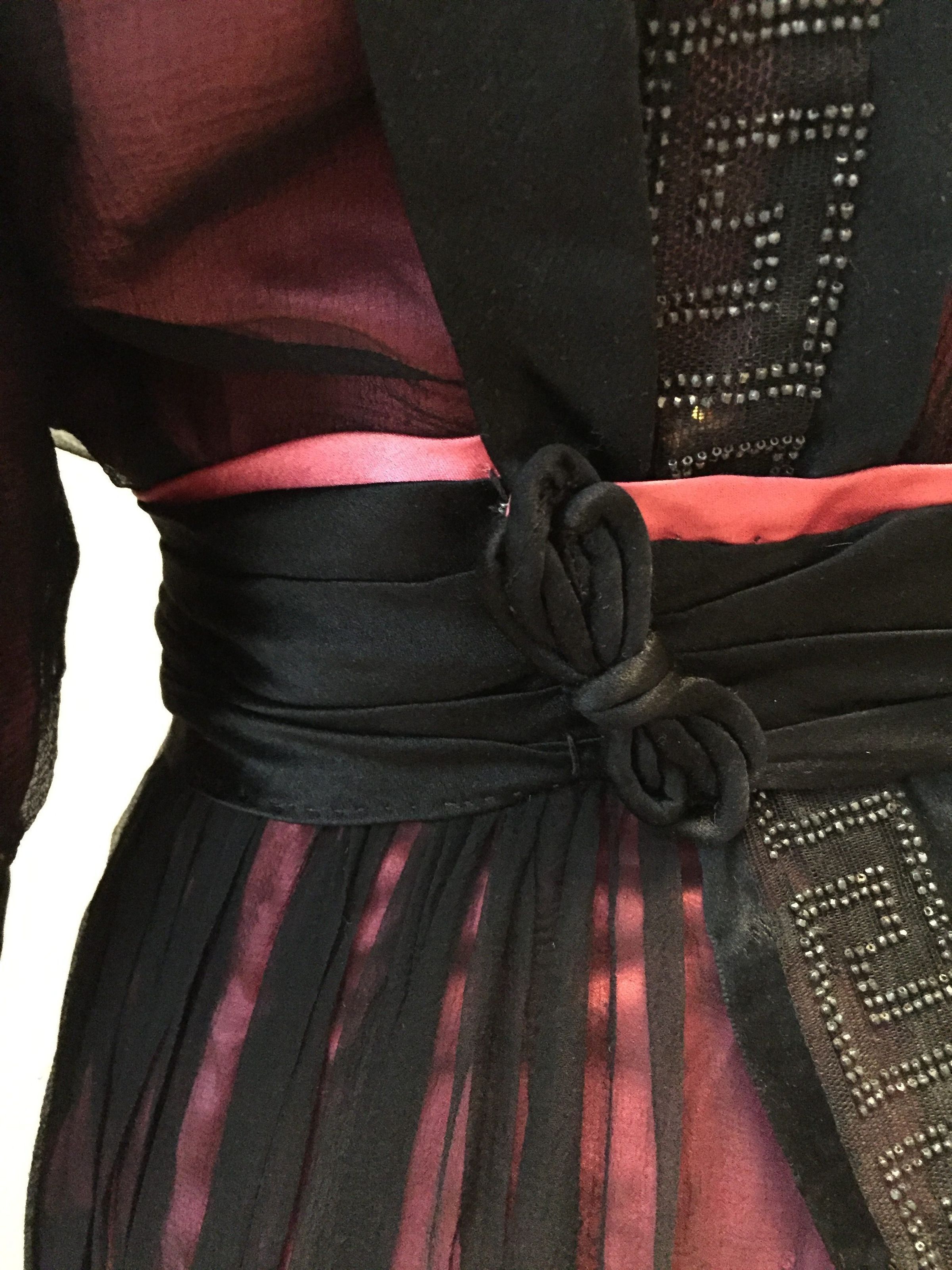 Sheer black chiffon drapes over a shockingly bright pink underdress to utterly change the nature of the color into something mysterious, rich, and shifting in tone as the chiffon moves. Splashes of the exposed pink silk appear as a counterpoint and a black silk sash is finished in the back with a knot of velvet cord. The lace cuffs and collar set off the dark hues of the gown and provide an elegant contrast.