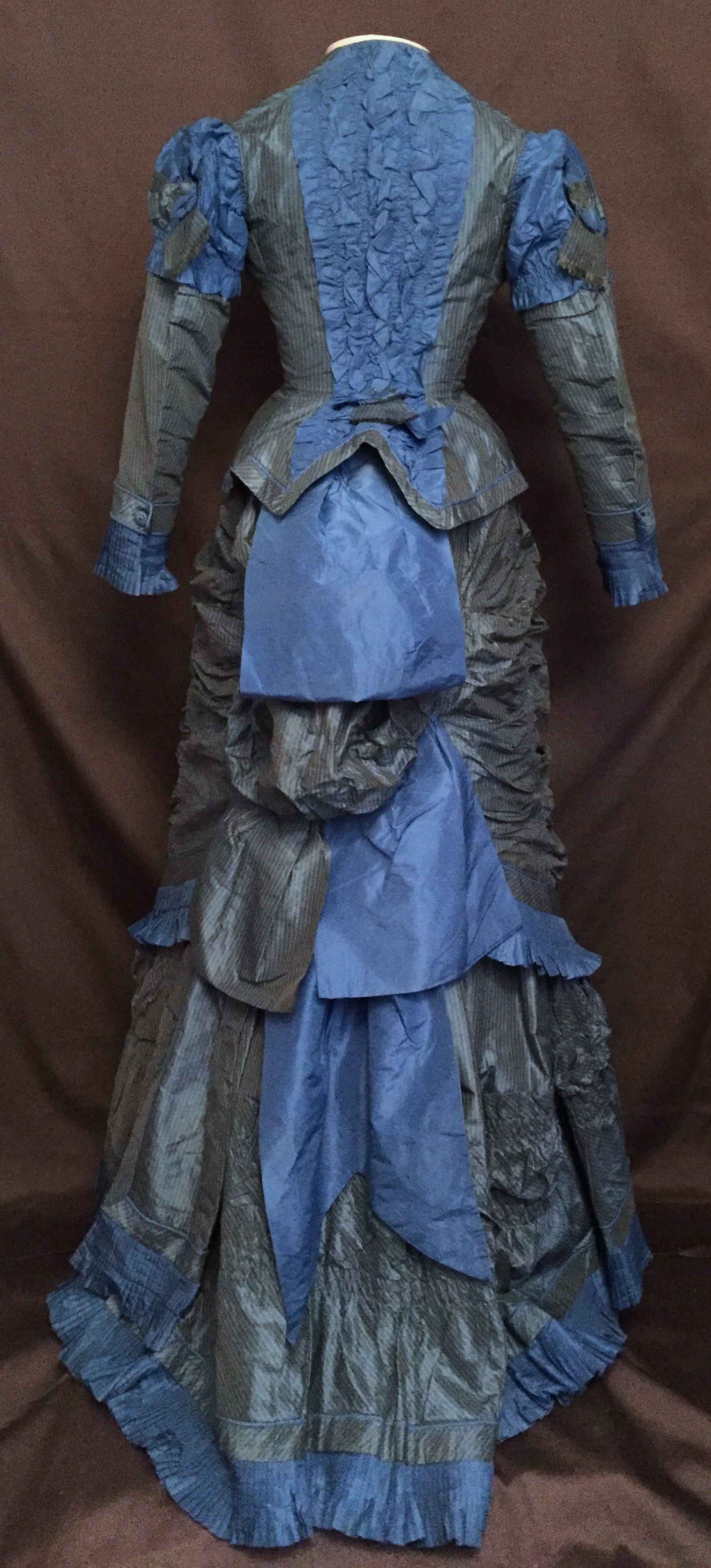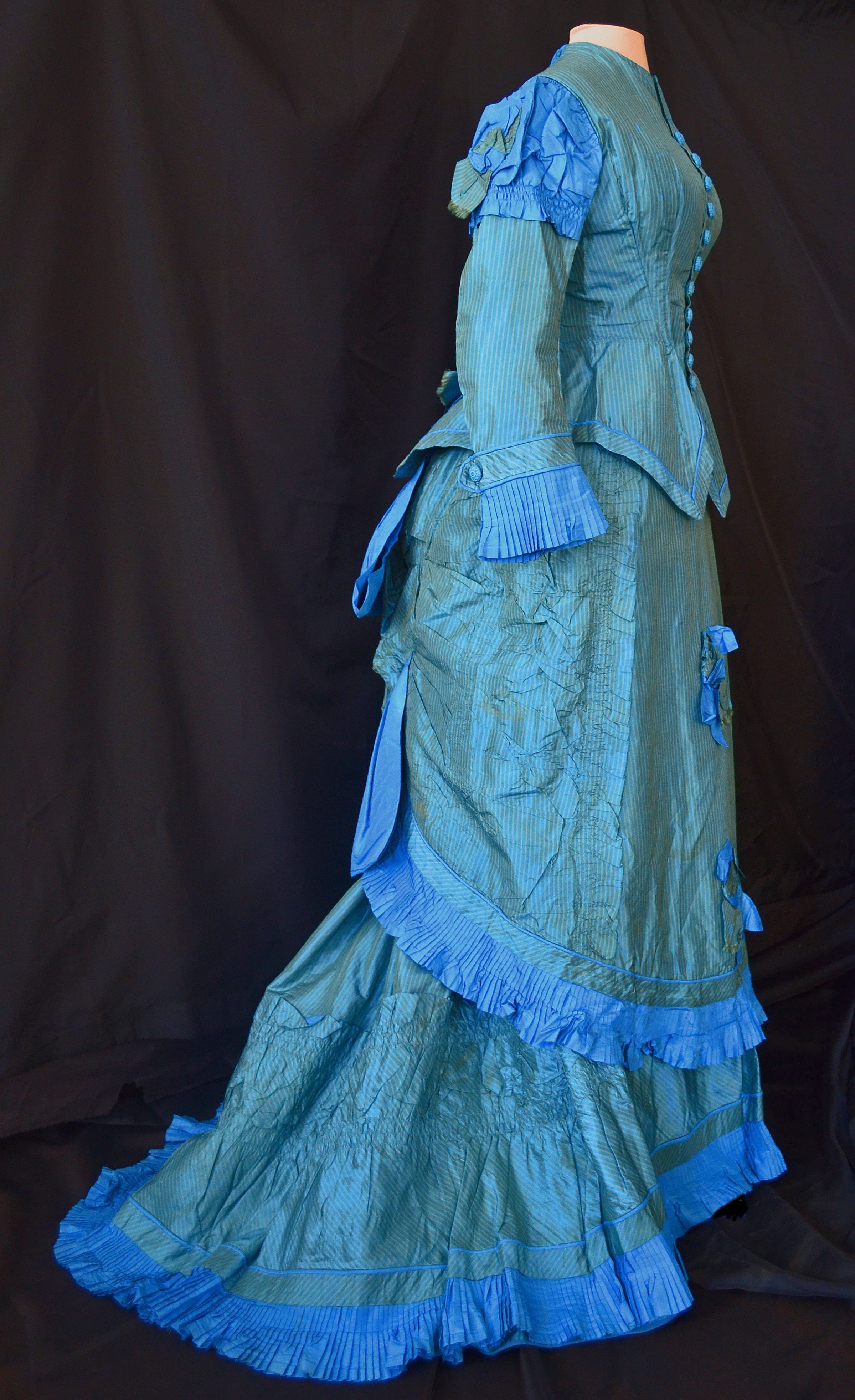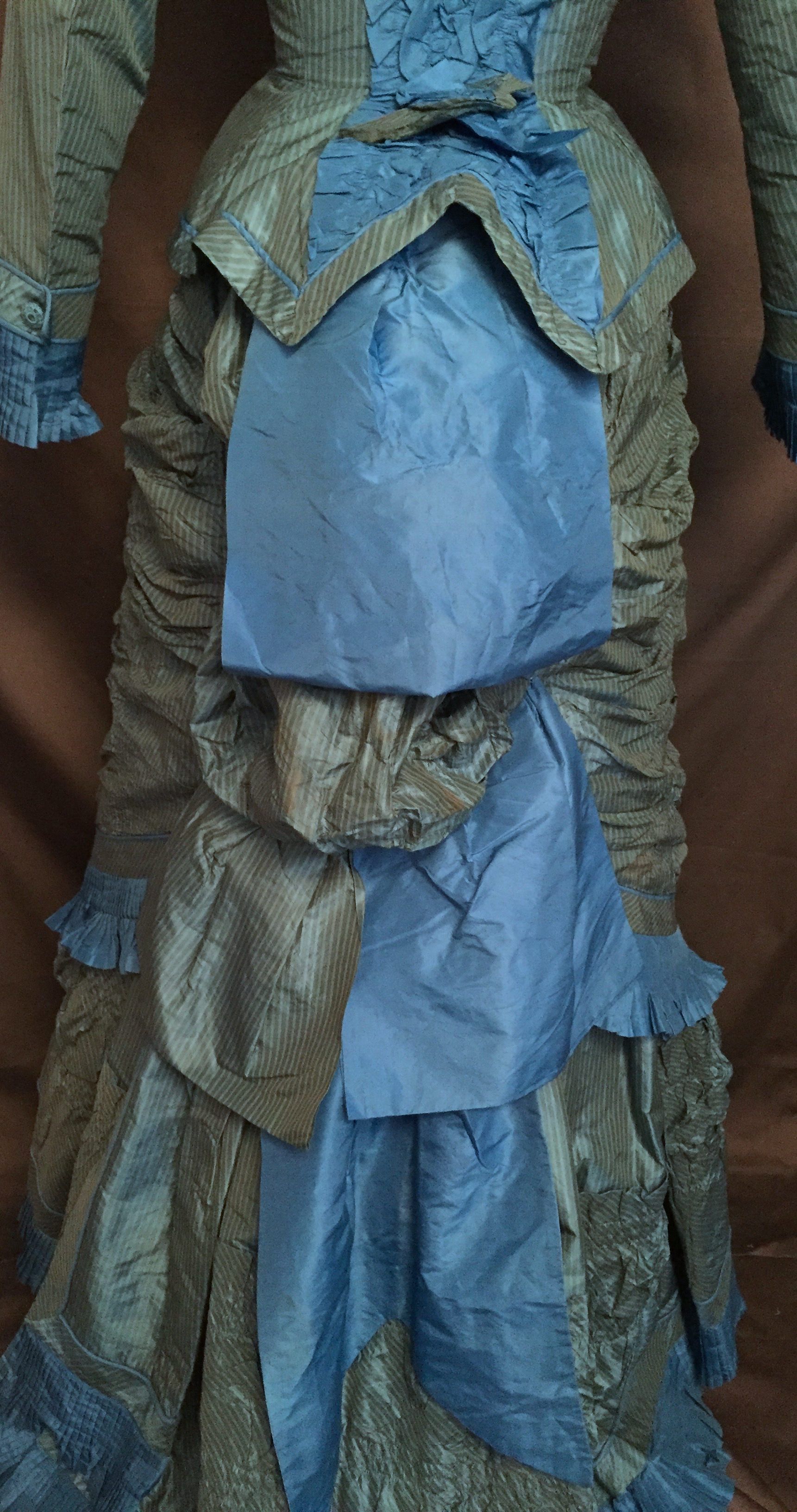 The dress is the height of fashion for 1875, with its double skirts drawn close against the body in front and lifted into a bustle in back. The patterned silk of the main dress is set off by a vibrant peacock silk used to finish hems with tight knife-pleated ruffles. It also forms ruched elements on the sleeves and center back of the bodice, and flows down the bustle into the train in a large stylized bow. The patterned silk also plays a role in embellishing the dress, used along the bodice, cuffs, and skirt hems in a bias-cut bound edge that is itself outlined with piping made of the peacock silk. The fullness of the overskirt is drawn in with vertical ruches that gently gather up the fabric as it approaches the bustle in back.