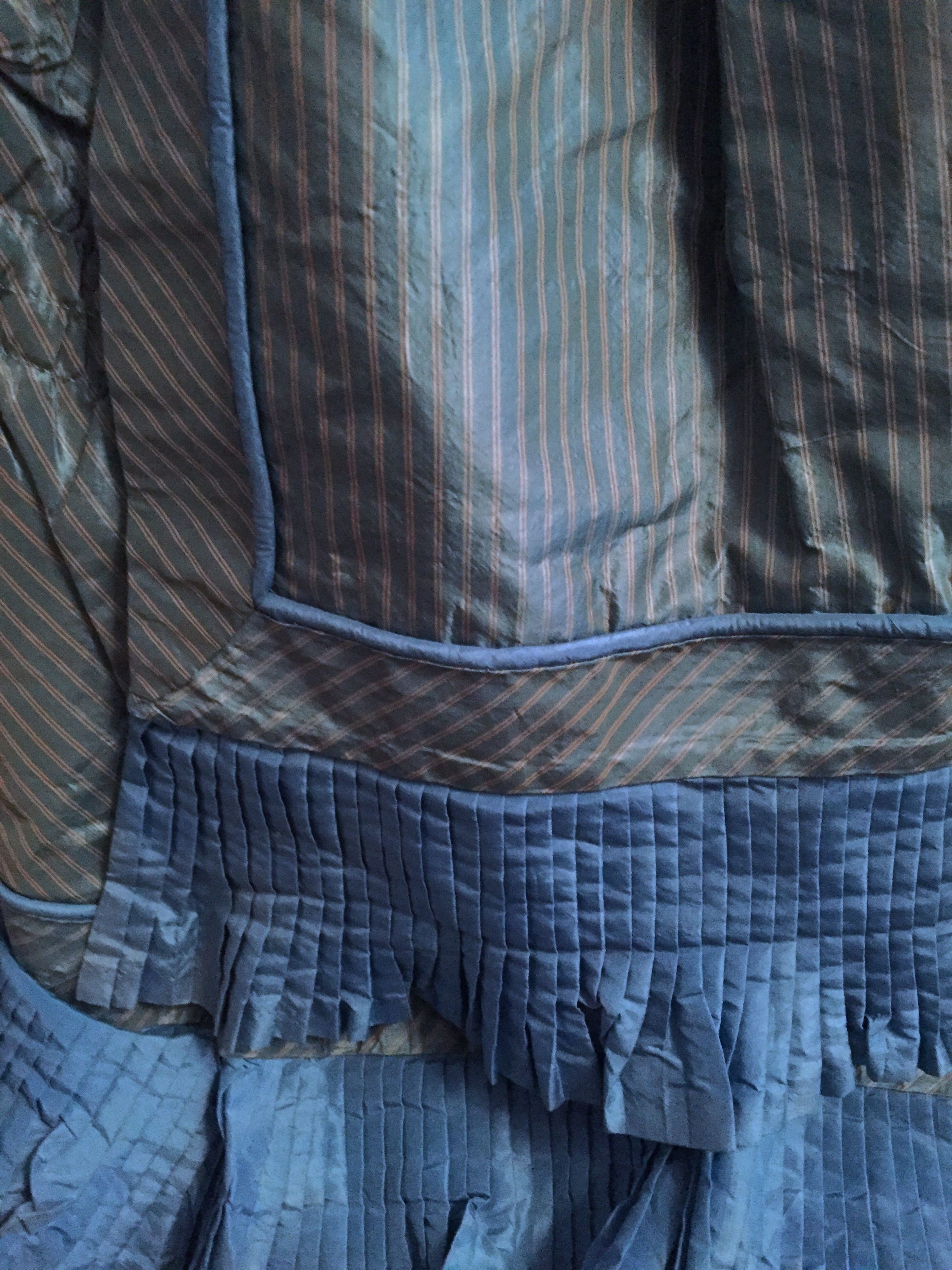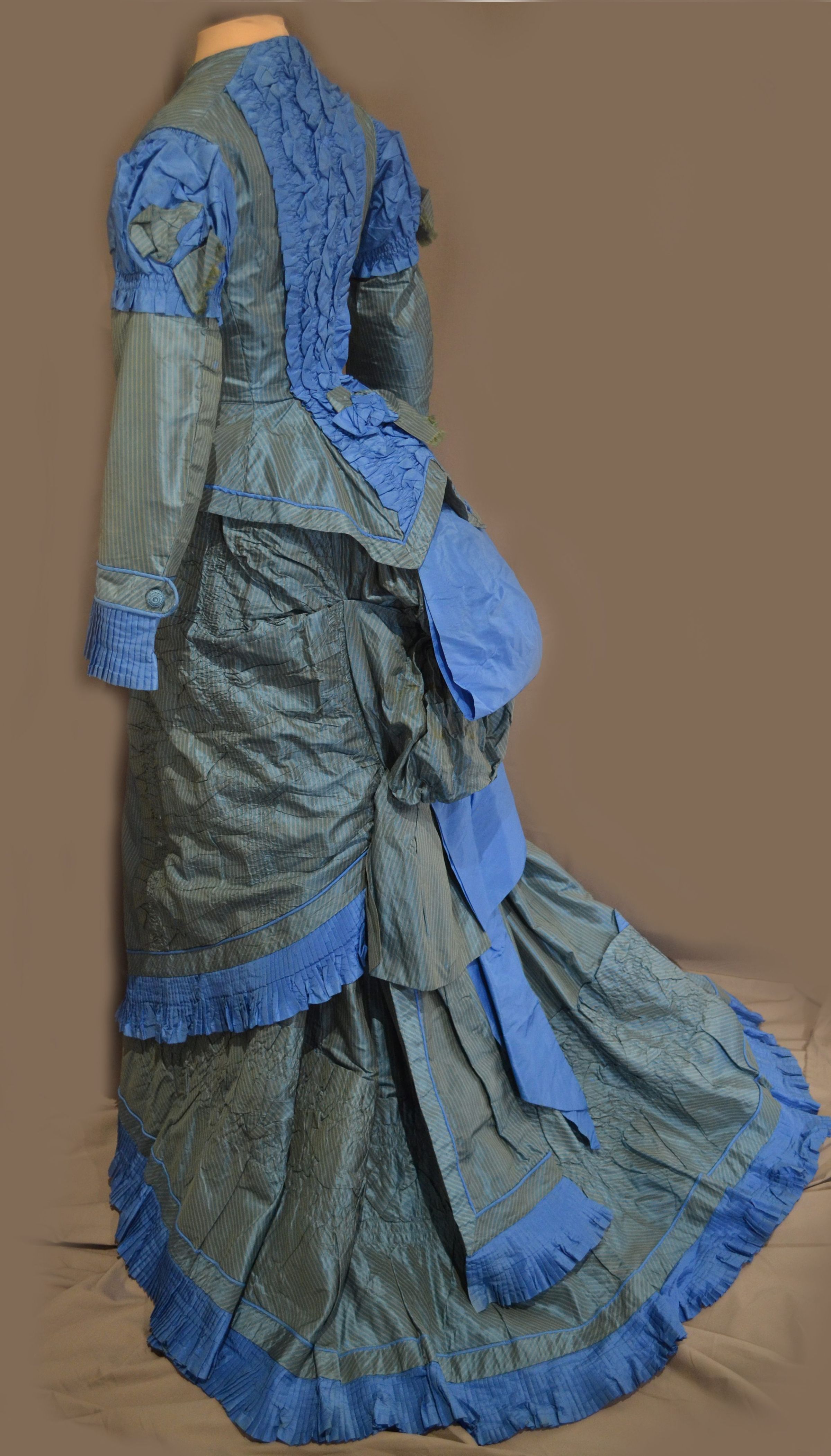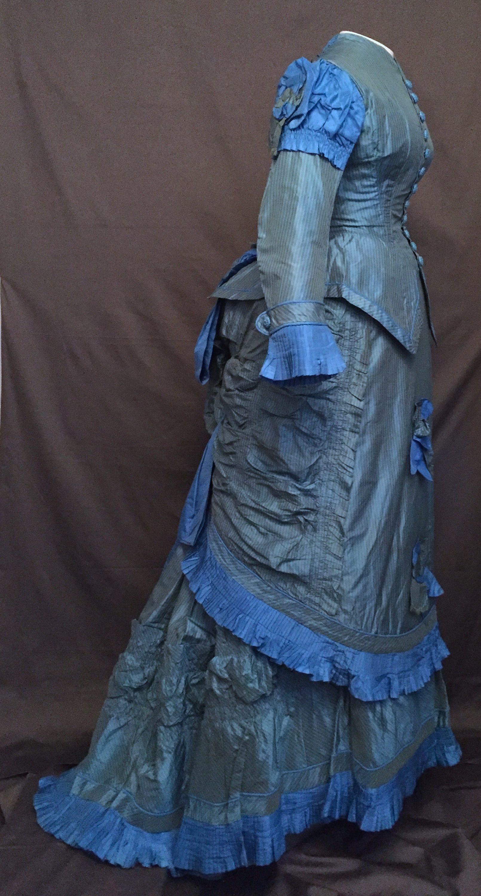 The dress is the height of fashion for 1875, with its double skirts drawn close against the body in front and lifted into a bustle in back. The patterned silk of the main dress is set off by a vibrant peacock silk used to finish hems with tight knife-pleated ruffles. It also forms ruched elements on the sleeves and center back of the bodice, and flows down the bustle into the train in a large stylized bow. The patterned silk also plays a role in embellishing the dress, used along the bodice, cuffs, and skirt hems in a bias-cut bound edge that is itself outlined with piping made of the peacock silk. The fullness of the overskirt is drawn in with vertical ruches that gently gather up the fabric as it approaches the bustle in back.
