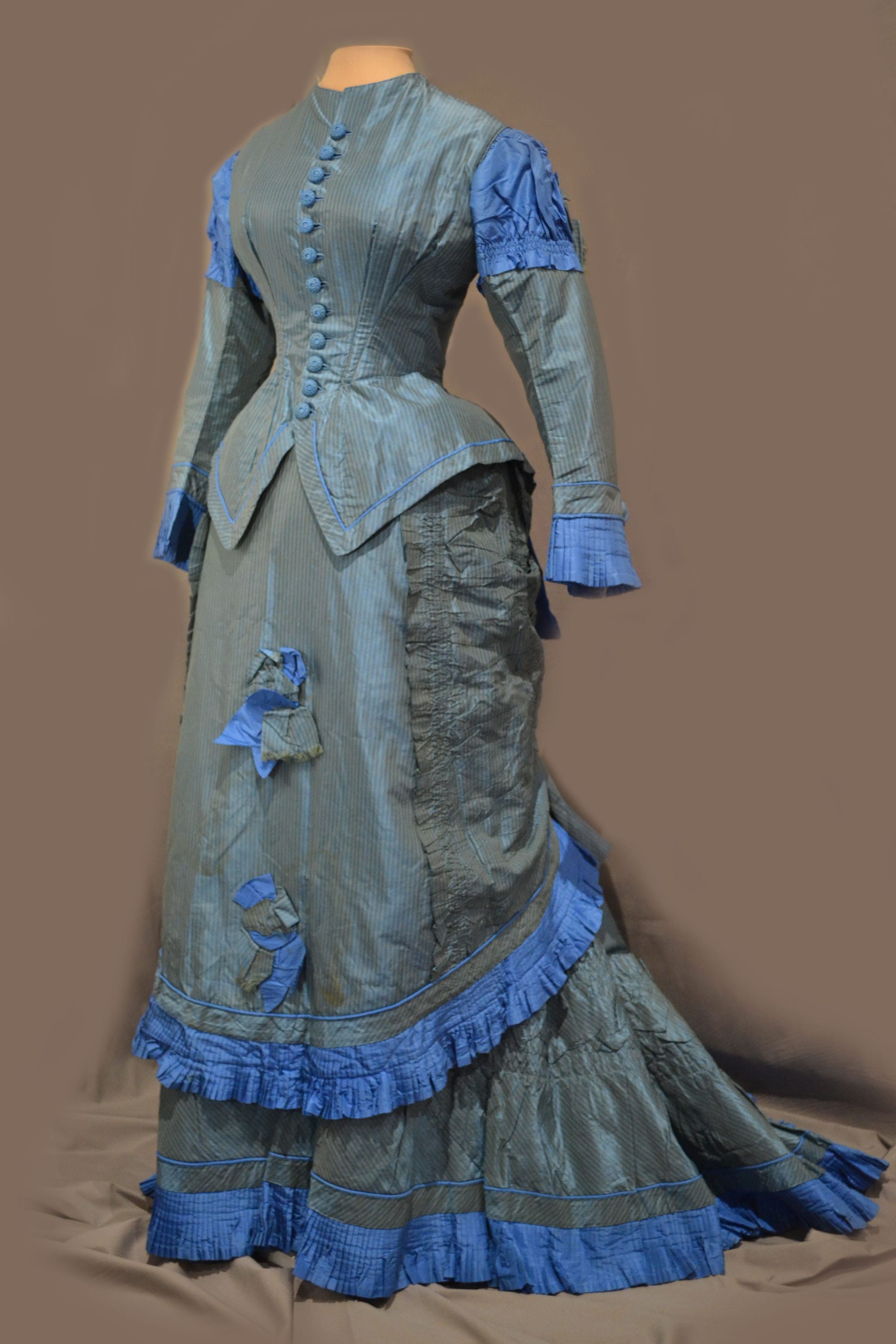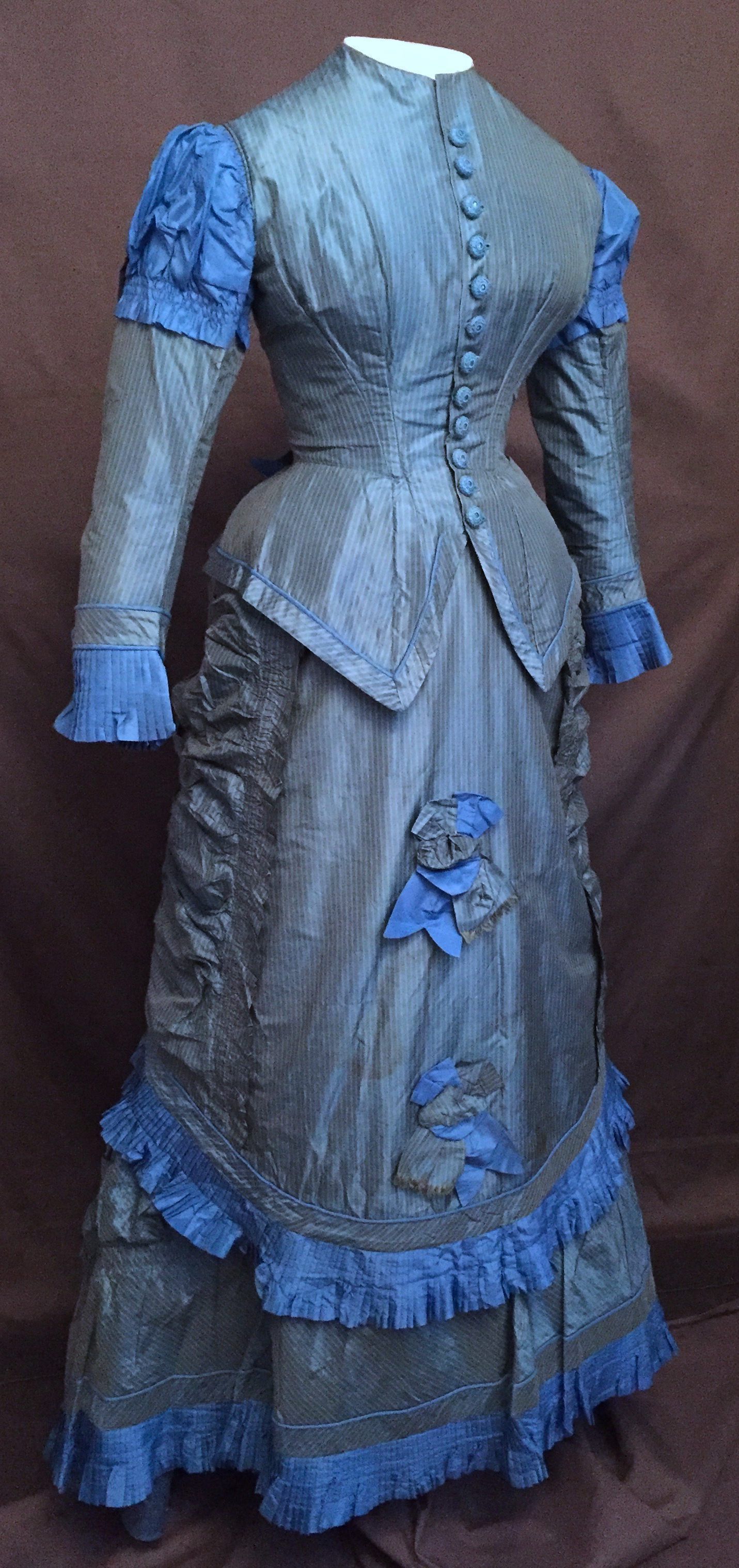 In the mid-1860s, the fullness of the wide skirts started to move towards the back, causing the sides to draw in and creating an elongated narrow profile from the front—a radically different silhouette from that of the previous decade. In the 1870s, the back fabric was held up by a pad of fabric or a frame, known as a bustle. This garment exhibits all of the elements of a fashionable day dress at mid-decade: it is composed of two complementary colored and patterned silk fabrics, has an apron-like overskirt at the front, a poufy bustle ending in a short train in the back, and is decorated with ruching and rows of small knife-pleated trim. The intense shade of peacock blue in this garment was achieved using one of the new aniline dyes, first discovered in 1856. Silk took the bright colors especially well, with an intense, glossy sheen as the end result. According to a hand-written note sewn inside the bodice, this dress was made in the spring of 1875 for Susan Hawthorne Flitner while she was living on Beacon Street in Boston. She states that the dress was to be “kept in the family and never to be cut or changed in any way.”Label Type