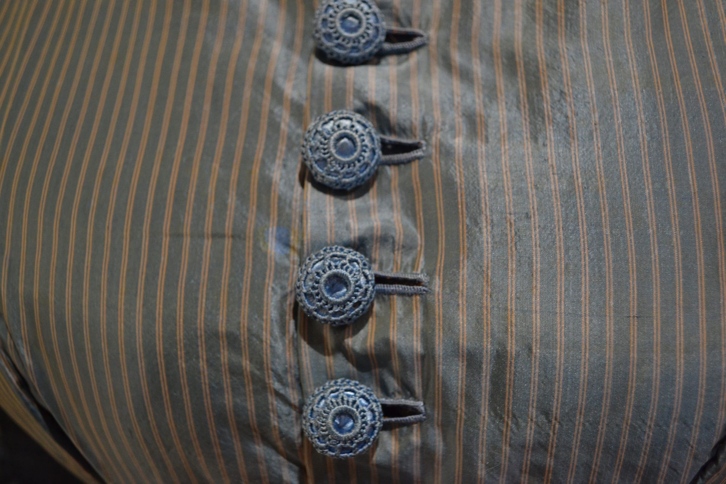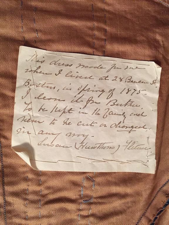 Susan Ellen Hawthorne was born in 1845 in either Richmond or Pittston, Maine, daughter of a storekeeper. She married Pittston-born Francis W. Flitner, who seems to have been from a comfortably well-off family, in Boston in January of 1869. Francis was a merchant and the couple lived in Boston boarding houses for most of their married lives. Susan had this dress made for herself in 1875 while they lived on Beacon Street, and it was so special to her that she sewed a note to its lining requiring that the dress be “kept in the family and never to be cut or changed in any way.”