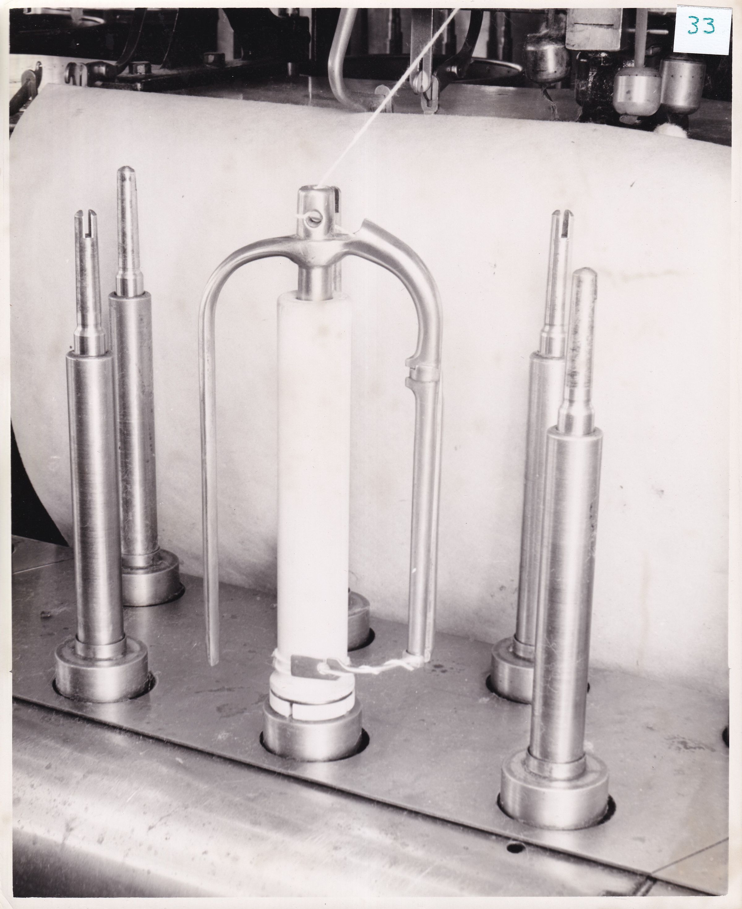 Close-up of flyers showing how the thread wound through the flyer and onto the bobbins. By adjusting the speed of the bobbin to a different speed than that of the flyer, the engineers and operators could effect the twist to make the thread strong enough for the next step in the process.Made/Created