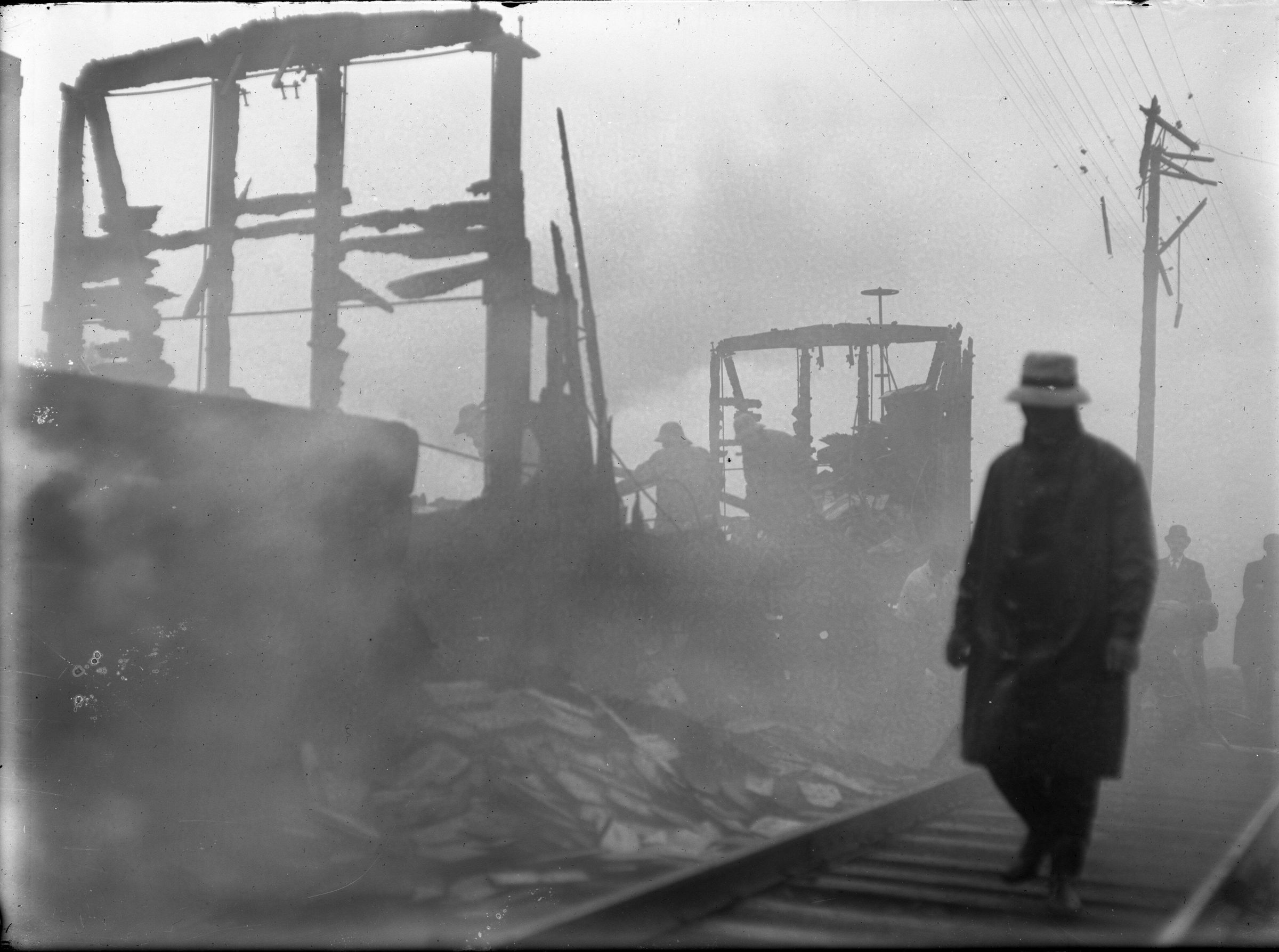 Glass plate negative photo of a man walking on train tracks as fire fighters firefighters labor in the background. The Somesville fire in Saco occurred on September 15, 1908.