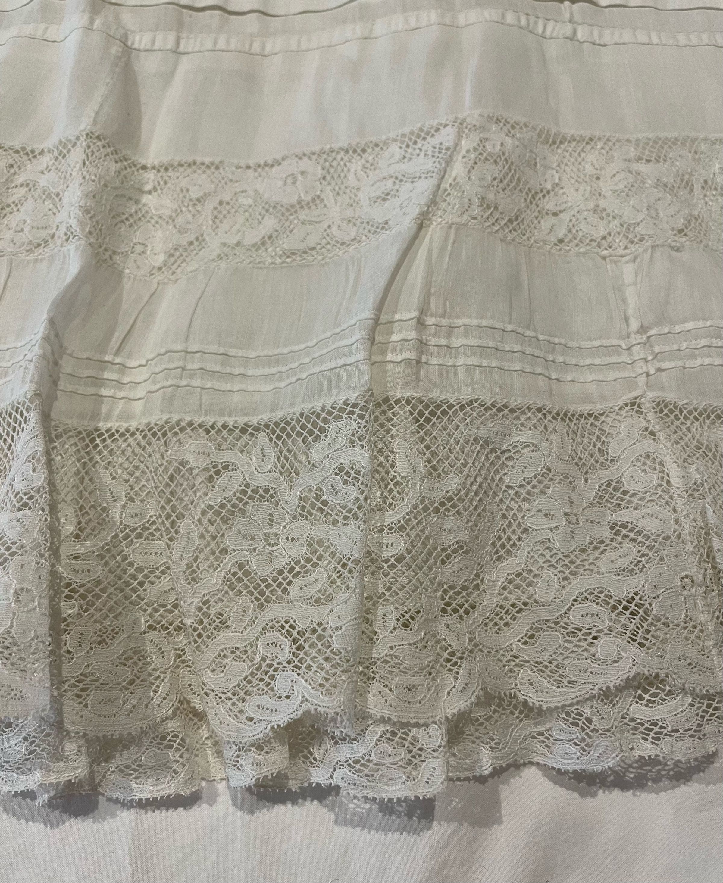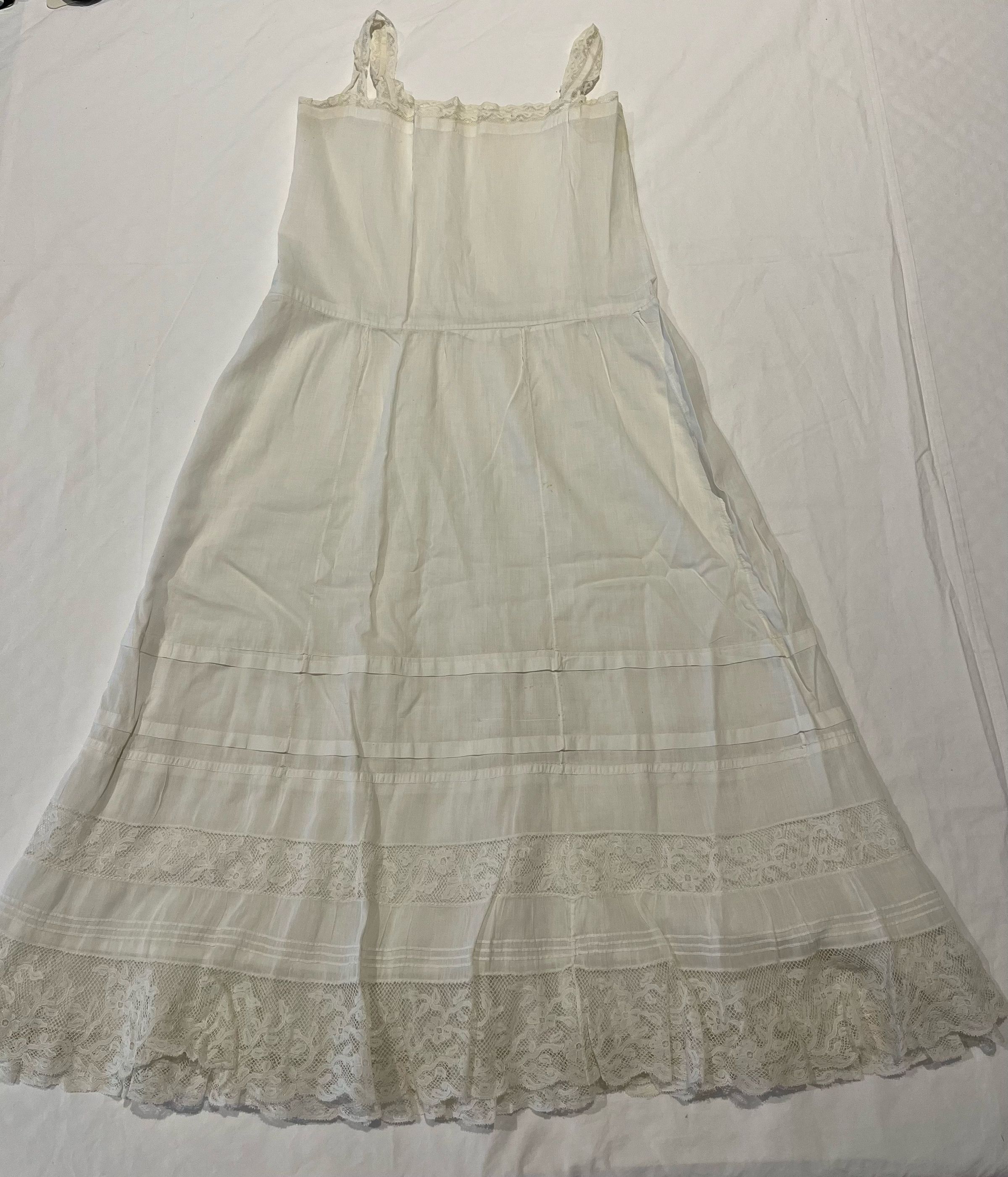 White cotton slip with 1 1/4" lace shoulder straps. There is a casing at the top with a small buttonhole opening at the center front. Straight neckline trimmed with lace. Plain bodice attached to a skirt. The skirt has narrow sleeves all the way around and has two tucks above a double flounce.