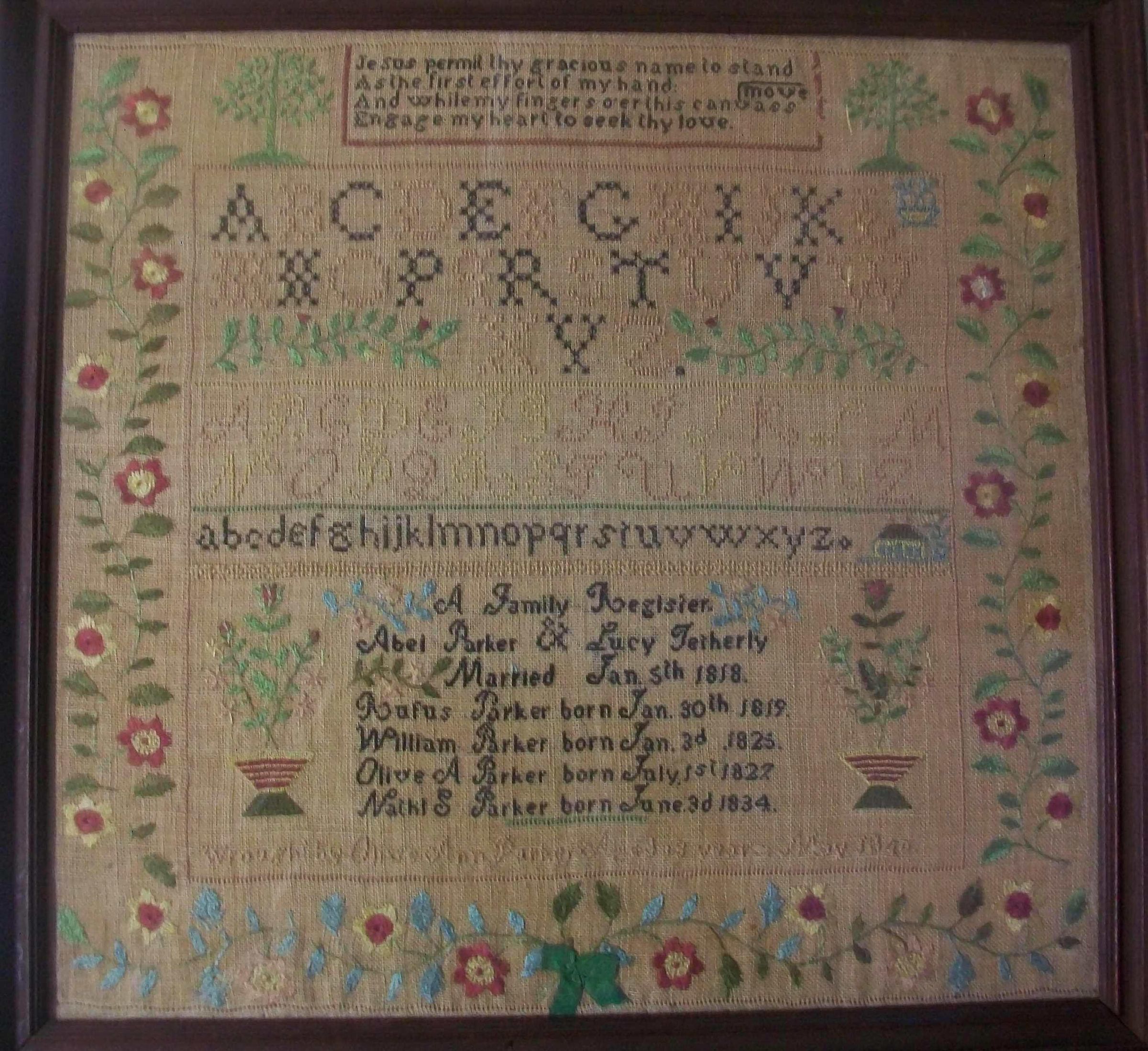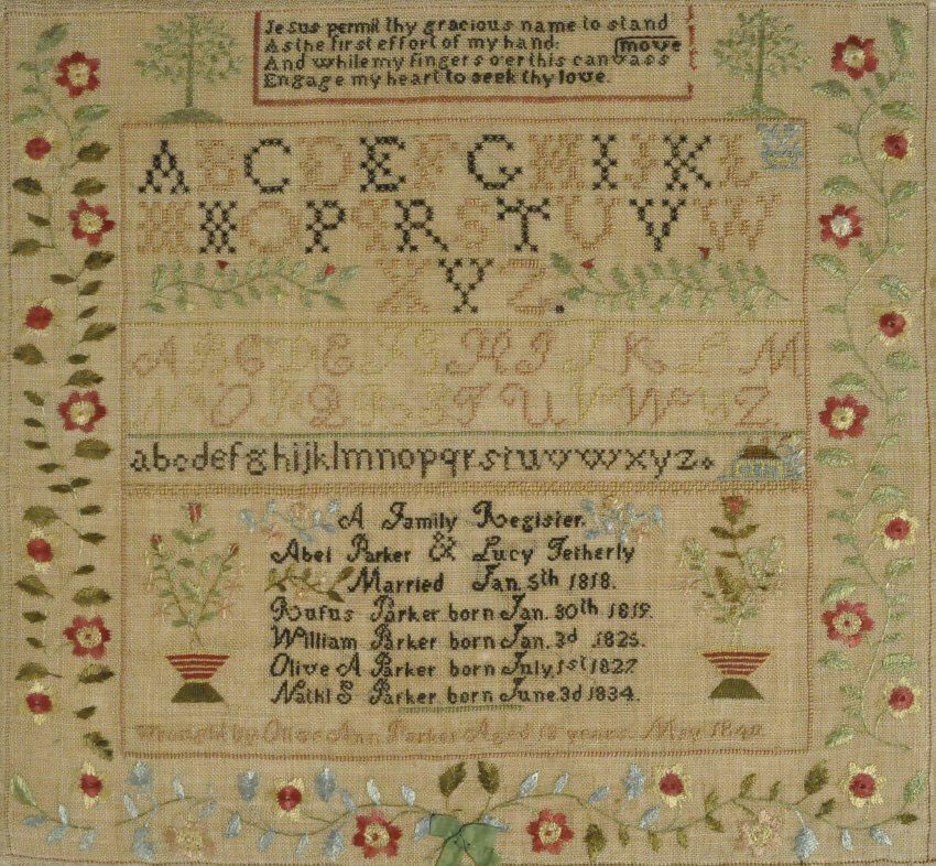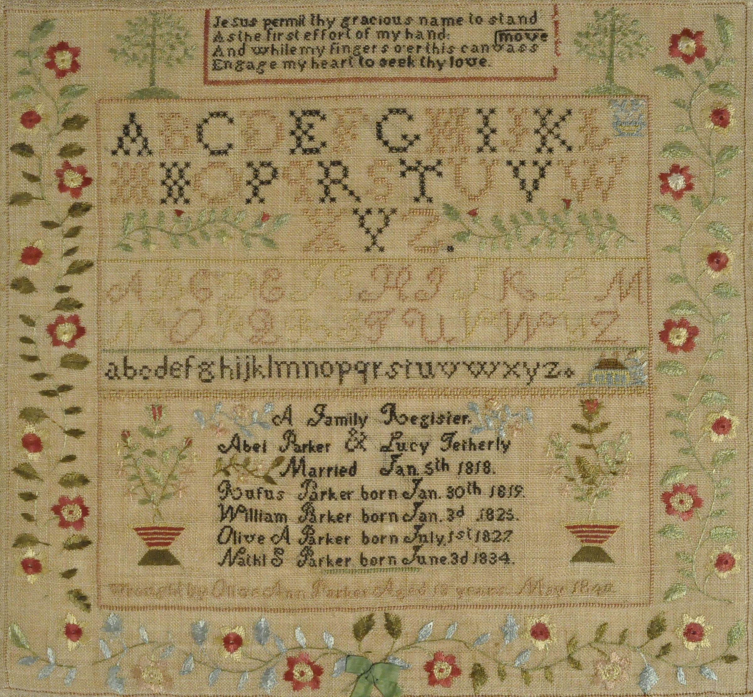 Framed needlework sampler made by Olive Ann Parker when she was 13 years old, May 1840. At the top of sampler is the verse: "Jesus permit thy gracious name to stand, As the first effort of my hand: And while my fingers o'er this canvass move, Engage my heart to seek thy love". Beneath the verse are three sets of the alphabet and a family register. Three sided border of colorful flowers and vines (no border at the top) with a small silk bow at the center bottom. Worked in silk thread in linen in cross, satin, outline, and straight stitches. The register reads: