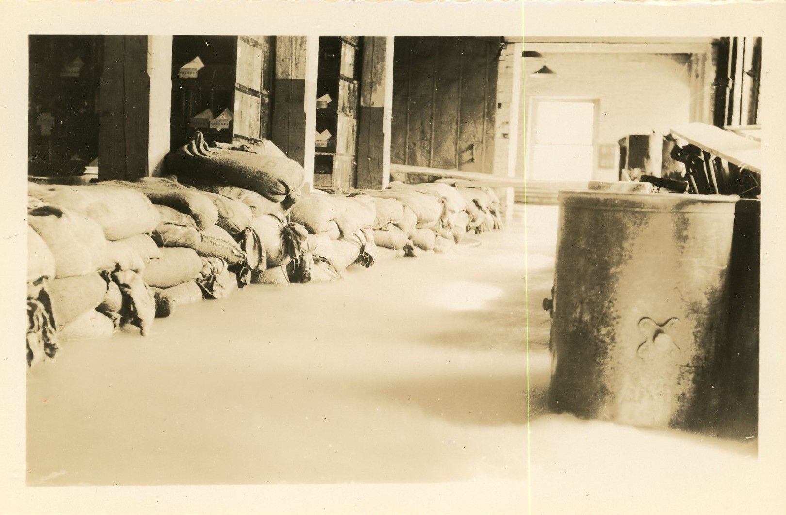 Black and white print photograph of Saco River flooding in Saco, Maine inside mill building. From the Sawyer House Collection.