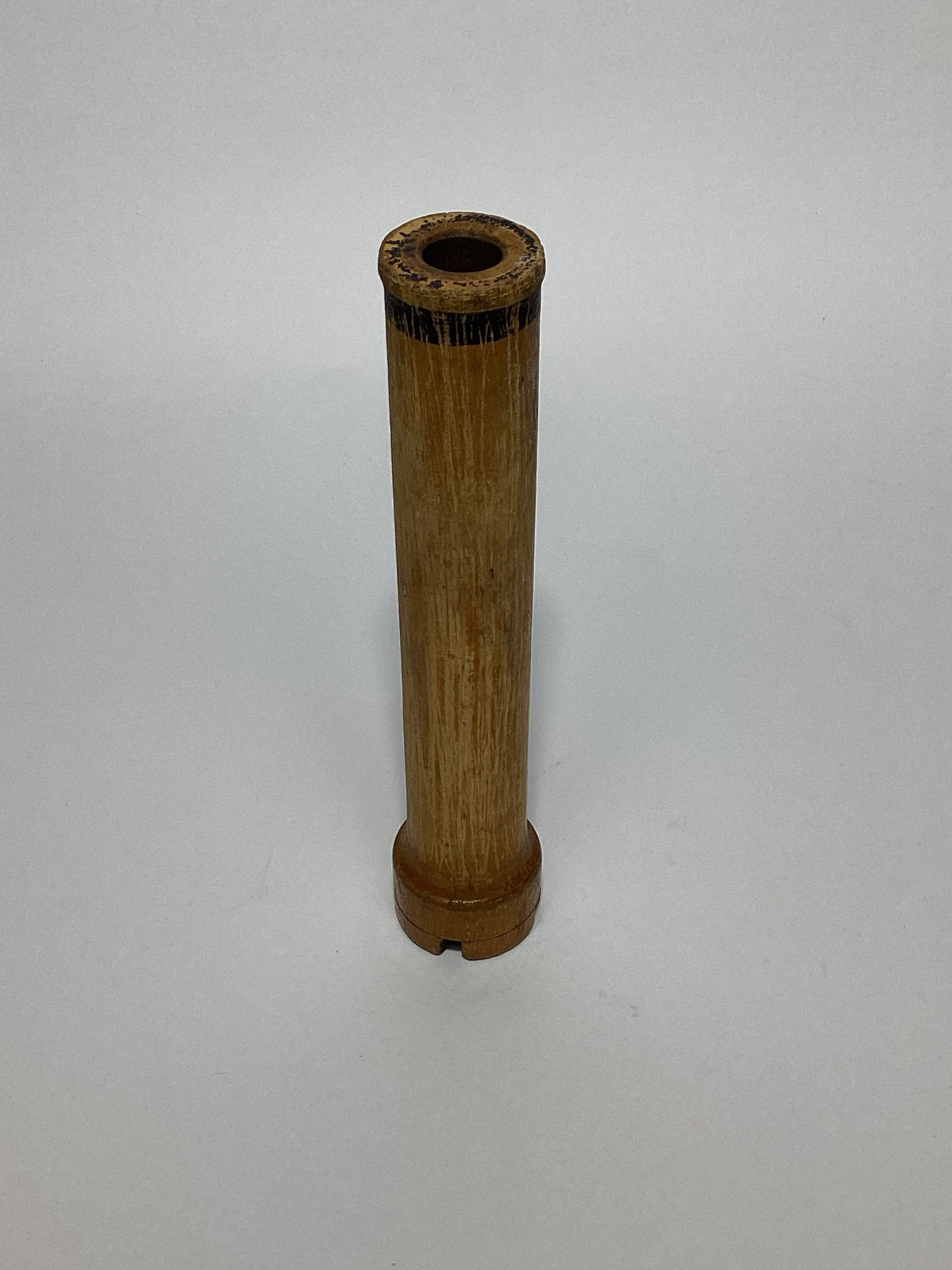 Wooden cotton roving bobbin. The bobbin is cylindrical from the top to near the base where it flares out slightly. The bottom is notched.