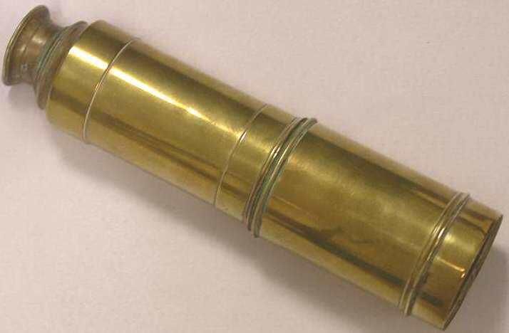 Telescopes are optical devices used to magnify and enhance the view of distant objects. First introduced in the early seventeenth century, they soon became widely sought after by sea captains, military commanders, and astronomers. Most early telescopes were made of brass and mahogany, with two to three smaller brass tube extensions. This brass telescope was owned Captain Tristram Jordan (1798-1856) of Saco, the master of the brig Diligence.