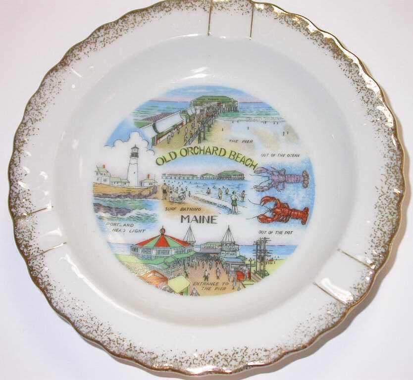 White, souvenir ashtray of Old Orchard Beach, Maine. Six labeled drawings of Old Orchard: Portland Head Light, The Pier, Out of the Ocean, Out of the Pot, Entrance to the Pier and Surf Bathing. Middle of ashtray is labeled "Old Orchard Beach Maine" Gold speckled edging and grooves to hold three cigarettes, raised swirl pattern along edge. Bottom of ashtray has red triangular sticker with "G Nov. Co."Material