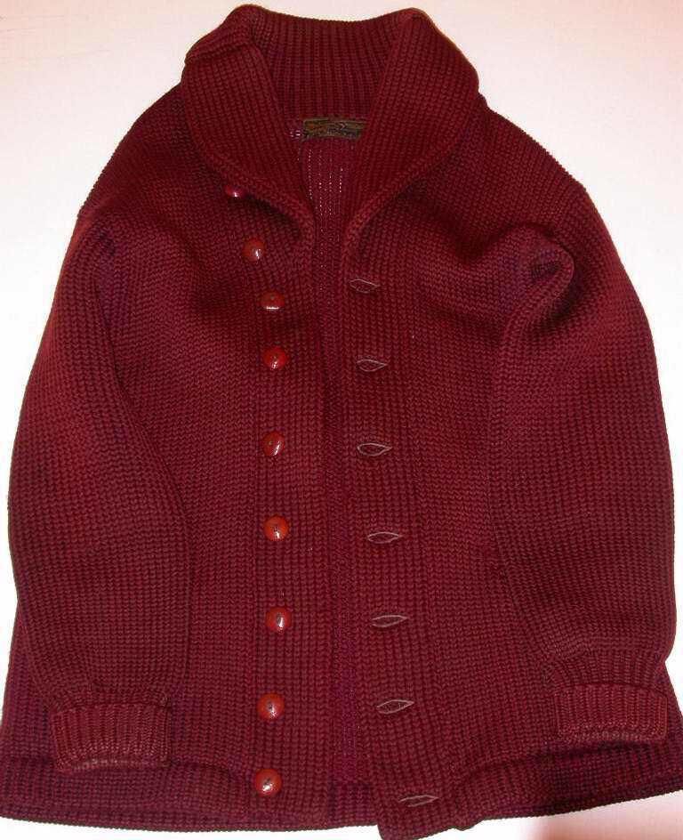 Heavy machine knit maroon sweater. Shawl collar and two front pockets. Closes down the front with nine maroon buttons, the top two held secured by loops rather than button holes. A woven cloth label insider reads: "Oakes Bros. Boston"