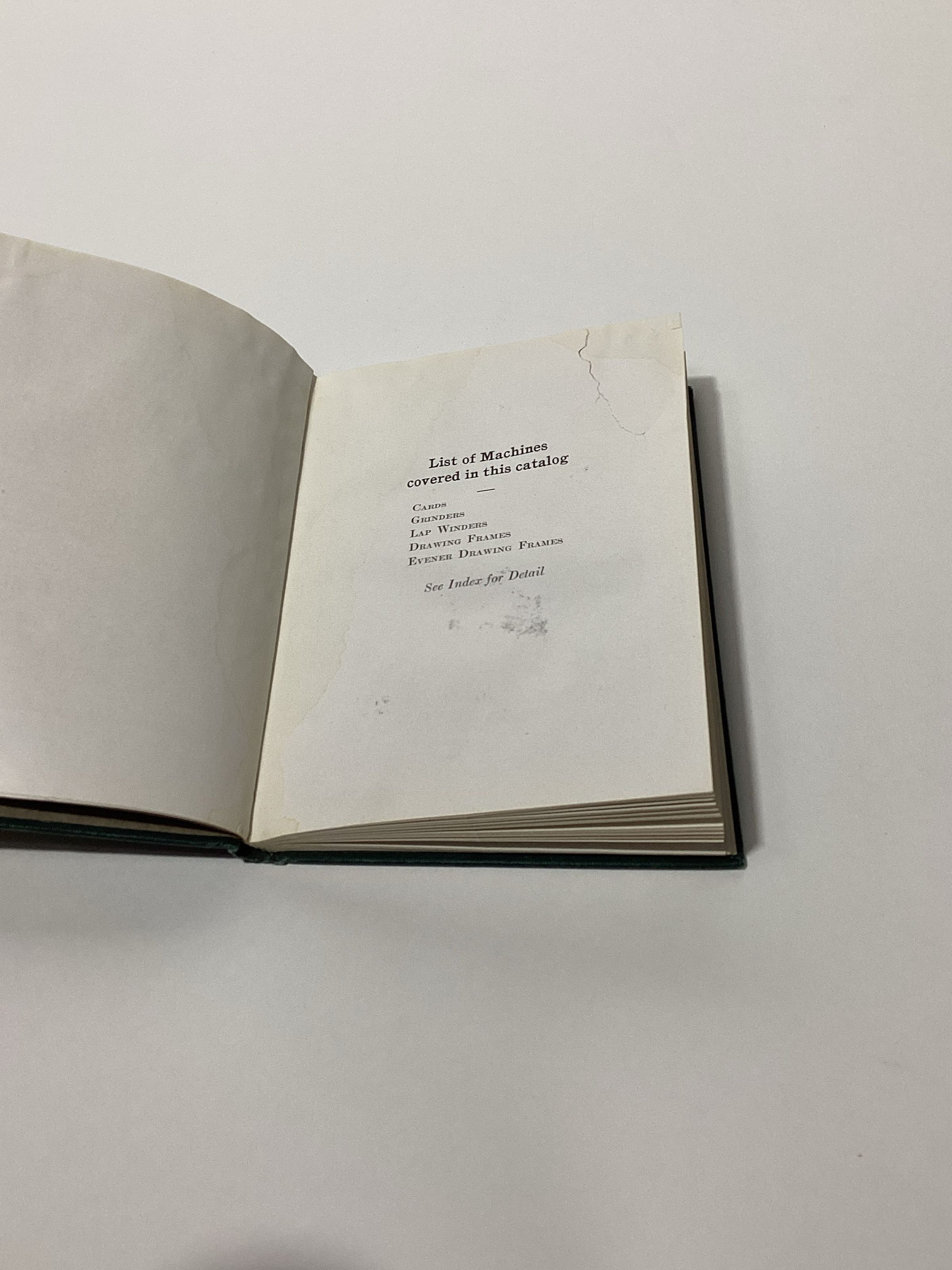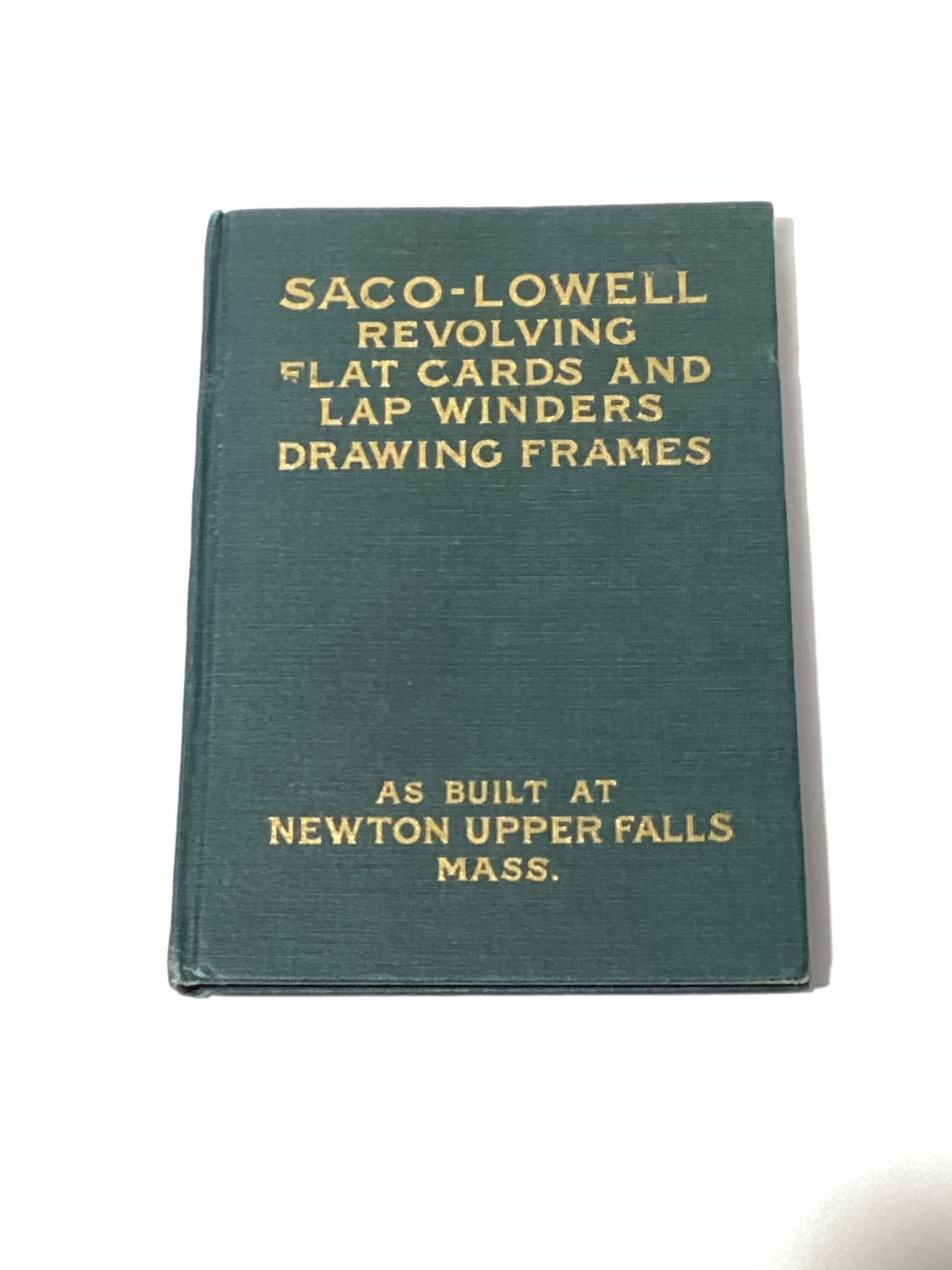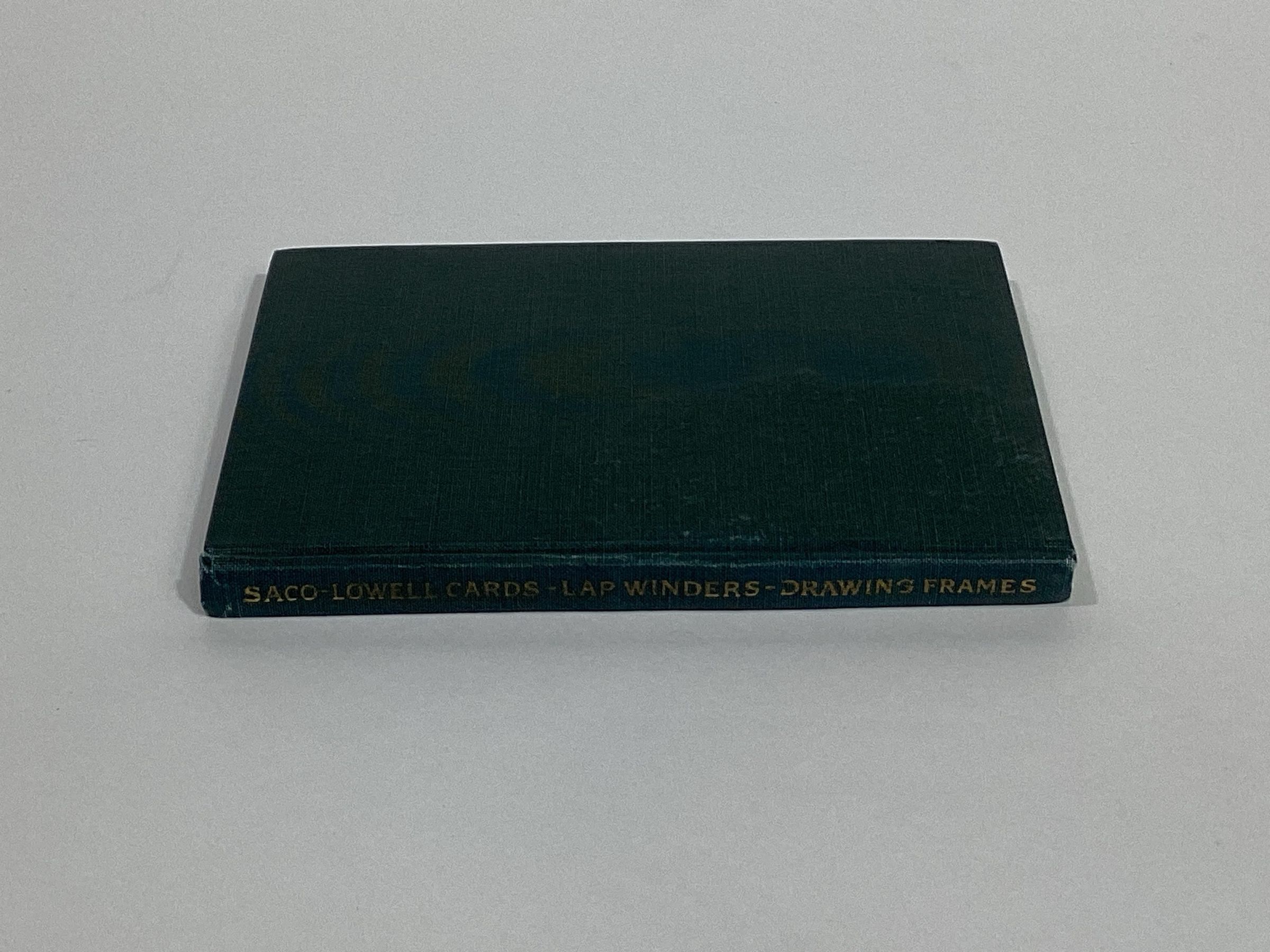 Small book with a green cloth cover with gold lettering on cover and spine. It includes definitions, spindle information, production tables, and other specifications of revolving flat cards, lap winders and drawing frames manufactured by the Saco-Lowell Company.