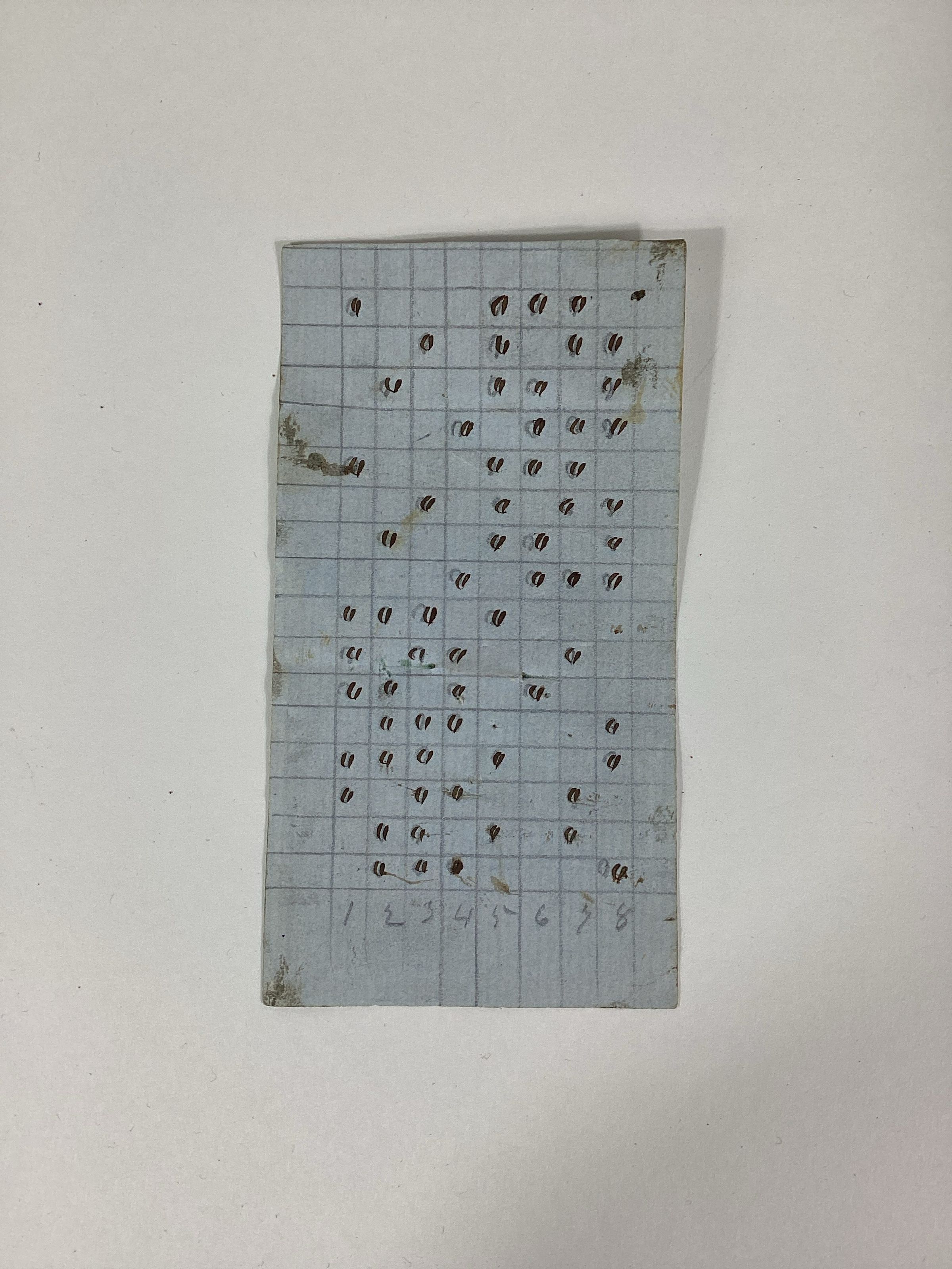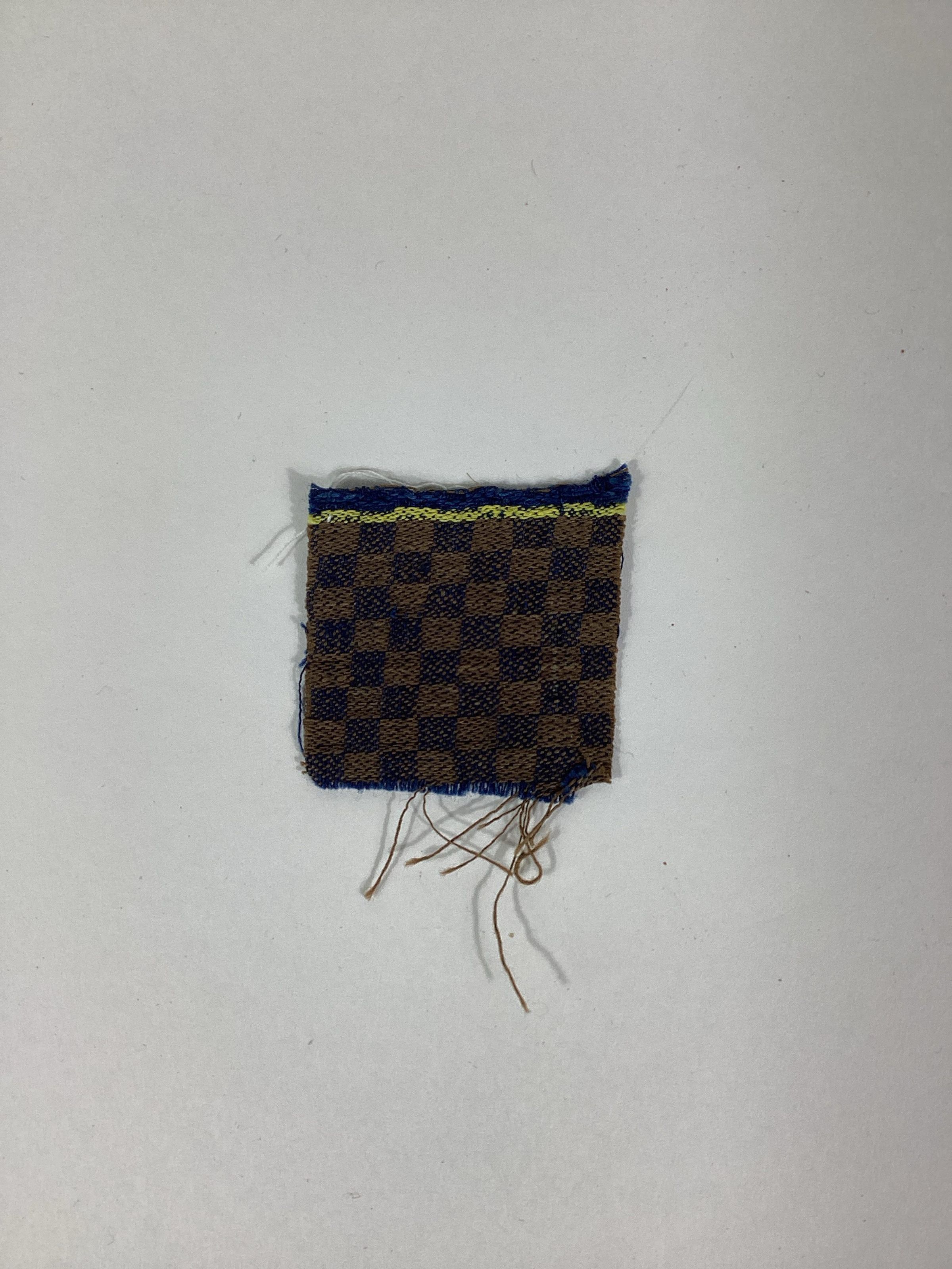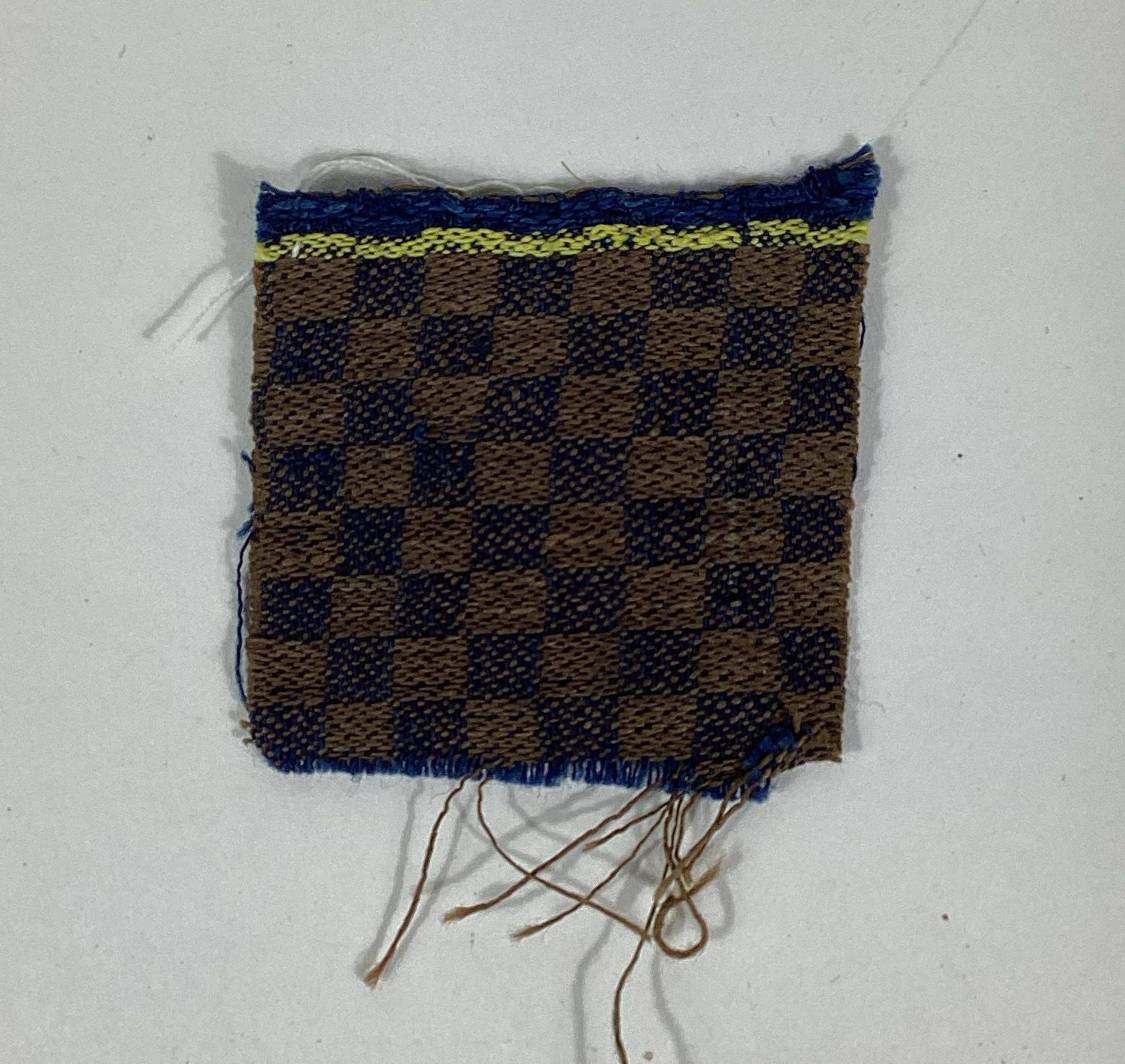 Sample of woven cotton cloth from the York Manufacturing Company with its accompanying weaving draft. Brown and dark blue check pattern with a yellow and blue selvage.Dimensions