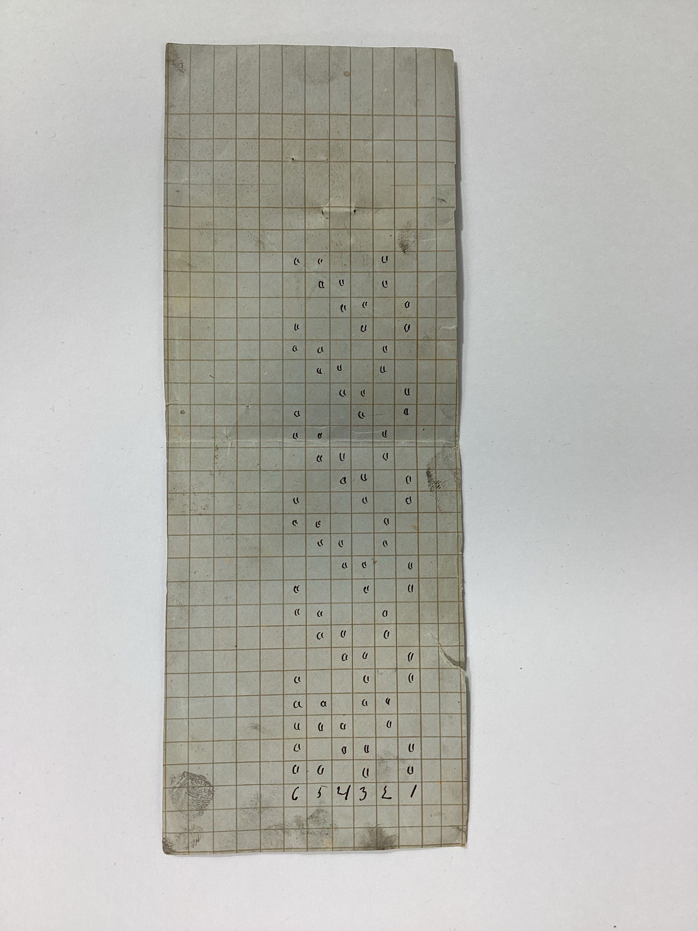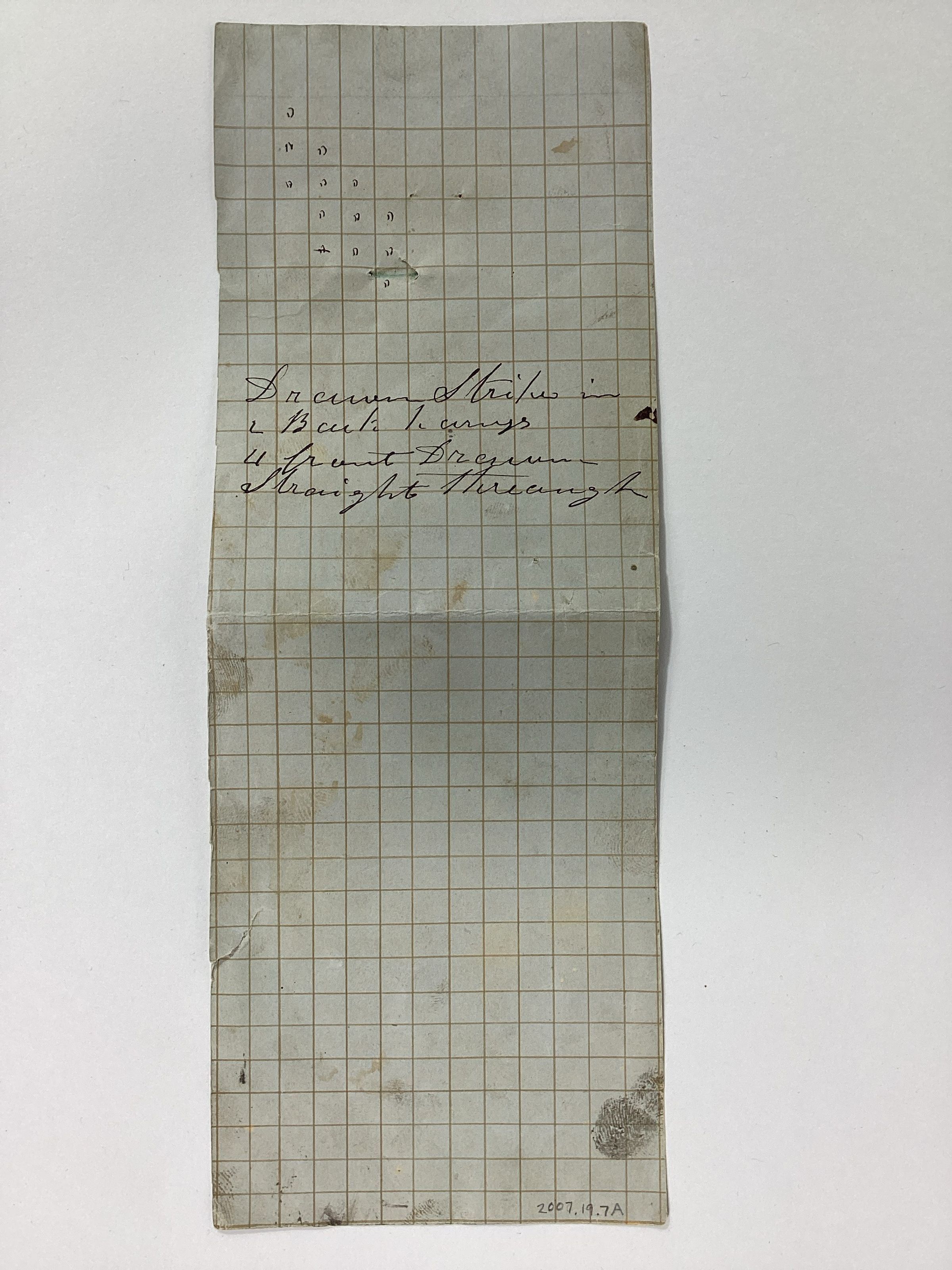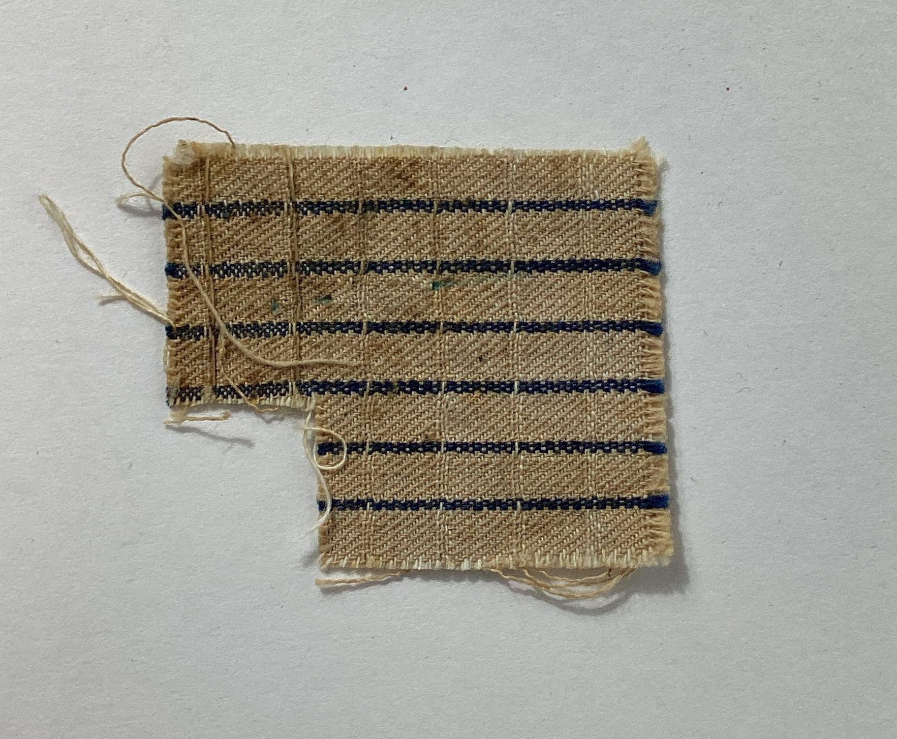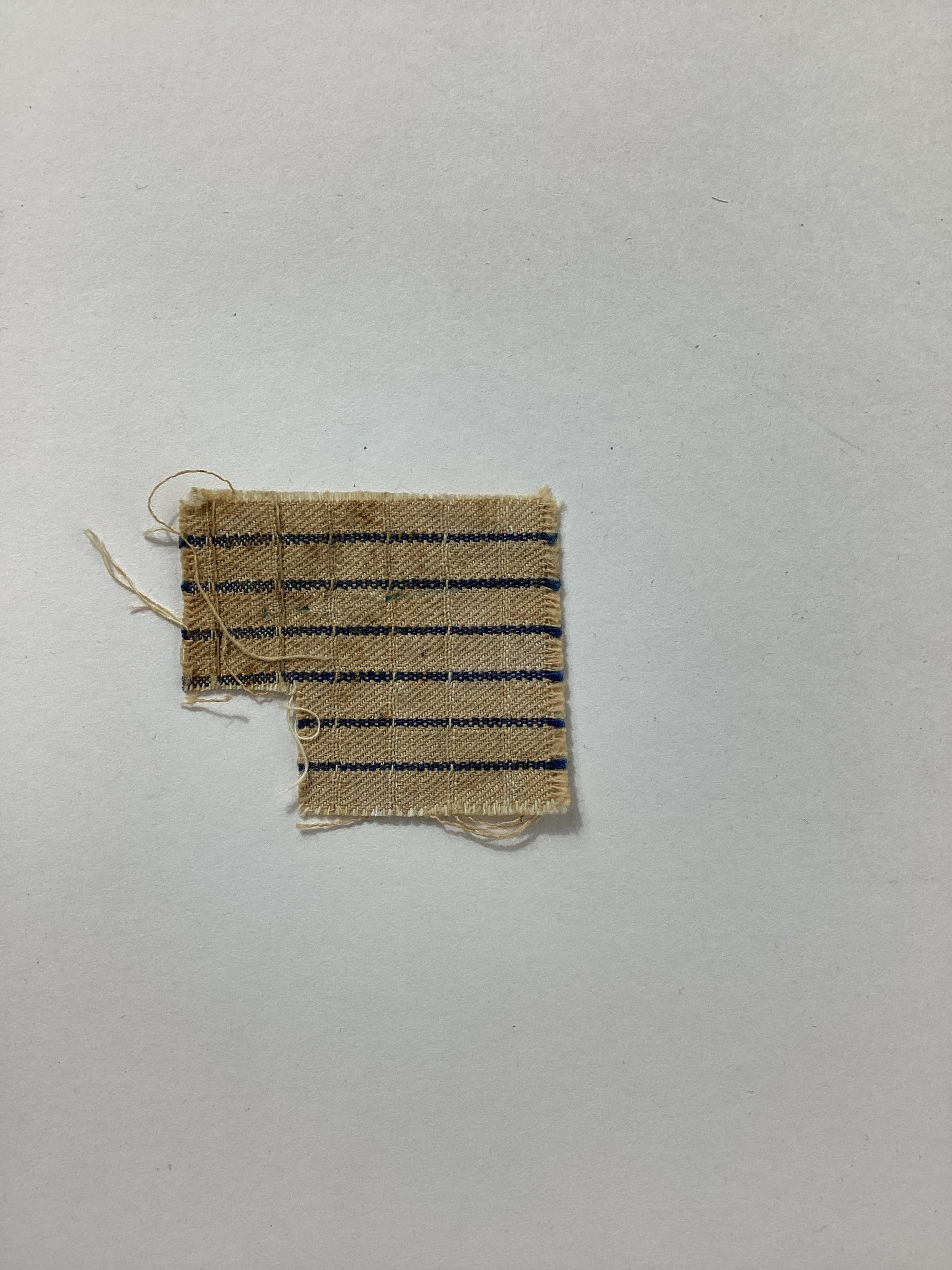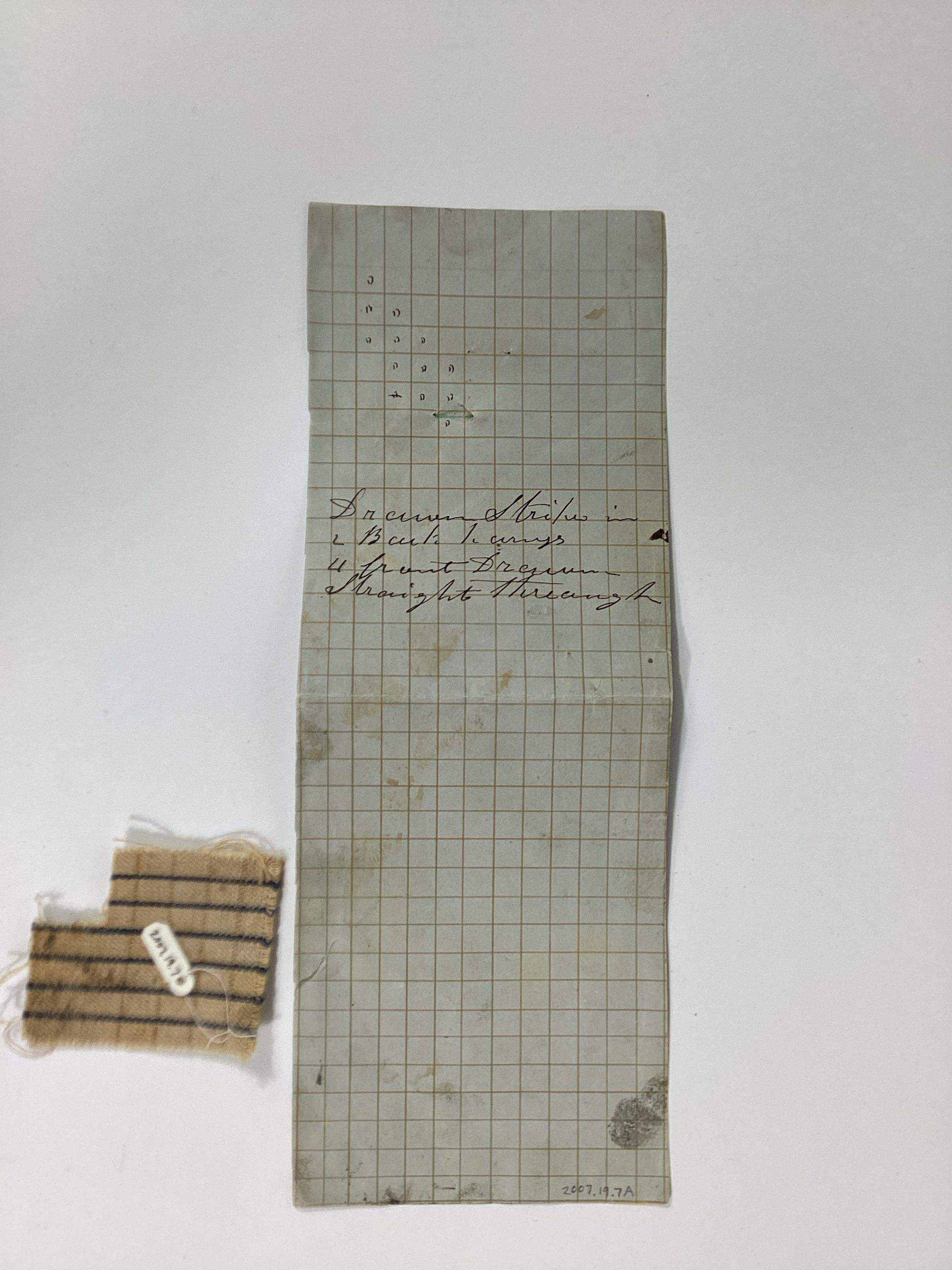 Sample of woven cotton cloth from the York Manufacturing Company with its accompanying weaving draft. Light-weight fabric with a striped pattern in light brown and dark blue. One corner of the square has been cut away.Materials