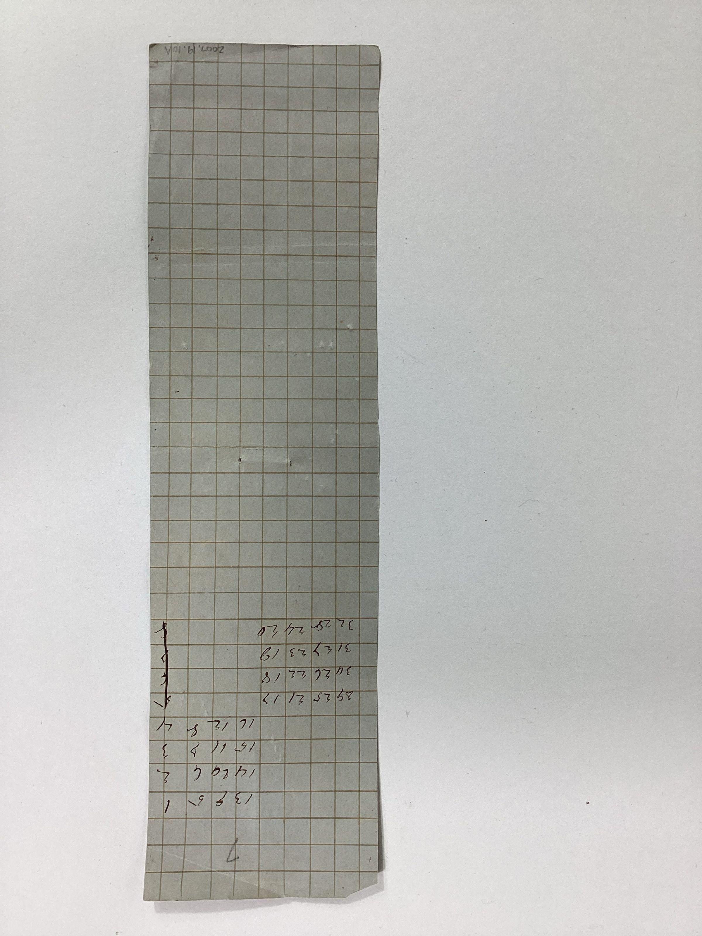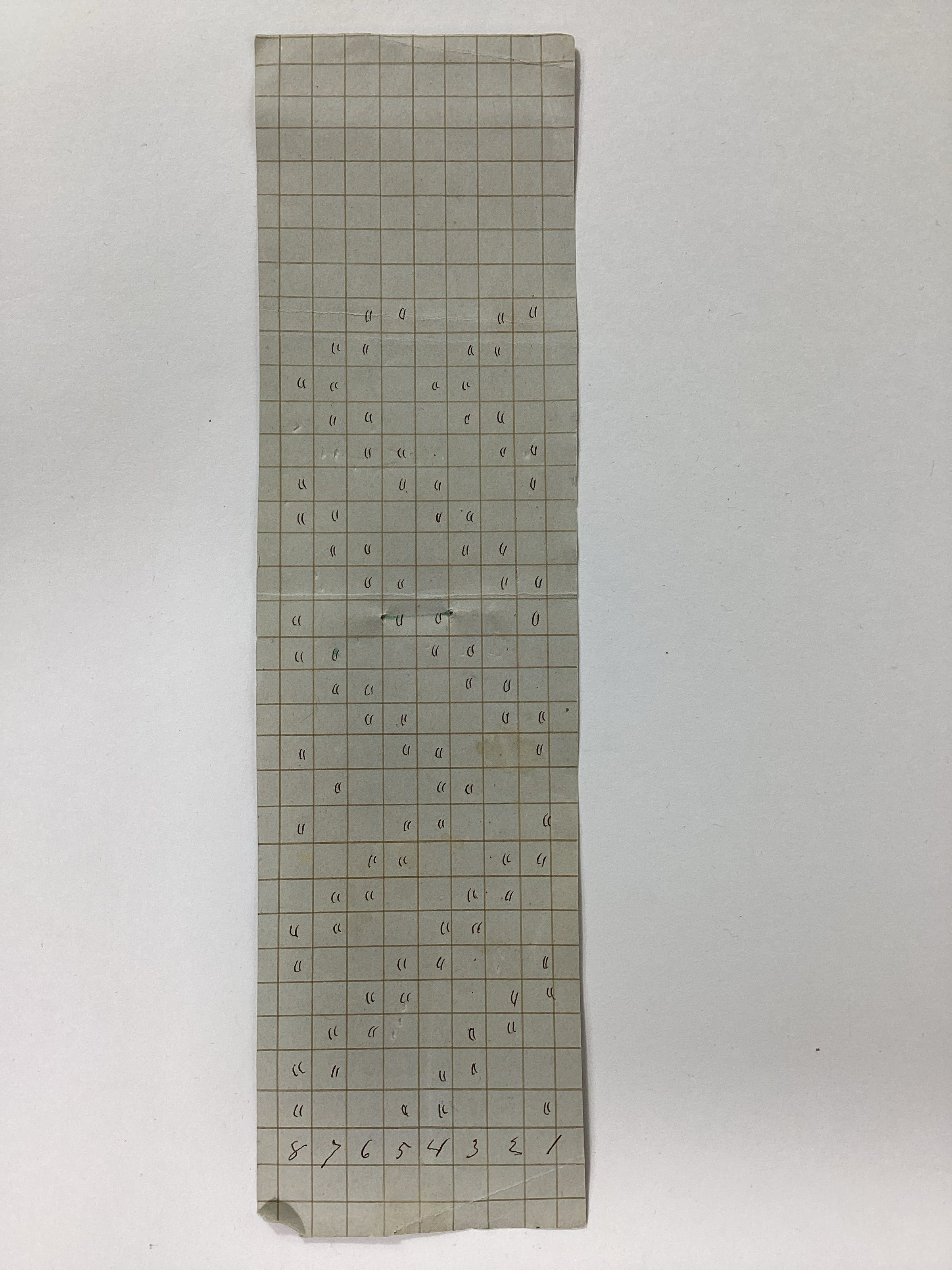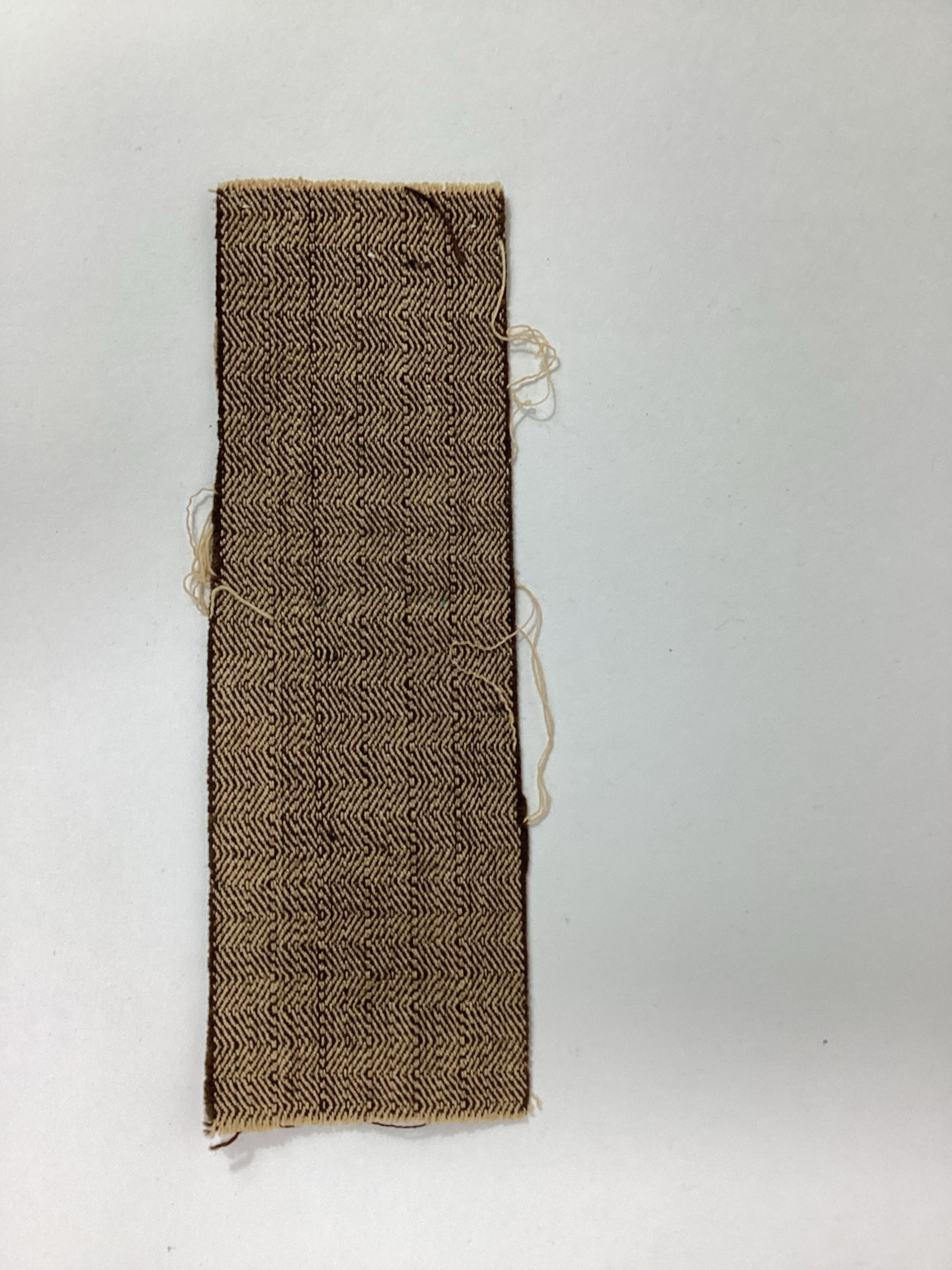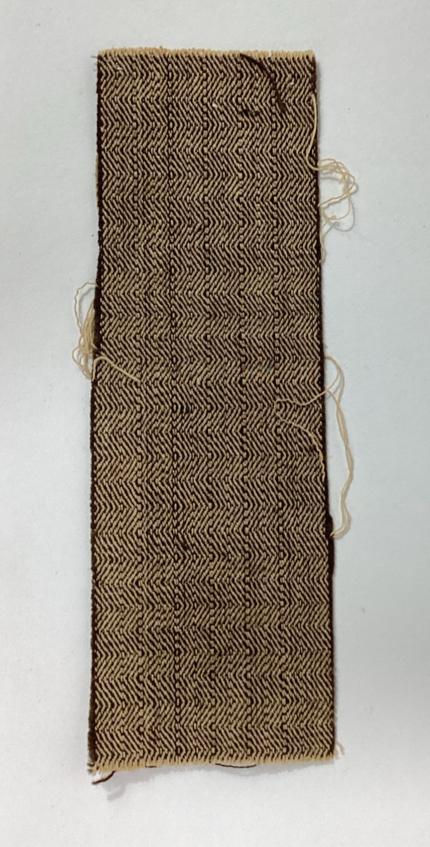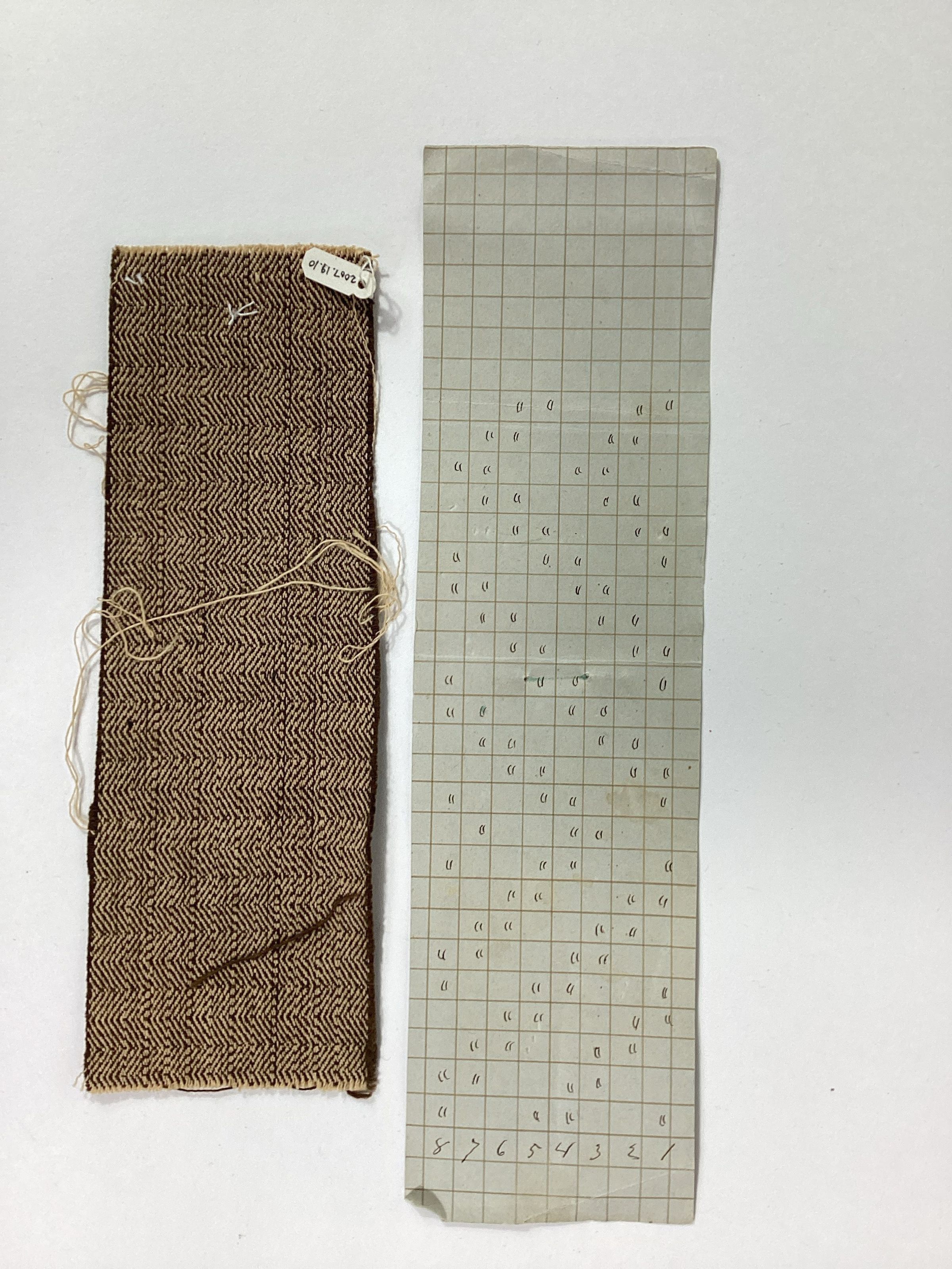 Sample of woven cotton cloth from the York Manufacturing Company with its accompanying weaving draft. Medium-weight fabric in a light and dark brown alternating diagonal design.