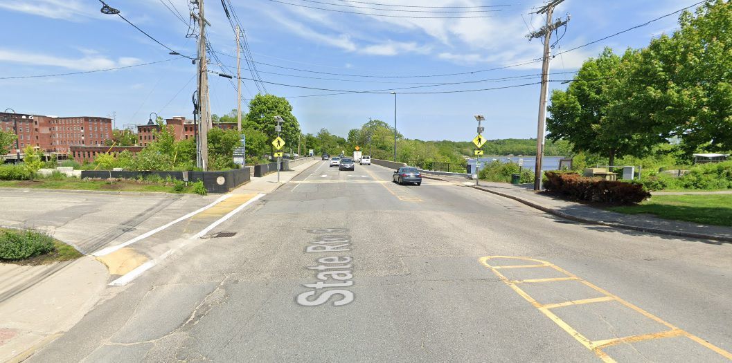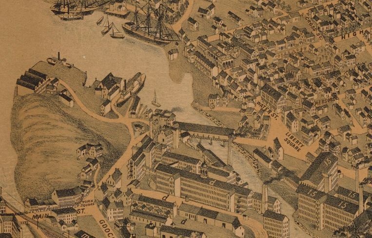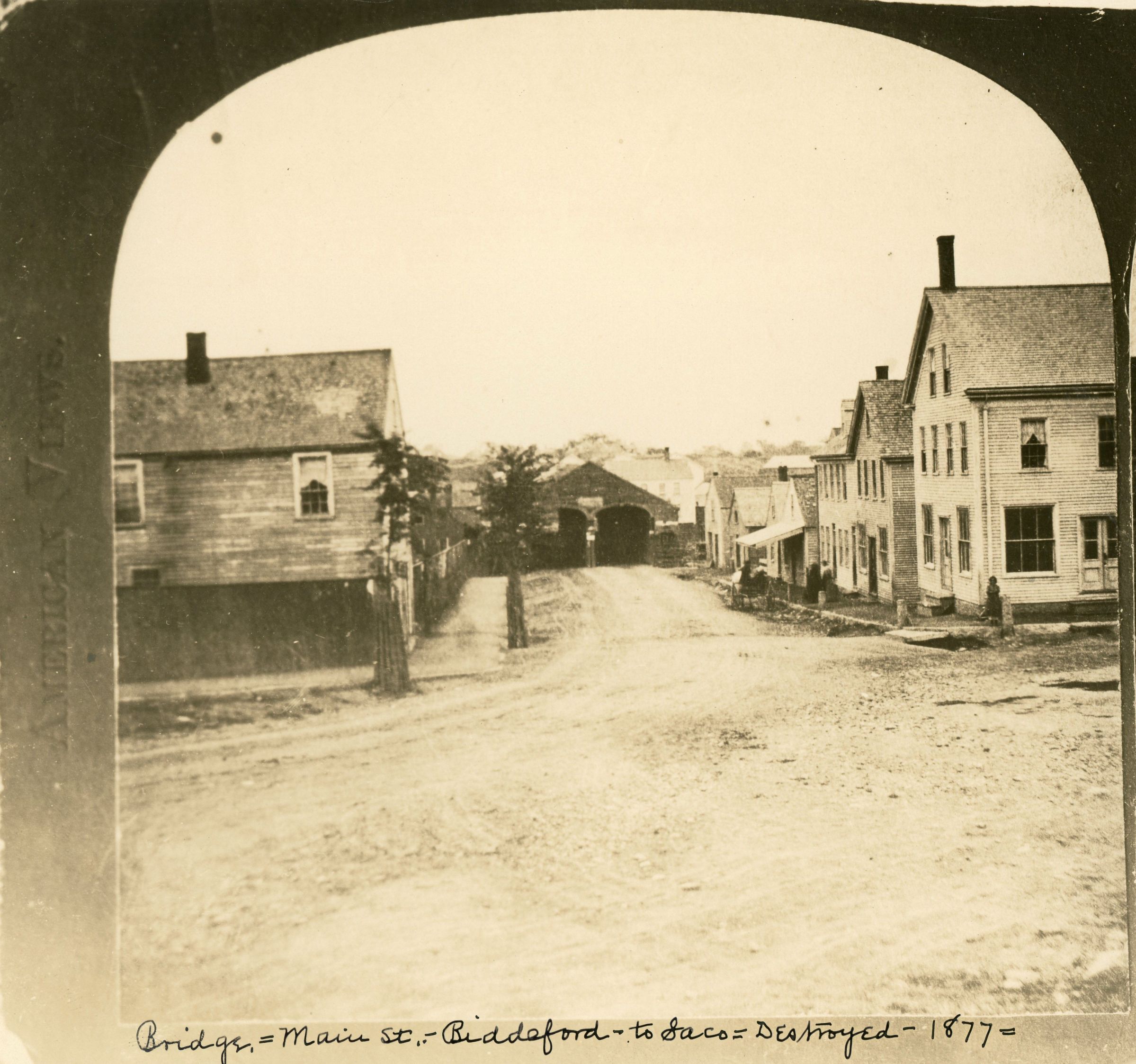 Photograph print of a stereograph card of the covered bridge on Main Street spanning from Biddeford to Factory Island. Photo taken from the Biddeford side. "Destroyed - 1877" is written on the bottom of the picture.