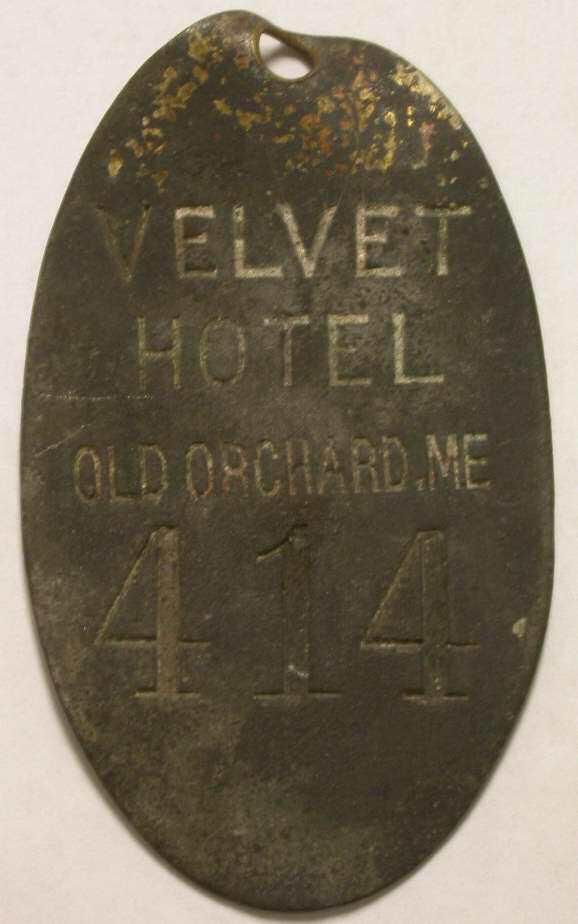Metal key chain (chain missing) for Velvet Hotel, Old Orchard Beach Maine room key, room #414 (The Velvet burned in the fire of 1907)